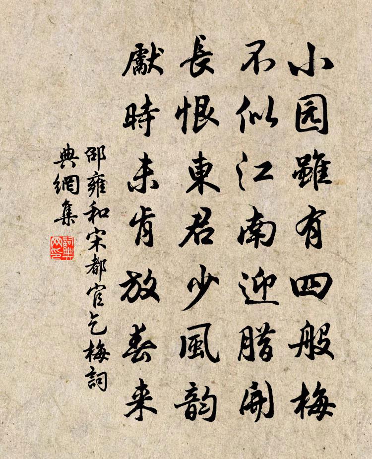 詩詞名句歷史字典書法欣賞書法字典國語詞典說文解字康熙字典古漢語字典標 題 作 者 詩 句 和宋都官乞梅作者:邵雍 朝代:宋代和宋都官乞梅原文小園雖有四般梅,不似江南迎臘開。長恨東君少風韻,先時未肯放春來。詩詞問答問:和宋都官乞梅的作者是誰?答:邵雍問:和宋都官乞梅寫於哪個朝代?答:宋代邵雍和宋都官乞梅書法欣賞和宋都官乞梅書法作品詩詞推薦雞冠花張埴〔宋代〕牆東雞冠樹,傾艷為高紅。旁出數十枝,猶欲助其雄。赬容奪朝日,桀氣矜晚風。儼如鬥勝歸,歡昂出筠籠。送周必明北上陳深〔宋代〕天寒霜霜繁,歲晏日月駛。周子何倉星,孤征詣燕薊。寥寥抱遺經,皦皦蓄幽志。青雲既交芳,白首期一試。蒼松次韻趙帥蠟梅陳造〔宋代〕窗底閒尋斷續香,帖金誰此憩風裳。漢姬懶赴昭陽燕,宮額塗成卻覆觴。水龍吟 東園醉後元好問〔金代〕兩年金鳳城邊,等閒又見東風菜。侯門慣客,東園高宴,青雲飛蓋。水上幽亭,恍然真似,闌舟同載。望紅樓翠壁寄蜀國廣濟大師齊己〔唐代〕冰壓霜壇律格清,三千傳授盡門生。禪心盡入空無跡,詩句閒搜寂有聲。滿國繁華徒自樂,兩朝更變未曾驚。終思致爽軒龐淞〔宋代〕平生珍貨不肯市,歲歲梅花伴幽獨。買鄰不用一錢費,風月逢原俱取足。薦福寺講筵偶見又別(一作別後)韓偓〔唐代〕見時濃日午,別處暮鍾殘。景色疑春盡,襟懷似酒闌。兩情含眷戀,一餉致辛酸。夜靜長廊下,難尋屐齒看。蝶戀花·上巳召親族李清照〔宋代〕永夜懨懨歡意少。空夢長安,認取長安道。為報今年春色好。花光月影宜相照。隨意杯盤雖草草。酒美梅酸,恰稱歸雁陸龜蒙〔唐代〕北走南徵象我曹,天涯迢遞翼應勞。似悲邊雪音猶苦,初背岳雲行未高。月島聚棲防暗繳,風灘斜起避驚濤。時人和潘簿旅懷虞儔〔宋代〕朔風動關塞,羈人先自知。忘情須我輩,了事豈兒痴。雁信憑誰寄,蛩吟暗自悲。遣排消底物,不飲復何為。螢丁謂〔宋代〕蘭畹炎飈息,莎階霽景涼。宵征循屋漏,晝伏避陽光。具體微雨顯,餘輝有若亡。惟憐資學者,熠燿滿紗囊。久雨有感二首梁棟〔宋代〕少年不學稼,老大生理拙。入山采黃精,窮冬一尺雪。虎狼正縱橫,原野有白骨。傷心重傷心,吾飢何足恤。挽陳建昌劉克莊〔宋代〕一麾逾嶠幾星霜,歲晚乘雲覲帝傍。方喜吾丘來春計,又聞翁子去懷章。百弓別業雖清曠,九尺長身已老蒼。原上酒席賦得匏瓢鄭審〔唐代〕華閣與賢開,仙瓢自遠來。幽林嘗伴許,陋巷亦隨回。掛影憐紅壁,傾心向綠杯。何曾斟酌處,不使玉山頹。即事蘇泂〔宋代〕群雞紛啄粟,收斂逼深秋。巷內黃葉落,門前清水流。年飢人菜色,家弊仆蓬頭。兼善平生志,淒涼出謬悠。重過鍾潭寺月灣有詩次韻徐瑞〔宋代〕五年三到此,門逕怪頻移。絕壁何年樹,空廓異代碑。微潤生古瀨,浮翠擁修眉,煮茗談時事,山僧總未知。欸乃詞蒲壽宬〔宋代〕白頭翁,白頭翁,江海為田魚作糧。相逢只可喚劉四,不受人呼劉四郎。伐檀佚名〔先秦〕坎坎伐檀兮,置之河之乾兮。河水清且漣猗。不稼不穡,胡取禾三百廛兮?不狩不獵,胡瞻爾庭有縣貆兮?彼君子憶王孫汪元量〔宋代〕鷓鴣飛上越王台。燒接黃雲慘不開。有客新從趙地回。轉堪哀。岩畔古碑空綠苔。安樂窩中吟邵雍〔宋代〕生為男子偶昌辰,安樂窩中富貴身。大字寫詩夸壯健,小杯飲酒惜輕醇。山川澄淨初經雨,草木暄妍正遇春。造化名句推薦十日雨絲風片裡,濃春艷景似殘秋。王士禎《秦淮雜詩二十首·其一》 不痴不聾,不作家翁。司馬光《資治通鑑·唐紀四十》 柳條百尺拂銀塘,且莫深青只淺黃。楊萬里《新柳》 昨夢西湖,老扁舟身世。吳文英《拜星月慢·林鐘羽姜石帚以盆蓮數十置中庭宴客其中》 秋聲萬戶竹,寒色五陵松。李頎《望秦川》 誰見汀洲上,相思愁白蘋。劉長卿《餞別王十一南遊》 委肉當餓虎之蹊,禍必不振矣!劉向《戰國策·燕三·燕太子丹質於秦亡歸》 海棠枝上立多時,飛向小橋西畔去。宋徵輿《玉樓春·燕雕樑畫棟原無數》 寒月悲笳,萬里西風瀚海沙。納蘭性德《採桑子·塞上詠雪花》 絕景良時難再並,他年此日應惆悵。劉禹錫《八月十五夜桃源玩月》
