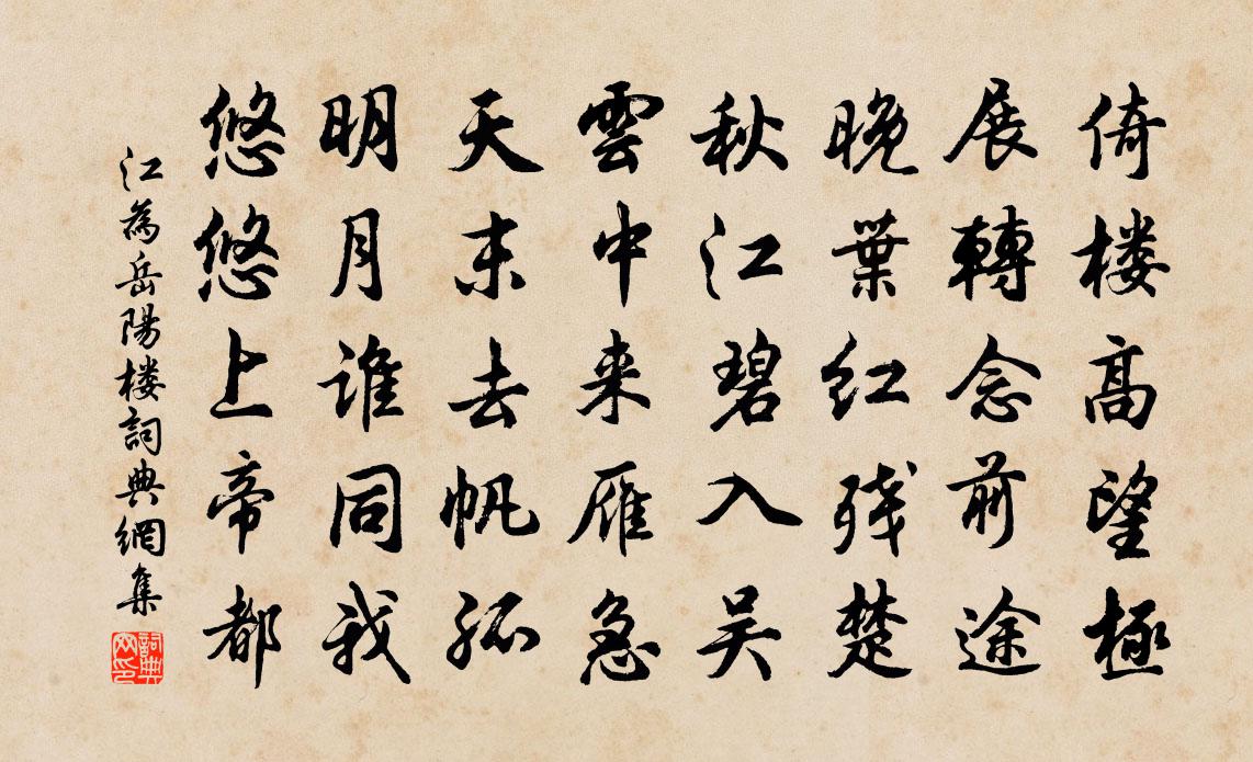 詩詞名句歷史字典書法欣賞書法字典國語詞典說文解字康熙字典古漢語字典標 題 作 者 詩 句 岳陽樓作者:江為 朝代:唐代岳陽樓原文倚樓高望極,展轉念前途。晚葉紅殘楚,秋江碧入吳。雲中來雁急,天末去帆孤。明月誰同我,悠悠上帝都。詩詞問答問:岳陽樓的作者是誰?答:江為問:岳陽樓寫於哪個朝代?答:唐代問:岳陽樓是什麼體裁?答:五律江為岳陽樓書法欣賞岳陽樓書法作品注釋全唐詩:卷741-7詩詞推薦觀烏鳶山下藤樹釋永頤〔宋代〕一株老樹蔽荒林,下有藤懸巨蟒身。幾度日斜烏鳥散,山昏鬼器斷行人。簡孫立之鄭剛中〔宋代〕無分雙清岸醉巾,蒼頭煮藥與誰親。空煩食指報珍味,阻向歌喉聽落塵。檻外寒花應照戶,座中明水定生春。仙翁捕盜偶成李若水〔宋代〕去年宋江起山東,白晝橫戈犯城郭。 * 紛紛翦草如,九重聞之慘不樂。大書黃紙飛敕來,三十六人同拜爵。獰卒讀天寶諸公事王遂〔宋代〕忠賢赴國方憂北,奸黨全身卻落南。禍福難從當世問,是非時有老農談。紙墨皆漸竭戲作陸游〔宋代〕官庫誰能餉陟厘?漢宮無復賜隃麋。不如掃盡書生事,閒伴兒童竹馬嬉。和張文彥所寄二絕王洋〔宋代〕一枝一枝復一枝,造物捷敏功不遲。驥子熊兒誰得似,它年看誦少陵詩。有感裘萬頃〔宋代〕政爾雙泉憶舊遊,柳江聞又有歸舟。誰能不作千年調,夢斷真成萬事休。傾蓋向來情莫逆,奠芻無計淚空流。重雲恭和御製賜牟子才韻宋度宗〔宋代〕視草詞臣地位高,玉堂深夜許焚膏。文華瑞世呈儀鳳,顧問承恩直禁鼇。喜有奇才追宋軾,光膺聖制勝唐綯。重修減字木蘭花呂渭老〔宋代〕明眸巧笑。坐久更宜燈燭照。小醉辭歸。懷抱明明只自知。瑣窗重見。桃李春風三月面。怎不思量。折柳孤吟斷殺清明日先勞動掛楮錢王炎〔宋代〕昔人最重去墳墓,絕喜歸來老一邱。豈是他山無筍蕨,只緣故國有松楸。百年暫住人間世,千古俱為地下游。色境遣興吳汝弌〔宋代〕弱齡性淡泊,鄭圃吾其師。及茲拙生事,窮窘常經時。無方可紆包,何以宣中懷。柴門蔽殘席,詠書倦徘徊。呼兒建炎丞相成國呂忠穆公退老堂詩二首康執權〔宋代〕公居臨海亦經年,每恨淹留阻執鞭。異縣忽聞登帥閫,此身那得侍賓筵。古今誰似功名老,出入榮持將相權。從此酹江月(和朱約山自壽曲,時壽八十四)劉辰翁〔宋代〕五朝壽俊,算生平占得、淳熙四四。三萬六千三萬了,剩有一千饒底。三百年間,和風麗日,幾個能銷此。約山山浣溪沙毛熙震〔唐代〕春暮黃鶯下砌前,水精簾影露珠懸,綺霞低映晚晴天。弱柳萬條垂翠帶,殘紅滿地碎香鈿,蕙風飄蕩散輕煙。花榭凌朝浮江旅思(一作馬周詩)韋承慶〔唐代〕天晴上初日,春水送孤舟。山遠疑無樹,潮平似不流。岸花開且落,江鳥沒還浮。羈望傷千里,長歌遣四愁。俠客行吳龍翰〔宋代〕擊築復擊築,欲歌雙淚橫。寶刀重如命,命如鴻毛輕。次韻葉秀實縣治環翠亭陳棣〔宋代〕亭高望遠破天慳,萬疊晴嵐俯仰間。著屐好追靈運逸,垂簾尤愛愷之閒。詩豪會見揮銀筆,酒聖端能倒玉山。杖履詠史上皇甫嵩陳普〔宋代〕幾多孟德總欺孤,底事山頭獨望夫。不聽閻忠聽梁衍,未應魏闕便當塗。杏花天趙長卿〔宋代〕乍涼淅淅風生幕。人獨在、朱欄翠閣。 * 信杳爐香薄。眉上新愁又覺。從前事、擬將拚卻。夢不斷、花梢柳萼。沁園春何夢桂〔宋代〕之淳,入長樂境,平諸盜、越兩旬肅清,八月朔師還。山人何某謹拜手歌沁園春持獻,以尾凱歌之後塵。詞曰袞衣名句推薦試問鄉關何處是,水雲浩蕩迷南北。趙鼎《滿江紅·丁未九月南渡泊舟儀真江口作》 玉屏風冷愁人。醉爛漫、梅花翠雲。吳文英《柳梢青·與龜翁登研意觀雪懷癸卯歲臘朝斷橋並馬之游》 鈍學累功,不妨精熟顏之推《顏氏家訓·文章篇》 一場幽夢同誰近,千古情人獨我痴。曹雪芹《紅樓夢·第五回》 民之歸仁也,猶水之就下、獸之走壙也。孟子《孟子·離婁章句上·第九節》 鄉書何處達?歸雁洛陽邊。王灣《次北固山下》 轡壓馬頭金錯落,鞍籠駝背錦斕班。金德淑《望江南·春睡起》 東山老,可堪歲晚,獨聽桓箏。葉夢得《八聲甘州·壽陽樓八公山作》 三軍可奪帥也,匹夫不可奪志也。佚名《論語十二章》 黃葉古祠寒雨積,清山荒冢白雲多。于謙《岳忠武王祠》
