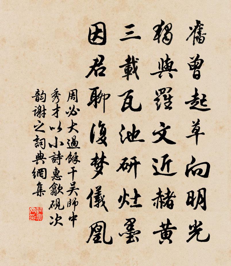 詩詞名句歷史字典書法欣賞書法字典國語詞典說文解字康熙字典古漢語字典標 題 作 者 詩 句 過餘干吳師中秀才以小詩惠歙硯次韻謝之作者:周必大 朝代:宋代原文舊曾起草向明光,獨與羅文近赭黃。三載瓦池研灶墨,因君聊復夢儀凰。詩詞問答問:《過餘干吳師中秀才以小詩惠歙硯次韻謝之》的作者是誰?答:周必大問:該詩寫於哪個朝代?答:宋代書法欣賞過餘干吳師中秀才以小詩惠歙硯次韻謝之書法作品詩詞推薦絕句二首張耒〔宋代〕風棹浮煙匝地回,雨將濃翠撲山來。晚涼樓角三吹罷,夕照江天萬里開。別崔少府高適〔唐代〕知君少得意,汶上掩柴扉。寒食仍留火,春風未授衣。皆言黃綬屈,早向青雲飛。借問他鄉事,今年歸不歸。柱笏軒周操〔宋代〕未偶凶渠那便擊,已逢昭代不須還。子猷老去身無用,拄頰朝來穩看山。嘉禾百詠天星河張堯同〔宋代〕拍岸浮春淥,菰蒲四遠生。綱羅人不到,魚鳥亦忘情。十分吟邵雍〔宋代〕人壽百來年,其過豈容易。雖然瞬息間,其間多少事。號為能了事,必先能了身。身苟未能了,何暇能了人。累日不到西園瑞香忽已爛熳韓維〔宋代〕錦官翻樣出新機,淺綠深紅各自宜。不是東風送香氣,幽花落盡有誰知。頌古二十六首釋嗣宗〔宋代〕鐵牛耕破洞中天,桃花片片出深源。秦人一去無訊息,千古峰巒色轉鮮。側犯(大石)周邦彥〔宋代〕暮霞霽雨,小蓮出水紅妝靚。風定。看步襪江妃照明鏡。飛螢度暗草,秉燭游花徑。人靜。攜艷質、追涼就槐影。和人韻贈北山僧趙師秀〔宋代〕又得相逢閒寺里,凡人多笑太無營。誰知見事心先懶,未說尋幽足已輕。二月春風添樹色,一山夜雨失泉聲。謝師比以拙詩戲調張籍不知作者已盈軸矣輒矣輒和鄭清之〔宋代〕虓虎寧如龜有知,陸行端自觸危機。縛渠呂布還須急,驅以王尋謾失威。肯使黔態呈短技,直教獵騎合邊圍。惡盈宿友人白雲庵三首釋圓悟〔宋代〕不到歲時久,生來人事疏。掃雲僧亦去,誰伴主翁居。寄賀陸翠庭遷居衛宗武〔宋代〕翠庭欲到到非難,覿面須當聽塵談。未必移家似東野,料應有宅過蘿含。幽懷萬堞塵埃隔,勝概兩湖風月涵。唐宋荊溪舟中對月吳錫疇〔宋代〕歷眼旬余半,終宵月在天。若將今歲看,僅有此番圓。寒逼鴻洲外,光搖蟻瓮邊。家山千里遠,應共一嬋娟。送范啟東牟融〔唐代〕楊柳春江上,東風一棹輕。行囊歸客興,尊酒故人情。畫史名當代,聲華重兩京。臨岐分手處,無奈別離生。游南亭夜還敘志七十韻柳宗元〔唐代〕夙抱丘壑尚,率性恣游遨。中為吏役牽,十祀空悁勞。外曲徇塵轍,私心寄英髦。進乏廓廟器,退非鄉曲豪。天命建炎庚戌潰兵狂襄漢寒食阻趨光作拜掃追慕痛張嵲〔宋代〕上庸寒食已無花,山木青青吐嫩芽。此日傷心九原路,想無雞犬只鳴鴉。春陽台陳岩〔宋代〕富貴風吹一鬨埃,春陽留得舊時台。老松偃蹇山前立,曾是昔人歌舞來。泰山李夢陽〔明代〕俯首元齊魯,東瞻海似杯。斗然一峰上,不信萬山開。日抱扶桑躍,天橫碣石來。君看秦始後,仍有漢皇台。促織杜甫〔唐代〕促織甚微細,哀音何動人。草根吟不穩,床下夜相親。久客得無淚,放妻難及晨。悲絲與急管,感激異天真。和趙保之青田即事洪咨夔〔宋代〕寶犀壓帳春風入,渴烏傳箭寒澌滴。砉然推枕起放衙,霜月滿庭鳧雁集。簿書顛倒六作五,文移縱橫一取十。精神名句推薦樹荊棘得刺,樹桃李得蔭馮夢龍《警世通言·卷十八》 飛鳥沒何處,青山空向人。劉長卿《餞別王十一南遊》 繁霜儘是心頭血,灑向千峰秋葉丹。戚繼光《望闕台》 星漢燦爛,若出其里。曹操《觀滄海 / 碣石篇》 東風有信無人見,露微意、柳際花邊。蘇軾《一叢花·今年春淺侵年》 簫鼓追隨春社近,衣冠簡樸古風存。陸游《游山西村》 驚起卻回頭,有恨無人省。蘇軾《卜運算元·黃州定慧院寓居作》 春田龜坼苗不滋,猶賴立春三日雪。王士禎《春不雨》 橫槊題詩,登樓作賦,萬事空中雪文天祥《酹江月·和友驛中言別》 碧山學士焚銀魚,白馬卻走深岩居杜甫《柏學士茅屋》