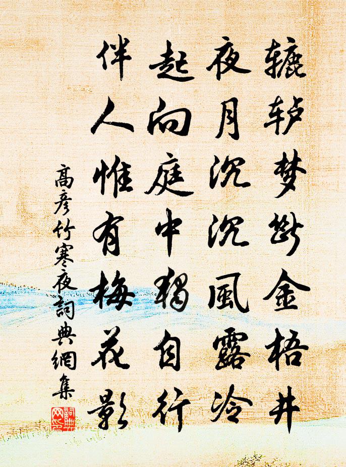 詩詞名句歷史字典書法欣賞書法字典國語詞典說文解字康熙字典古漢語字典標 題 作 者 詩 句 寒夜作者:高彥竹 朝代:宋代寒夜原文轆轤夢斷金梧井,夜月沉沉風露冷。起向庭中獨自行,伴人惟有梅花影。詩詞問答問:寒夜的作者是誰?答:高彥竹問:寒夜寫於哪個朝代?答:宋代高彥竹寒夜書法欣賞寒夜書法作品詩詞推薦醉臥松下短歌陸游〔宋代〕披鹿裘,枕白石,醉臥松陰當月夕。寒藤夭矯學草書,天風蕭森入詩律。忽然夢上百尺顛,綠毛邂逅巢雲仙。相攜賀東宮誕辰王炎〔宋代〕萬國乾符正,千齡鼎祚長。春禖膺眷顧,甲觀肇休祥。紫極聯前曜,青宮位少陽。五雲凝喜色,重 * 榮光。繼體觀文恪王公樂道院巽亭在城上下臨潩水李廌〔宋代〕氤氳蟠巽隅,崢嶸乾斗魁。蕪城佳氣緬,茂林朱檻開。竹月靜蔭扃,松風綠搖杯。開軒清流度,隱几遙山來。恪公將至官坡登一土岡望復州作張耒〔宋代〕茫茫夢澤連禾黍,斷壟橫岡散平楚。登高試望竟陵城,孤煙落日知何處。舊遊如夢去莫挽,客愁冉冉還如故。他年和黃執禮六首胡寅〔宋代〕文才久合步蟾宮,未肯爭搏九萬風。剩欲論詩宗典樂,故應憐我隸司空。高山宛在綠琴里,白髮從多清鏡中。要識寒食夜池上對月懷友雍陶〔唐代〕人間多別離,處處是相思。海內無煙夜,天涯有月時。跳魚翻荇葉,驚鵲出花枝。親友皆千里,三更獨繞池。田家行二首趙蕃〔宋代〕雨聲颯颯斷復來,間作隱隱兼出雷。田家作苦樂不哀,拔秧插田政時哉。誰知有客洞庭上,船破逢疎蔽無障。何如玉樓春莫侖〔宋代〕綠楊芳逕鶯聲小。簾幕烘香桃杏曉。余寒猶峭雨疏疏,好夢自驚人悄悄。恁君莫問情多少。門外江流羅帶繞。直饒南山羅漢贊十六首黃庭堅〔宋代〕萬山相倚碧漓岏,靈鷲一峰聖賢宅。如來往昔經行處,林泉鳥獸皆逆向。清淨眷屬千五百,無日不聞鐘磬音。閻浮旅中早秋劉威〔唐代〕金威生止水,爽氣遍遙空。草色蕭條路,槐花零落風。夜來萬里月,覺後一聲鴻。莫問前程事,颯然沙上蓬。長信宮詞陸游〔宋代〕憶年十七兮初入未央,獲侍步輦兮恭承寵光。地寒祚薄兮自貽不祥,讒言乘之兮罪釁日彰。禍來嵯峨兮勢如壞牆,觀文殿學士陳公輓詞樓鑰〔宋代〕幾見衣冠偉,終聞羽翼成。先皇崇舊學,大政任名卿。神器親傳授,崇朝再太平。功成身自退,寵利不豪輕。頌古三十八首釋從瑾〔宋代〕當面非暗投,應機皆直說。乾峰與雲門,兩口同一舌。若是續貂人,弄巧便成拙。七夕唐彥謙〔唐代〕會合無由嘆久違,一年一度是緣非。而予願乞天孫巧,五色紉針補袞衣。南歌子(荊溪寄南徐故人)趙長卿〔宋代〕春思濃如酒,離心亂似綿。一川芳草綠生煙。客里因循、重過艷陽天。屈指歸期近,愁眉淚洒然。無端還被此情牽次韻王待制游東坡留題十一絕喻良能〔宋代〕筆下無非幼婦辭,胸中端擬效安期。我生只許拜遺像,不見先生無恙時。江行陸龜蒙〔唐代〕酒旗菰葉外,樓影浪花中。醉帆張數幅,唯待鯉魚風。約潘瓜山劉學錄登高陳宓〔宋代〕聞君欲作三山客,且約先銜九日杯。莫道隔年方再會,芙蓉恰恰繞湖開。過故人陳羽山居戴叔倫〔唐代〕向來攜酒共追攀,此日看雲獨未還。不見山中人半載,依然松下屋三間。峰攢仙境丹霞上,水繞漁磯綠玉灣。卻望舍北望水鄉風物戲作絕句陸游〔宋代〕西風沙際矯輕鷗,落日橋邊系釣舟。乞與畫工團扇本,青林紅樹一川秋。名句推薦兩岸月橋花半吐。紅透肌香,暗把遊人誤。真德秀《蝶戀花·兩岸月橋花半吐》 相看兩不厭,只有敬亭山。李白《獨坐敬亭山》 曲終人醉。多似潯陽江上淚。朱敦儒《減字木蘭花·劉郎已老》 把吳鉤看了,欄桿拍遍,無人會,登臨意。辛棄疾《水龍吟·登建康賞心亭》 朔方三度重陽節,河曲乾旌歲歲忙。齊之鸞《九日登清水營城》 戍客望邊邑,思歸多苦顏。李白《關山月》 田夫荷鋤至,相見語依依。王維《渭川田家》 時見幽人獨往來,縹緲孤鴻影。蘇軾《卜運算元·黃州定慧院寓居作》 女蘿發馨香,菟絲斷人腸。李白《古意》 奸不容細,私告任坐使然也。韓非及後人《韓非子·制分》