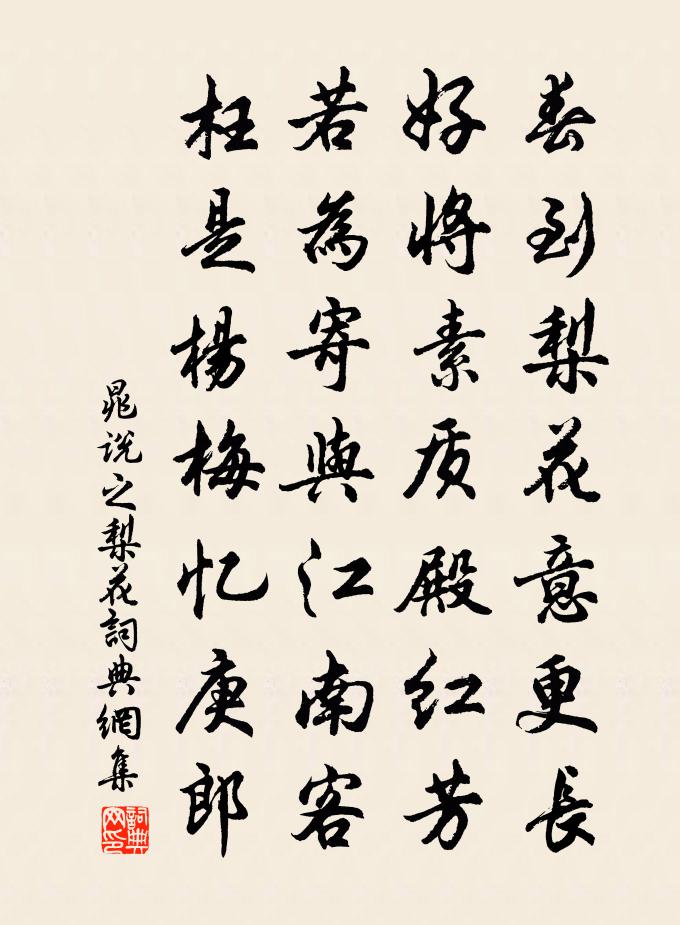 詩詞名句歷史字典書法欣賞書法字典國語詞典說文解字康熙字典古漢語字典標 題 作 者 詩 句 梨花作者:晁說之 朝代:宋代梨花原文春到梨花意更長,好將素質殿紅芳。若為寄與江南客,枉是楊梅憶庚郎。詩詞問答問:梨花的作者是誰?答:晁說之問:梨花寫於哪個朝代?答:宋代晁說之梨花書法欣賞梨花書法作品詩詞推薦銓闈董試上巳二絕洪咨夔〔宋代〕柳暗鴉嬌日正長,筆頭風雨響修廓。一簾芳碧雙蝴蝶,也解尋人姓字香。賀新郎(賦海棠)辛棄疾〔宋代〕著厭霓裳素。染胭脂、薴羅山下,浣沙溪渡。誰與流霞千古醞,引得東風相誤。從臾入、吳宮深處。鬢亂釵橫渾不胡樞橫山堂葛立方〔宋代〕朱甍碧瓦市廛遠,繞舍泉啼山復橫。勝處爭長渾仆妄,亂來有此幾卿。巳公茅屋實父子,裴氏午橋真弟兄。竟日倚頌古四十四首釋師範〔宋代〕驟馬加鞭上酒樓,何如坐地看楊州。是非長短俱裁了,鼠竊終難似狗偷。宿慈恩寺郁公房賈島〔唐代〕病身來寄宿,自掃一床閒。反照臨江磬,新秋過雨山。竹陰移冷月,荷氣帶禪關。獨住天台意,方從內請還。八聲甘州呂勝己〔宋代〕自秋來、多病意無聊,不作渭山游。想蘭菊凋疏,松筠茂密,亭館清幽。四望遙山萬疊,疊疊翠光浮。人道蓬萊島和聖俞農具詩十五首其六揚扇王安石〔宋代〕精良止如留,疏惡去如擯。如擯非爾憎,如留豈吾吝。無心以擇物,誰喜亦誰慍。翁乎勤簸揚,可使糖紕盡。奉和添酒中六詠酒槍皮日休〔唐代〕象鼎格仍高,其中不烹飪。唯將煮濁醪,用以資酣飲。偏宜旋樵火,稍近餘酲枕。若得伴琴書,吾將著閒品。漁父詞宋高宗〔宋代〕水涵微雨湛虛明,小笠輕蓑未要晴。明鑑里,縠紋生,白鷺飛來空外聲。秋懷陸游〔宋代〕獨立離人境,幽居察物情。蟻知軍陣法,蟲作緯車聲。身老惟貪睡,兒痴亦惰耕。騰騰復兀兀,何以報時平?讀開元天寶遺事一首劉克莊〔宋代〕環子受兵火涴,梅姬如玉雪清。二妃未免遺恨,三郎可煞無情。西風董嗣杲〔宋代〕大江西風三日起,激起怒濤三萬里。客子口噤悄無語,縱有高樓危莫倚。樓前禿樹剩幾葉,更有咽蟬埋葉里。大船梅落二首趙蕃〔宋代〕春風次第歸桃李,催得梅花一夜飛。時序匆匆幾回首,即看紅綻雨添肥。曉雲峰朱元升〔宋代〕旱天無覓處,曉雲此無數。只消一縷飛,亦可作甘露。頌古四十四首釋法泰〔宋代〕白紙三張通信去,展開千里卻同風。陽春轉入胡笳曲,不是風吹別調中。龍門司馬光〔宋代〕石樓臨晴空,南眺出千里。人憐山氣佳,余嘆禹功美。想彼未鑒時,極目皆洪水。誰知耕桑民,倖免魴與鯉。題吉州龍溪何敬〔唐代〕龍溪之山秀而峙,龍溪之水清無底。狂風激烈翻春濤,薄霧冥濛溢清泚。奔流百折銀河通,落花滾滾浮霞紅。四時四時田園雜興范成大〔宋代〕社下燒錢鼓似雷,日斜扶得醉翁回。青枝滿地花狼藉,知是兒童鬥草來。神光燦 贈趙先生譚處端〔元代〕趙仙入道,猛烈投玄,割除頓悟浮華。對境修持,不若火長蓮花。予今誠言少付,遇戈矛、寬納教他。若有病,便十一月十三日病後始入倉梅堯臣〔宋代〕曾非雀與鼠,何彼大食為。狐裘破不溫,黃狗補其皮。霜花逐落月,綴在枯槁枝。予年過五十,瘦寢冰生肌。名句推薦勝人者有力,自勝者強。老子《老子·道經·第三十三章》 女慕貞潔,男效才良。周興嗣《千字文·全文》 回看射鵰處,千里暮雲平。王維《觀獵》 萬事到頭都是夢,休休。明日黃花蝶也愁。蘇軾《南鄉子·重九涵輝樓呈徐君猷》 樓前柳,憔悴幾秋風。賀鑄《小重山·花院深疑無路通》 上不臣天子,下不事諸侯;慎靜而尚寬,強毅以與人,博學以知服;近文章砥厲廉隅;雖分國如錙銖,不臣不仕。戴聖《禮記·儒行》 若待得君來向此,花前對酒不忍觸。蘇軾《賀新郎·夏景》 曉風催我掛帆行,綠漲春蕪岸欲平。查慎行《曉過鴛湖》 黃師塔前江水東,春光懶困倚微風。杜甫《江畔獨步尋花·其五》 指也者,天下之所無也;物也者,天下之所有也。公孫龍《公孫龍子·指物論》