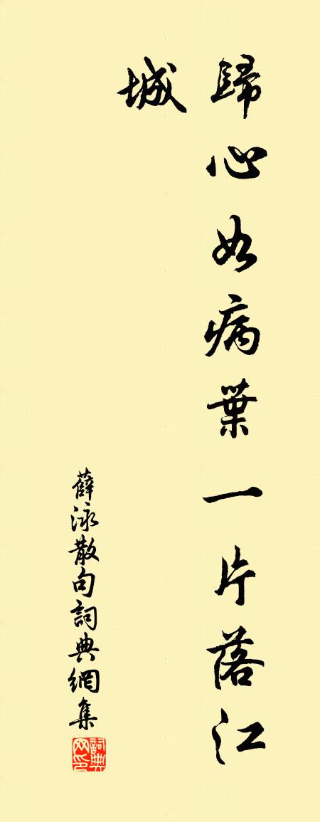詩詞名句歷史字典書法欣賞書法字典國語詞典說文解字康熙字典古漢語字典標 題 作 者 詩 句 句作者:薛泳 朝代:宋代句原文歸心如病葉,一片落江城。詩詞問答問:句的作者是誰?答:薛泳問:句寫於哪個朝代?答:宋代薛泳句書法欣賞句書法作品詩詞推薦松齋秋詠吹黃存之韻七首裘萬頃〔宋代〕牽牛引蔓上東籬,氣肅清商雨過時。人意若隨天意好,秋光又到菊花枝。雨夜達旦為蛙所聒宋庠〔宋代〕萬數嚕蛙暑雨天,此聲何必問憎憐。周公忍事腸三斗,寄怒猶燒牡菊煙。送李萬州赴饒州覲省(得西字)皇甫冉〔唐代〕前程觀拜慶,舊館惜招攜。荀氏風流遠,胡家清白齊。川回吳岫失,塞闊楚雲低。舉目親魚鳥,驚心怯鼓鼙。人稀幽居雜興真山民〔宋代〕松桂小菟裘,山扉幽更幽。蜂王衙早晚,燕子社春秋。鬢禿難庶老,心寬不貯愁。年來把鋤手,無復揖公侯。青玉案 詔赴太清宮普天醮作王處一〔元代〕上天容許清貧漢。隨處香風散。萬禍千災真不亂。寧心行教,普開心月,了悟回光看。太清宮下重遊玩。萬事俱無和微之詩二十三首。和送劉道士游天台白居易〔唐代〕聞君夢遊仙,輕舉超世雰。握持尊皇節,統衛吏兵軍。靈旗星月象,天衣龍鳳紋。佩服交帶籙,諷吟蕊珠文。閬宮次花翁喜雪快晴韻杜范〔宋代〕何人急急走靈符,扶醒摐摐十萬夫。隘巷未收穿履跡,短檐已倚曬書儒。日開雪色如翻手,景屬詩家費捻須。起望送韋中丞奉使新羅權德輿〔唐代〕淳化洽聲明,殊方均惠養。計書重譯至,錫命雙旌往。星辭北極遠,水泛東溟廣。斗柄辨宵程,天琛宜晝賞。孤光夜坐陸游〔宋代〕懷抱何蕭爽,涼風掃鬱蒸。寒蛩喧敗草,飢鼠齧枯藤。晦日宴高氏林亭高球〔唐代〕溫洛年光早,皇州景望華。連鑣尋上路,乘興入山家。輕苔網危石,春水架平沙。賞極林塘暮,處處起煙霞。挽丁知縣王柏〔宋代〕蚤識北平貴,從游五十年。遲遲登虎榜,急急到鳧仙。振起非無地,榮枯自有天。老成雕落盡,一壑鎖蒼煙。次周尚書八首許月卿〔宋代〕溫州今似古青州,溫飽能輕百戶侯。沃力泉源那擇地,歲寒砥柱屹中流。要知蟬□三公府,便是黃扉四狀頭。萬事雜詠陸游〔宋代〕世事盛衰誰得知?惠陵菸草掩柴扉。陵邊人家叢竹里,燈火喧呼迎婦歸。句尤冰寮〔宋代〕蟻返愁尋穴,鴉歸喜見巢。夜坐懷孝常周砥〔元代〕待月下石壁,罷琴竹間亭。坐絕百蟲響,旅懷才夜寧。天高玉露瀉,草木流晶熒。四山湛秋色,萬物無隱形。風蟬憶母二首釋雲岫〔宋代〕天不高兮海不深,白雲飛處定關心。蒲鞋能上時人眼,那更西風葉落金。南陽帝上各賦玉蝴蝶花一絕寇準〔宋代〕堪賞東君造化奇,裝成蝴蝶滿纖枝。粉融輕翅攢花蕊,疑是尋芳未去時。送莫內翰五首釋慧空〔宋代〕黃龍室內三關語,趙老青州一布衫。何事臨分無別說,則川龐老是同參。贈陳宗之鄭斯立〔宋代〕昔人躭隱約,屠酤身亦安。矧伊叢古書,枕藉於其間。讀書博詩趣,鬻書奉親歡。君能有此樂,冷淡世所難。我本武昌懷古宋慶之〔宋代〕極目平蕪送落暉,六朝征戰尚依稀。風生戰舸周郎過,月落南樓庾老歸。秋塞戌閒番馬病,春江流下蜀魚肥。神州名句推薦樂聽其音則知其俗,見其俗則知其化。劉安及其門客《淮南子·主術訓》 行人無限秋風思,隔水青山似故鄉。戴叔倫《題稚川山水》 斜日更穿簾幕,微涼漸入梧桐。晏殊《破陣子·燕子欲歸時節》 坐愁群芳歇,白露凋華滋。李白《秋思》 我見君來,頓覺吾廬,溪山美哉。辛棄疾《沁園春·和吳尉子似》 兩岸桃花烘日出,四圍高柳到天垂。一尊心事百年期。姜彧《浣溪沙·山滴嵐光水拍堤》 猶傶則疏之,毋使人圖之,猶疏則數之,毋使人曲之管仲《管子·侈靡》 大丈夫相時而動。曹雪芹《紅樓夢·第四回》 兼相愛,交相利。墨子《墨子·15章 兼愛(中)》 天涯也有江南信。梅破知春近。黃庭堅《虞美人·宜州見梅作》