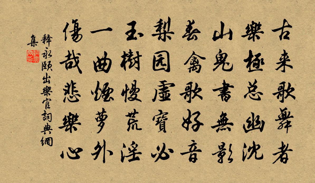 詩詞名句歷史字典書法欣賞書法字典國語詞典說文解字康熙字典古漢語字典標 題 作 者 詩 句 出樂官作者:釋永頤 朝代:宋代出樂官原文古來歌舞者,樂極總幽沈。山鬼書無影,春禽歌好音。梨園虛寶必,玉樹慢荒淫。一曲煙蘿外,傷哉悲樂心。詩詞問答問:出樂官的作者是誰?答:釋永頤問:出樂官寫於哪個朝代?答:宋代釋永頤出樂官書法欣賞出樂官書法作品詩詞推薦哭薛子舒二首劉克莊〔宋代〕忍死教磨墨,留書訣父兄。讀來堪下淚,寄去怕傷情。墓要師為志,詩於世有名。夜闌秋枕上,猶夢共山行。經費冠卿舊隱劉昭禹〔唐代〕節高終不起,死戀九華山。聖主情何切,孤雲性本閒。名傳中國外,墳在亂松間。依約曾棲處,斜陽鳥自還。即事樓鑰〔宋代〕雨外山光淡,煙中草色鮮。斷橋依古岸,流水自斜川。紫椹余桑表,青藤繞樹顛。人情兼物態,只合付天然。句李建中〔宋代〕按部先春鳳林野,寫懷空望鹿門山。青玉案(有懷軒車山舊隱)王之道〔宋代〕半年不踏軒車路。仿佛過、長橋去。貼水行雲風送度。兩行高柳,一坡修竹,是我嘗游處。黃鸝休嘆青春暮。出谷彥通叔祖約游雲水寺二首楊萬里〔宋代〕竹深草長綠冥冥,有路如無又斷行。風亦恐吾愁寺遠,殷懃隔雨送鍾聲。西歸七首次韻和泗州十五叔父七晁補之〔宋代〕古人重生男,豚酒慶親戚,桑弧射四方,言有四方役,奉璋比德性,墮地要膂力,如何晉公子,安樂忘所適,題重興寺李流謙〔宋代〕陌上橫流浸作泥,行人步陶方一移。春雲將雨繞山去,社燕營巢貼地飛。憩仆且須投古寺,閒懷猶喜論禪機。中宵溪上謠林希逸〔宋代〕溪上行吟山里應,山邊閒步溪間影。每應人語識山聲,卻向溪光見人性。溪流自漱溪不喧,山鳥相呼山愈靜。野雞病起答關景暉晁補之〔宋代〕臥病車馬絕,初非遺世人。逍遙乍形散,邂逅卻情真。見護屏能力,相扶竹亦神。閒來佐歡喜,漉酒用陶巾。次韻謝張安撫以詩送梅實項安世〔宋代〕水邊籬落數花疏,馬上行人且勿驅。一墮冰盤永相望,故人憐我誤為儒。臨安天慶陳道士游武夷贈之白玉蟾〔宋代〕七閩多山水,兩淮好風月。瀟湘之煙雲,巴廣之雨雪。春晚晁公溯〔宋代〕苔色侵階上,晴光度隙來,庭花隨鳥下,池藻逐魚開。舊國悲銅雀,新詩擬玉台。一春常道路,歸卻送春回。孤雁晁說之〔宋代〕風驅雲卷一身微,慕侶高高急急飛。未許高人能遠遁,梁王池館故同歸。和應憲使游滄浪亭韻袁說友〔宋代〕使星兩兩照前山,筆下高吟萬選錢。絕景政須終日款,茲游真可以詩傳。深得遇雨排清晝,晚日迎風浸碧煙。千載游禁苑陪幸臨渭亭遇雪應制李嶠〔唐代〕同雲接野煙,飛雪暗長天。拂樹添梅色,過樓助粉妍。光含班女扇,韻入楚王弦。六出迎仙藻,千箱答瑞年。疏影(詠梅影)王沂孫〔宋代〕瓊妃臥月。任素裳瘦損,羅帶重結。石徑春寒,碧蘚參差,相思曾步芳屧。離魂分破東風恨,又夢入、水孤雲闊。瑞鶴仙·秋感吳文英〔宋代〕淚荷拋碎璧。正漏雲篩雨,斜捎窗隙。林聲怨秋色。對小山不迭,寸眉愁碧。涼欺岸幘。暮砧催、銀屏剪尺。最無河中之水歌蕭衍〔南北朝〕河中之水向東流。洛陽女兒名莫愁。莫愁十三能織綺。十四採桑南陌頭。十五嫁為盧家婦。十六生兒字阿侯。盧家九月二十八日湖上檢校籬落范成大〔宋代〕村北村南打稻聲,荒園屐齒亦嬉晴。菊邊更覺朝陽好,松下偏聞晚吹清。一歲無非吾樂事,千金不博此間行。周遭名句推薦更落盡梨花,飛盡楊花,春也成憔悴。汪元量《鶯啼序·重過金陵》 人方為刀俎,我為魚肉司馬遷《史記·項羽本紀》 亭亭畫舸系春潭,直到行人酒半酣。鄭文寶《柳枝詞》 夜長爭得薄情知,春初早被相思染。姜夔《踏莎行·自沔東來》 春如舊。人空瘦。淚痕紅浥鮫綃透。陸游《釵頭鳳·紅酥手》 窮愁千萬端,美酒三百杯。李白《月下獨酌四首》 處所多霜雪,胡風春夏起。蔡琰《悲憤詩》 時節是重陽,菊花牽恨長。徐燦《菩薩蠻·秋閨》 侵陵雪色還萱草,漏泄春光有柳條。杜甫《臘日》 伏久者,飛必高;開先者,謝獨早。陳繼儒《小窗幽記·集醒篇》