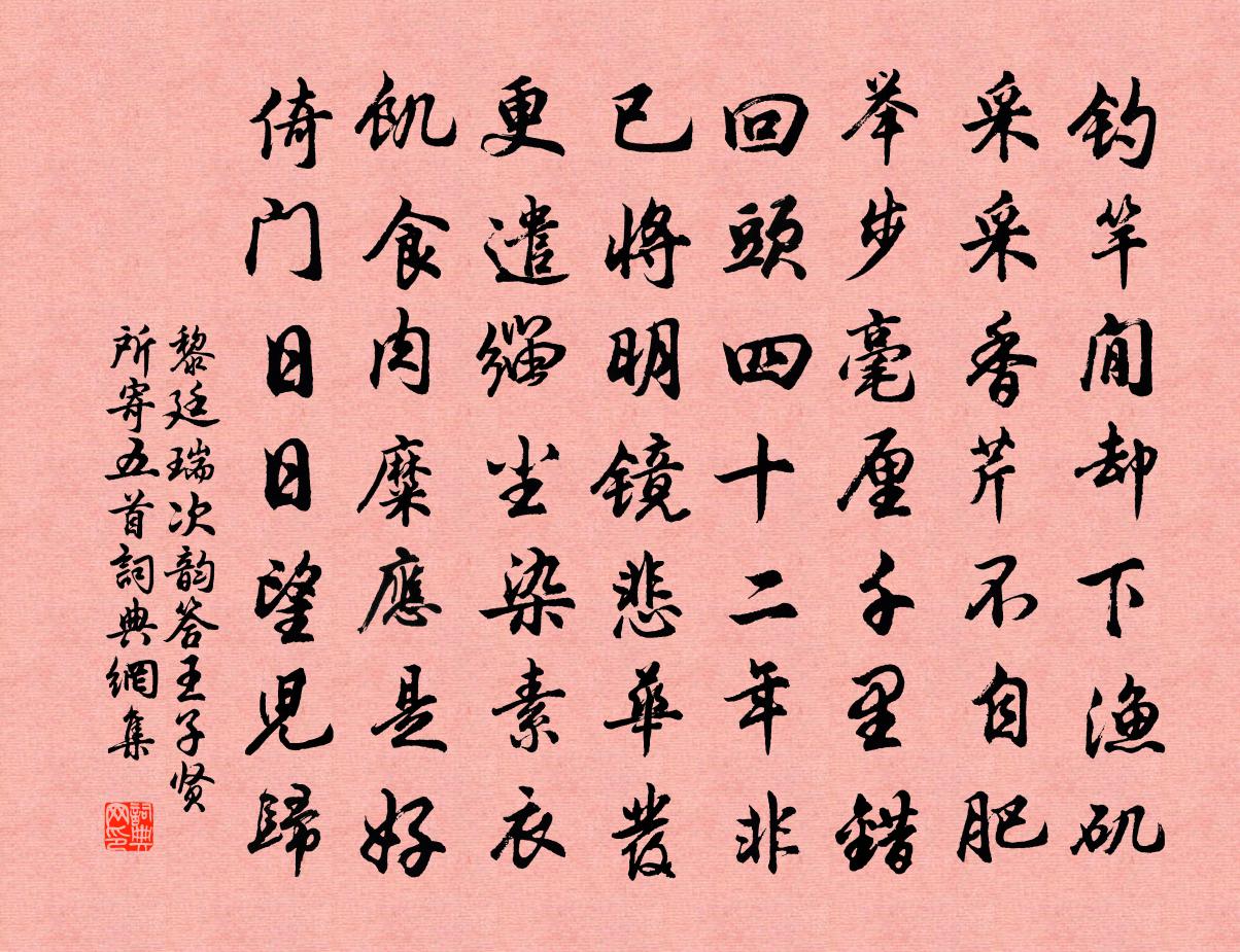 詩詞名句歷史字典書法欣賞書法字典國語詞典說文解字康熙字典古漢語字典標 題 作 者 詩 句 次韻答王子賢所寄五首作者:黎廷瑞 朝代:宋代次韻答王子賢所寄五首原文釣竿閒卻下漁磯,采采香芹不自肥。舉步毫釐千里錯,回頭四十二年非。已將明鏡悲華發,更遣緇塵染素衣。飢食肉糜應是好,倚門日日望兒歸。詩詞問答問:次韻答王子賢所寄五首的作者是誰?答:黎廷瑞問:次韻答王子賢所寄五首寫於哪個朝代?答:宋代黎廷瑞次韻答王子賢所寄五首書法欣賞次韻答王子賢所寄五首書法作品詩詞推薦頌古一百二十一首釋宗杲〔宋代〕若將此語定網宗,孤負明招獨眼龍。笑里忽分泥水路,方知千里共同風。贈天柱山昕禪老釋文兆〔宋代〕幾年天柱居,韜光外浮世。禪心混沌先,詩思雲霞際。山雪滌茶鐺,谿泉濯祖毳。富德鄙利徒,貴道輕權勢。竹牖句張釜〔宋代〕新詩滿眼費平章。謁漢高廟李百藥〔唐代〕纂堯靈命啟,滅楚餘閏終。飛名膺帝籙,沈跡韞神功。瑞氣朝浮碭,祥符夜告豐。抑揚駕人傑,叱吒掩時雄。締構寄吳沖卿二首王安石〔宋代〕平生身事略相同,三歲連牆左廄中。更得謬恩分省舍,又將衰鬢作鄰翁。聯翩久傍官槐綠,契闊今看楚蓼紅。不欲翰林權直罷歸和朱約山韻文天祥〔宋代〕閒雲舒捲無聲畫,醉石敲推一色棋。試問掛瓢棲碧洞,何如襆被臥彤闈。夢中芳草還成路,別後黃花又是時。羞殺春日即事黃庚〔宋代〕園林芳事漸闌珊,客思無聊午夢殘。紅杏花繁蜂蜜飽,碧芹香老燕泥乾。光陰有限鬢已白,勳業無楊心尚丹。倚遍感懷 其十王冕〔元代〕芳草擁幽翠,嘉樹郁層陰。山光到窗戶,禽鳥和好音。閱茲清景逾,古懷獨沈吟。沈吟奚以為?攄情委鳴琴。瓊花劉學箕〔宋代〕蕃釐觀裹舊經游,五月曾看綠葉稠。今日家園玉捕樹,春風吹夢到揚州。游漢高帝祠韓維〔宋代〕平橋架荒塹,東上大岡尾。岡頭古木合,有廟蔭其底。攝衣升殿墀,龍瘢儼當位。蝙飛畫帳喧,鼠齧珠旒墜。不知淳熙甲午東陽郡齋蘭亭方回〔宋代〕大唐天子紿孤僧,轉瞬人間幾廢興。一幅永和故繭紙,入昭陵又出昭陵。贈防江卒六首 其五劉克莊〔宋代〕戰地春來血尚流,殘烽缺堠滿淮頭。明時頗牧居深禁,若見關山也自愁。真如勸農二首吳潛〔宋代〕聖主垂衣坐九重,不才假守勸農功。周家永命由忠厚,湯後存心在困窮。安得田租成歲減,且將人事兆年豐。守宰賢者之孝二百四十首酈寄林同〔宋代〕直以劫父故,蒙他賣友名。閒將誅呂論,非勃亦非平。紀夢家鉉翁〔宋代〕秋來夜氣更清明,月朗窗虛夢不成。似報雲間仙仗過,分明聽得步虛聲。湖上感春釋行海〔宋代〕西湖二月好笙歌,游女游郎半插花。忽對春風懷故國,不知新燕入誰家。農家嘆楊萬里〔宋代〕兩月春霖三日晴,冬寒初暖稍秧青。春工只要花遲著,愁損農家管得星。壽友人周申〔宋代〕蕤賓紀月蓂初開,斗杓直指午位回。家家妝點垂門艾,兒童報導端午來。仙風偠{左亻右裊}溫瓊室,幔亭秀氣重題書齋龍輔〔宋代〕深閨漸老大,始學謝娘詩。描筆題成句,良人事作師。白頭慚卓女,團扇愧班姬。豈敢傳千載,聊將遣一時。聞蟬有感三首宋祁〔宋代〕勞君驚暮節,助我思流年。嘒若橫吹管,繁如未破弦。城殘嘶外月,林暝噪餘煙。塊坐秋風裡,潘郎鬢颯然。名句推薦日暮鄉關何處是?煙波江上使人愁。崔顥《黃鶴樓 / 登黃鶴樓》 向來吟秀句,不覺已鳴鴉。韓翃《酬程延秋夜即事見贈》 梨花自寒食,進節只愁余。楊萬里《寒食上冢》 馬逢伯樂而嘶,人遇知己而死。羅貫中《三國演義·第六十回》 以少總多,情貌無遺矣。劉勰《文心雕龍·物色》 離愁不管人飄泊。年年孤負黃花約。黃機《憶秦娥·秋蕭索》 記得去年今夕,釃酒溪亭,淡月雲來去。文徵明《念奴嬌·中秋對月》 違山十里,蟪蛄之聲,猶在於佚名《孔子家語·子路初見》 喜遇重陽,更佳釀今朝新熟。宋江《滿江紅·喜遇重陽》 月明船笛參差起,風定池蓮自在香。秦觀《納涼》