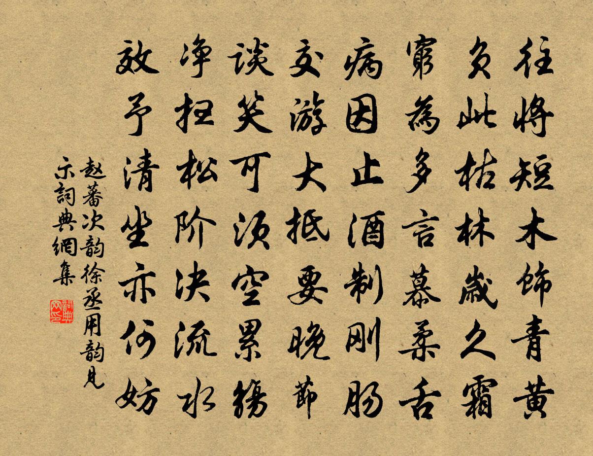 詩詞名句歷史字典書法欣賞書法字典國語詞典說文解字康熙字典古漢語字典標 題 作 者 詩 句 次韻徐丞用韻見示作者:趙蕃 朝代:宋代次韻徐丞用韻見示原文往將短木飾青黃,負此枯林歲久霜。窮為多言慕柔舌,病因止酒制剛腸。交遊大抵要晚節,談笑可須空累觴。淨掃松階決流水,效予清坐亦何妨。詩詞問答問:次韻徐丞用韻見示的作者是誰?答:趙蕃問:次韻徐丞用韻見示寫於哪個朝代?答:宋代趙蕃次韻徐丞用韻見示書法欣賞次韻徐丞用韻見示書法作品詩詞推薦與釋惠江互謔程紫霄〔唐代〕僧錄琵琶腿, ——程紫霄先生觱栗頭。 ——釋惠江鰒魚行蘇軾〔宋代〕漸台人散長弓射,初啖鰒魚人未識。西陵衰老繐帳空,肯向北河親饋食。兩雄一律盜漢家,嗜好亦若肩相差。食每寧宗郊祀二十九首學士院〔宋代〕天容澄謐,景氣晏和。瓚斝度醇,鋗璆葉歌。帝降庭止,夜其如何。神助不休,宜爾眾多。偈頌二十三首釋雲岫〔宋代〕西風凋木葉,蟋蟀啼壞牆。明月照破屋,露冷黃金床。藏經一卷,儒書一章。讀不成句,書不成行,天空地闊誰商和靖州判官陳子從山水圖十韻彭蠡歸舟魏了翁〔宋代〕外物羈縶人,無退亦無遂。愧彼自由身,朝發夕予至。溺溪流靚禪師〔宋代〕春天一夜雨滂沱,添得溪流意氣多。剛把山僧推倒卻,不知到海後如何。沁園春 仲敬吾友歸自曹南,而壽辰適至,喜劉敏中〔元代〕章,遂用其韻,俾奉觴者歌以侑歡雲萬里長風,一夕吹君,飛來自南。想江東渭北,同驚過雁,升高望遠,幾度停寄天台道友貫休〔唐代〕大是清虛地,高吟到日晡。水聲金磬亂,雲片玉盤粗。仙有遺蹤在,人還得意無。石碑文不直,壁畫色多枯。冷立傷桃源薛道士劉禹錫〔唐代〕壇邊松在鶴巢空,白鹿閒行舊徑中。手植紅桃千樹發,滿山無主任春風。壽陽罷郡日有詩十首與追懷…兼紀瑞物物。初出淝口入淮李紳〔唐代〕東風百里雪初晴,淝口冰開好濯纓。野老擁途知意重,病夫拋郡喜身輕。人心莫厭如弦直,淮水長憐似鏡清。回首用薛郎所寄示詩三韻晁公溯〔宋代〕子勿誚毛潁,渠言何使余。遙知禾白室,誰助殺青書。巴墨漆相似,蜀箋霜不如。殷勤遣分寄,吾汝與同車。題靈溪暢公墅貫休〔唐代〕境清僧格冷,新斬古林開。舊隱還如此,令人來又來。嵐飛黏似霧,茶好碧於苔。但使心清淨,從渠歲月催。思玄賦張衡〔兩漢〕衡常思圖身之事,以為吉凶倚伏,幽微難明,乃作《思玄賦》,以宣寄情志。其辭曰:仰先哲之玄訓兮,雖彌高其西使兼送孟學士南遊盧照鄰〔唐代〕地道巴陵北,天山弱水東。相看萬餘里,共倚一征蓬。 零雨悲王粲,清尊別孔融。裴回聞夜鶴,悵望待秋鴻。 鳳歸雲趙以夫〔宋代〕正愁予,可堪去馬便駢駢。擬折一枝。堤上萬垂絲。離思無邊,離席易散,落日照清漪。苦是禁城催鼓,虛床難寐侍宴長寧公主東莊應制鄭愔〔唐代〕公門襲漢環,主第稱秦玉。池架祥鱣序,山吹鳴鳳曲。拂席蘿薜垂,回舟芰荷觸。平陽妙舞處,日暮清歌續。真游覓唐輿題詩不見有懷其人八首趙蕃〔宋代〕時論歸台閣,交情異笠車。不甘腰為折,寧使鬢成華。莽莽湖之北,悠悠海一涯。銅魚偶逢使,書寄阿戎家。送客入蜀楊凝〔唐代〕劍閣迢迢夢想間,行人歸路繞樑山。明朝騎馬搖鞭去,秋雨槐花子午關。題方興化塋舍趙師秀〔宋代〕晴檐方聽夜淋浪,晚送儒臣別建章。但欲有言扶國是,不嫌無計作身防。輕舟過處猿頻斷,舊宅開時菊正黃。心事聞笛劉子翬〔宋代〕倚樓何處笛,飛響徹雲霄。曲怨吹難盡,風回聽勿遙。戍兵臨絕漠,閨婦起寒宵。一弄梅飛雪,華年鬢亦凋。名句推薦不似春風逞紅艷,鏡前空墜玉人釵。司空圖《華下對菊》 酹酒蒼茫,倚歌平遠,亭上玉虹腰冷。吳文英《十二郎·垂虹橋》 聖人不能為時,時至而弗失。劉向《戰國策·秦三·秦客卿造謂穰侯》 樹繞村莊,水滿陂塘。秦觀《行香子·樹繞村莊》 泥落畫梁空,夢想青春語。吳文英《生查子·秋社》 雙星何事今宵會,遺我庭前月一鉤。德容《七夕二首·其一》 燒痕慘澹帶昏鴉,數盡寒梅未見花。陳孚《詠永州》 燕歌未斷塞鴻飛,牧馬群嘶邊草綠。李益《塞下曲·其一》 白雲映水搖空城,白露垂珠滴秋月。李白《金陵城西樓月下吟》 恐斷紅、尚有相思字,何由見得。周邦彥《六醜·落花》