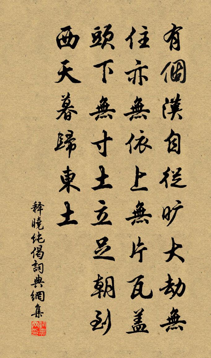 詩詞名句歷史字典書法欣賞書法字典國語詞典說文解字康熙字典古漢語字典標 題 作 者 詩 句 偈作者:釋曉純 朝代:宋代偈原文有個漢自從曠大劫,無住亦無依,上無片瓦蓋頭,下無寸土立足。朝到西天,暮歸東土。詩詞問答問:偈的作者是誰?答:釋曉純問:偈寫於哪個朝代?答:宋代釋曉純偈書法欣賞偈書法作品詩詞推薦南鄉子晏幾道〔宋代〕何處別時難。玉指偷將粉淚彈。記得來時樓上燭,初殘。待得清霜滿畫闌。不慣獨眠寒。自解羅衣襯枕檀。百媚也藍田溪雜詠二十二首晚歸鷺錢起〔唐代〕池上靜難厭,雲間欲去晚。忽背夕陽飛,乘興清風遠。江上逢進士許棠張喬〔唐代〕詩人推上第,新榜又無君。鶴髮他鄉老,漁歌故國聞。平江流曉月,獨鳥伴余雲。且了髫年志,沙鷗未可群。秦樓月/憶秦娥佚名〔宋代〕□□□。□□□□□□□。□□□。□□□□,□□□□。白鷗飛下屏山曲。行人點破秋郊綠。秋郊綠。細看重詠新秋雜題六首倚陸龜蒙〔唐代〕橘下凝情香染巾,竹邊留思露搖身。背煙垂首盡日立,憶得山中無事人。若耶溪蘇泂〔宋代〕歲月去悠悠,沙邊一線流。榮無嚴子釣,直有楚臣鉤。雨氣知魚樂,煙光驗鳥愁。餘年未可料,幾度此維舟。句盧載〔唐代〕五千里地望皆見,七十二峰中最高。吾志王禹偁〔宋代〕吾生非不辰,吾志復不卑。致君望堯舜,學業根孔姬。自為志得行,功業如臯夔。既登俊秀科,又在清切司。諫紙賦得白鷺鷥送宋少府入三峽李白〔唐代〕白鷺拳一足,月明秋水寒。人驚遠飛去,直向使君灘。和張伯子韻虞儔〔宋代〕士流競彈冠,州牧紛勸駕。器識在所先,文藝乃其亞。朅來同抱關,因得奉餘暇。軟語雜嘲謔,小酌見蘊藉。官禁集奉川道中釋文珦〔宋代〕一路盤雲遠,連朝策瘦筇。神祠依古木,佛屋占奇峰。立石分田界,疏泉作澗舂。因思似鄉土,歸意忽然濃。贈錢郎中陳造〔宋代〕刓方利祿媒,抱道俗不省。詩書工發家,孰起世儒病。錢侯挺直節,蠻徼復蘭省。劍氣夜星明,鵰翮秋霜耿。上前寄唐異山人魏野〔宋代〕不見琴書友,相思二十秋。能消幾席別,便是一生休。未得雲迎步,還應雪滿頭。何時各攜杖,竟去會嵩丘。青玉案吳文英〔宋代〕短亭芳草長亭柳。記桃葉,煙江口。今日江村重載酒。殘杯不到,亂紅青冢,滿地閒春繡。翠陰曾摘梅枝嗅。還憶西林入室歌白玉蟾〔宋代〕有一明珠光爍爍,照破三千大千國。觀音菩薩正定心,釋迦如來大圓覺。或如春色媚山河,或似秋光爽岩壑。亦名又同敖侄韻蘇頌〔宋代〕不見山翁住翠微,空傳金剎自前齊。曉猿夜鶴休驚恐,澤雉林烏自雊啼。客到上方思寄傲,僧攜素板乞留題。重尋北窗睡起陸游〔宋代〕杏梢紅濕晝初長,睡過窗間半篆香。久厭客游歸自好,本無才術老何傷。依蒲不去群魚樂,點草還驚小蝶忙。堪笑行次下渚湖二首張鎡〔宋代〕綿遷蒼岫補林空,菱荇通船萬鏡中。黃白花明如繡出,蜻蜓猶愛蓼成叢。遠遊陳必復〔宋代〕關山勞眺望,宇宙憶經行。地隔南溟斷,天低北斗橫。高譙開遠柝,孤枕歷寒更。隻影惟堪吊,殊鄉鮮弟兄。齋樓之西有木花張明中〔宋代〕密蔭繁枝覆檐額,萬蕊千葩描不得。晚風不動日微烘,游蜂成陣香成國。野花有史說山礬,尺許來高塵土間。樹頭名句推薦天時、地利、人和,三者不得,雖勝有殃。孫臏《孫臏兵法·月戰》 性靜情逸,心動神疲。周興嗣《千字文·全文》 燕山雪花大如席,片片吹落軒轅台。李白《北風行》 肅肅花絮晚,菲菲紅素輕。杜甫《春遠 / 春運》 玉不琢,不成器;人不學,不知道。戴聖《禮記·學記》 好風憑藉力,送我上青雲。曹雪芹《臨江仙·柳絮》 所謂伊人,在水一方。佚名《蒹葭》 人有所不忍,而後能及其所忍;有所不為,而後可以有為。張廷玉《明史·列傳·卷一百零四》 兼相愛,交相利。墨子《墨子·15章 兼愛(中)》 眾鳥高飛盡,孤雲獨去閒。李白《獨坐敬亭山》