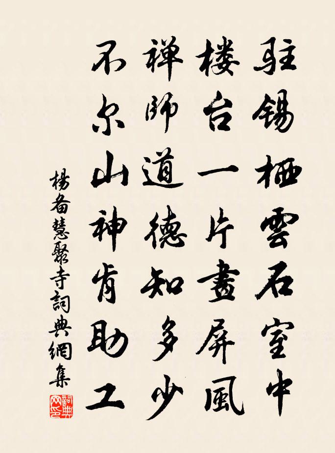 詩詞名句歷史字典書法欣賞書法字典國語詞典說文解字康熙字典古漢語字典標 題 作 者 詩 句 慧聚寺作者:楊備 朝代:宋代慧聚寺原文駐錫棲雲石室中,樓台一片畫屏風。禪師道德知多少,不爾山神肯助工。詩詞問答問:慧聚寺的作者是誰?答:楊備問:慧聚寺寫於哪個朝代?答:宋代楊備慧聚寺書法欣賞慧聚寺書法作品詩詞推薦寶學連公輓詩二首李彌遜〔宋代〕弱冠論交老更堅,平生風義想前賢。銀峰告政一千里,雁塔聯名四十年。漫許赤心酬雨露,終成白髮傲林泉。酸風移五瘟出市心釋印肅〔宋代〕助佛揚名化俗徒,遣邪歸正沃心枯,國風雅泰民歡樂,只這和瘟大丈夫。南鄉子潘熊飛〔宋代〕十日後重陽。甘菊階前滿意黃。生日無錢留賀客,何妨。尚有兒曹理壽觴。雙鬢已滄浪。休問金門與玉堂。二仲相念奴嬌(漢武巡朔方)李綱〔宋代〕茂陵仙客,算真是、天與雄才宏略。獵取天驕馳衛霍,如使鷹鸇驅雀。鏖戰皋蘭,犁庭龍磧,飲至行勳爵。中華疆東京道上口占傅諴〔宋代〕宮闕岧嶢俯碧空,九門未曉月朦朧。馬嘶南陌東風遠,回首神京一夢中。篔房秋崖來訪不相值後往謝之篔復有詩喜余之釋文珦〔宋代〕吟車曾到社橋來,不見山人乞食回。荒沼秋深蓮已謝,寒林科近菊初開。句引淵明無酒琖,觀迎元度但茶杯。尋盟雜詠六言八首劉克莊〔宋代〕龍章鳳姿中散,麞頭鼠目十郎。一遺恨悲風操,一老死偃月堂。過溪亭蘇軾〔宋代〕身輕步穩去忘歸,四柱亭前野彴微。忽悟過溪還一笑,水禽驚落翠毛衣。悼亡毛直方〔宋代〕客中自有未招魂,剪紙空教夜祭門。萬一相逢今夜夢,恨多應是兩忘言。題扇二十四首曹勛〔宋代〕燕尾溪頭晚色分,蜂腰山斷日斜曛。半篙碧靜秋垂釣,一棹黃昏冷載雲。游洞靈觀陳羽〔唐代〕初訪西城禮少君,獨行深入洞天雲。風吹青桂寒花落,香繞仙壇處處聞。寓居劉倉廨中晚步過鄭倉台上陳與義〔宋代〕紗巾竹杖過荒陂,滿面東風二月時。世事紛紛人老易,春陰漠漠絮飛遲。士衡去國三間屋,子美登台七字詩。草繞贈別王十七管記高適〔唐代〕故交吾未測,薄宦空年歲。晚節蹤曩賢,雄詞冠當世。堂中皆食客,門外多酒債。產業曾未言,衣裘與人敝。飄颻蜀公范景仁忠文公輓辭四首蘇頌〔宋代〕仁祖倦勤日,公居獻納司。累朝論國本,三接嘆忠規。未奮經綸業,空留典冊詞。二名彰美行,千古有遺思。折新荷引/折新荷趙抃〔宋代〕雨過迴廊,圓荷嫩綠新抽。越女輕盈,畫橈穩泛蘭舟。芳容艷粉,紅香透、脈脈嬌羞。菱歌隱隱漸遙,依約回眸。句陳起〔宋代〕秋雨梧桐皇子府,春風楊柳相公橋。偈釋慧遠〔宋代〕至道無難,唯嫌揀擇。但莫憎愛,洞然明白。毫釐有差,天地懸隔。慈谿龍虎軒偶成呂祖儉〔宋代〕尚書風節映鄞川,人物蕭然又幾年。世路逶迤雖已極,軒前龍虎尚依然。洞仙歌(瀘守王補之生日)黃庭堅〔宋代〕月中丹桂,自風霜難老。閱盡人間盛衰草。望中秋、才有幾日,十分圓,霾風雨,雲表常如永晝。不得文章力,白水調歌頭朱熹〔宋代〕富貴有餘樂,貧賤不堪憂。誰知天路幽險,倚伏互相酬。請看東門黃犬,更聽華亭清唳,千古恨難收。何似鴟夷子名句推薦十日春寒不出門,不知江柳已搖村。蘇軾《正月二十日往岐亭郡人潘古郭三人送余於女王城東禪莊院》 山中一夜雨,樹杪百重泉。王維《送梓州李使君》 山頭堆白雪,風裡卷黃沙。楊守禮《三月巡邊曉發夏城》 嘆十年心事,休休莫莫。吳潛《滿江紅·豫章滕王閣》 醲肥辛甘非真味,真味只是淡無味洪應明《菜根譚·概論》 他年我若為青帝,報與桃花一處開。黃巢《題菊花》 丈夫貧賤應未足,今日相逢無酒錢。高適《別董大二首》 君安游兮西入秦,願為影兮隨君身。傅玄《車遙遙篇》 土花曾染湘娥黛,鉛淚難消。納蘭性德《採桑子·土花曾染湘娥黛》 射有似乎君子。失諸正鵠,反求諸其身。子思《中庸·第十四章》