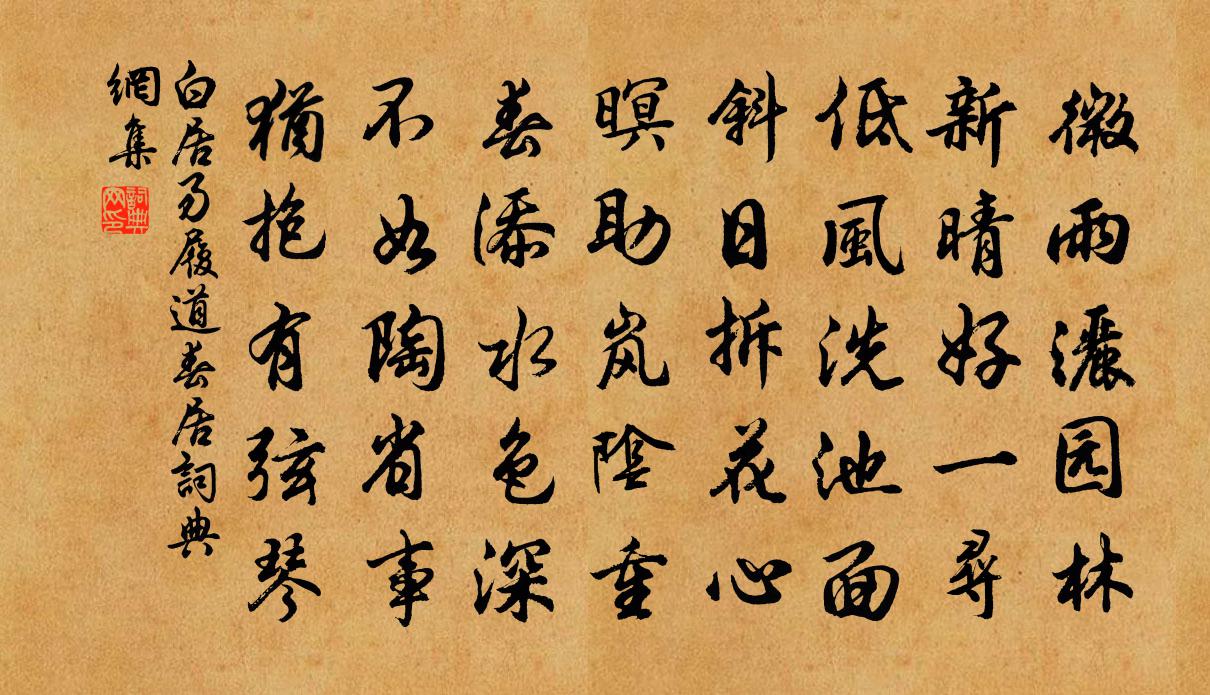 微雨灑園林,新晴好一尋。低風洗池面,斜日拆花心。