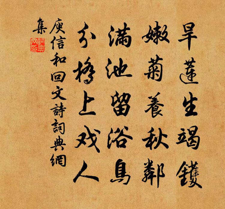 詩詞名句歷史字典書法欣賞書法字典國語詞典說文解字康熙字典古漢語字典標 題 作 者 詩 句 和迴文詩作者:庾信 朝代:南北朝和迴文詩原文旱蓮生竭鑊。嫩菊養秋鄰。滿池留浴鳥。分橋上戲人。詩詞問答問:和迴文詩的作者是誰?答:庾信問:和迴文詩寫於哪個朝代?答:南北朝問:庾信的名句有哪些?答:庾信名句大全庾信和迴文詩書法欣賞和迴文詩書法作品詩詞推薦夢遊秦宮(一作題宮門)沈亞之〔唐代〕君王多感放東歸,從此秦宮不復期。春景似傷秦喪主,落花如雨淚胭脂。李康靖少傅夫人輓詞二首梅堯臣〔宋代〕板與曾至鄭,靈輤此歸周。行哭人增慕,凝笳月正秋。九原開祔穴,故土覆新丘。歲晏寒松下,茅苫孝子留。使閩過延平劉震孫〔宋代〕川媚山輝寶氣鍾,尊堯而後幾儒宗。往來但指龍津說,不道人中自有龍。偈頌一百六十首釋宗杲〔宋代〕衲僧相見莫疑猜,布袋結頭今日開。露柱著衫南嶽去,燈籠脫帽上天台。只有雲門木上座,終年無去亦無來。有時感皇恩 與客讀辛殿撰樂府全集王惲〔元代〕幽思耿耿堂,芸香風度。客至忘言孰賓主。一篇雅唱,似與朱弦細語。恍疑南澗坐、揮談塵。霽月光風,竹君梅侶摸魚兒(邵清溪賦,效顰謾作)何夢桂〔宋代〕把心期、半生孤負。玉堂元在何處。朱弦彈絕無人聽,空操離鸞烈女。遇不遇。休更問、悠悠世事都如許。人生草題道岩二十韻黃誥〔宋代〕道士元周其姓胡,朝來遺我仙岩圖。一堆盤石東西向,鑿破混沌中心虛。欲知地面深且廣,架屋百楹端有餘。天池逍遙詠宋太宗〔宋代〕大道虛無境,信之則有靈。幽深玄妙理,運轉幾曾停。拘束從何益,周通靜杳冥。真空非作相,善應保全寧。鷓鴣天姜夔〔宋代〕憶昨天街預賞時,柳慳梅小未教知。而今正是歡游夕,卻怕春寒自掩扉。簾寂寂,月低低,舊情惟有絳都詞。芙蓉郊廟朝會歌辭方皇樂歌佚名〔宋代〕至哉坤德,萬彙資生。稱物平施,流兼變盈。禮修泰折,祭極精誠。皇皇靈睠,永奠環瀛。柳橋秋夜陸游〔宋代〕帝青萬里月輪孤,掃盡浮雲一點無。正是吾廬秋好夜,上橋渾不要人扶。以端谿硯酬張員外水精珠兼和來篇徐鉉〔唐代〕靖以端谿潤,酬君水玉明。方圓雖異器,功用信俱呈。自得山川秀,能分日月精。巾箱各珍重,所貴在交情。春晚詠懷贈皇甫朗之白居易〔唐代〕艷陽時節又蹉跎,遲暮光陰復若何。一歲中分春日少,百年通計老時多。多中更被愁牽引,少處兼遭病折磨。賴有鸚鵡曲馮子振〔元代〕逃吳辭楚無家住。解寶劍贈津父。十年間隸越鞭荊,怒卷秋江潮雨。想空城組練三千,白馬素車回去。又逡巡月上風雨葉茵〔宋代〕昨夜東風急,疏窗薦雨入。溪南梅正花,狼藉隨塵沙。皓皓多易污,不得全春華。春華能有幾,紛紛入桃李。時哉題馬當山魚望亭四首右顏魯公黃庭堅〔宋代〕不見魯公斷石,誰家為礎為槓。筆法錐沙屋漏,心期曉日秋霜。感詠十解寄呈楊安撫白玉蟾〔宋代〕風吹五花輦,露綴九光輿。夜半紅塵起,琴高失鯉魚。聞居厚得祠複次韻二首劉克莊〔宋代〕諸賢談稷下,孤士臥漳濱。母亦為投杼,兒宜勿斬輪。無書留逐客,有些吊纍臣。一室才容榻,奚煩問疾人。次韻郭帥和楊使者張茶馬溪莊詩晁說之〔宋代〕才氣雄豪夙會神,暫勞旌旆遠榮身。使華燦爛高秦嶺,筆陣縱橫落渭濱。音出瓊瑤疲諷誦,韜輕虎豹貴和親。何妨惠上人房宴別權德輿〔唐代〕方袍相引到龍華,支策開襟路不賒。法味已同香積會,禮容疑在少施家。逸民羽客期皆至,疏竹青苔景半斜。究竟名句推薦江水三千里,家書十五行。袁凱《京師得家書》 四面邊聲連角起,千嶂里,長煙落日孤城閉。范仲淹《漁家傲·秋思》 臨砌影,寒香亂、凍梅藏韻。吳文英《花犯·郭希道送水仙索賦》 勿自暴,勿自棄。聖與賢,可馴致。李毓秀《弟子規·餘力學文》 曉寒料峭尚欺人,春態苗條先到柳。毛滂《玉樓春·己卯歲元日》 逕直夫何細!橋危可免扶?楊萬里《寒食上冢》 知音如不賞,歸臥故山秋。賈島《題詩後》 清明又近也,卻天涯為客。曹組《憶少年·年時酒伴》 當斷不斷,反受其亂。司馬遷《史記·齊悼惠王世家》 嗚呼! 何時眼前突兀見此屋杜甫《茅屋為秋風所破歌》