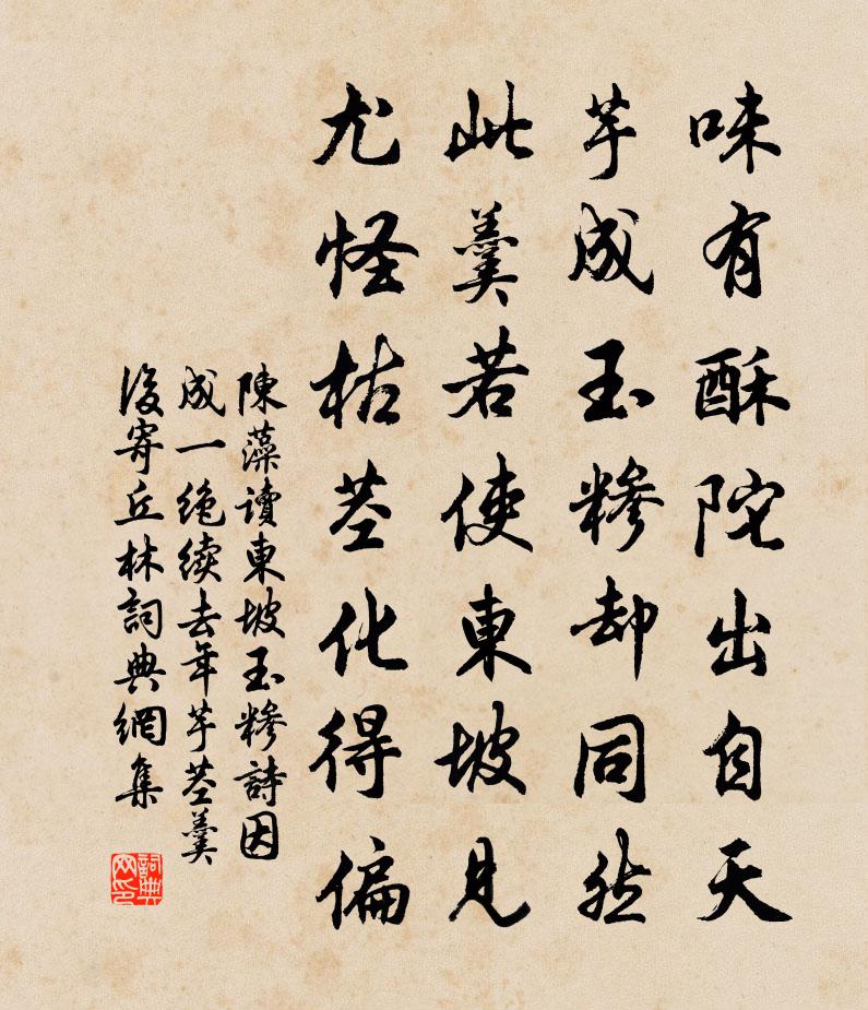 詩詞名句歷史字典書法欣賞書法字典國語詞典說文解字康熙字典古漢語字典標 題 作 者 詩 句 讀東坡玉糝詩因成一絕續去年芋莖羹後寄丘林作者:陳藻 朝代:宋代原文味有酥陀出自天,芋成玉糝卻同然。此羹若使東坡見,尤怪枯莖化得偏。詩詞問答問:《讀東坡玉糝詩因成一絕續去年芋莖羹後寄丘林》的作者是誰?答:陳藻問:該詩寫於哪個朝代?答:宋代書法欣賞讀東坡玉糝詩因成一絕續去年芋莖羹後寄丘林書法作品詩文賞析【原題】:讀東坡玉糝詩因成一絕續去年芋莖羹後寄丘林陳三友詩詞推薦與林中書李禮部同宿囊山三首劉克莊〔宋代〕儒林巨擘竹溪公,來憩棠陰訪老農。劉子前身漢中壘,李侯今代柳南宮。約靈澈共游林下,愛涅槃常坐塔中。莫把古漁父詞十二首王銍〔宋代〕萬里號風雪滿山,黃蘆晻靄水汪灣。九衢朝馬愁泥滑,不識漁翁興未閒。讀道藏葛密〔宋代〕仙莖屢隕三危露,真館常開四照花。鵲渚曉煙飛玉洞,琅池秋水接星槎。隱求齋林錫翁〔宋代〕蝸名蠅利處樊籠,世事□其轉眼空。惟有高人林下隱,只求明月與清風。遇羅員外袞黃滔〔唐代〕灞陵橋外駐征轅,此一分飛十六年。豸角戴時垂素髮,雞香含處隔青天。綺園難貯林棲意,班馬須持筆削權。可忘冬暖戴復古〔宋代〕天不雨霜雪,朝曦與暮霞。江梅遲臘蕊,岩桂更冬花。地暖宜為客,時難重憶家。楚山當晚眺,歸興逐棲鴉。菩薩蠻·晶簾一片傷心白納蘭性德〔清代〕晶簾一片傷心白,雲鬟香霧成遙隔。無語問添衣,桐陰月已西。西風鳴絡緯,不許愁人睡。只是去年秋,如何淚欲范至能游靈石錄示詩仙留題雲李洪〔宋代〕雨後泉淙水樂,詩成目送孤雲。寄興西湖南北,忘年丘壑松筠。禪人並化主寫真求贊釋正覺〔宋代〕山向岳奔,川趨海吞。船浮水柔有力,雁沒煙冷無痕。二三四七,傳持之句。百千萬億,變化之門。招手授手,知次韻元量春遊李洪〔宋代〕恰恰鶯簧百囀齊,提壺仍勸醉芳蹊。麴塵弄日腰肢弱,翠黛凝顰眉嫵低。泉石似尋天竺寺,漁舟引入武陵溪。少年烏衣巷羅必元〔宋代〕烏衣池館一時新,晉宋齊梁舊主人。無處可尋王謝宅,落花啼鳥秣陵春。春園即事王維〔唐代〕宿雨乘輕屐,春寒著弊袍。開畦分白水,間柳發紅桃。草際成棋局,林端舉桔槔。還持鹿皮幾,日暮隱蓬蒿。次韻李秬新庵晁補之〔宋代〕無心何用說心灰,庵在青蘿綠筱隈。自可談間公事了,不妨閒處道書開。更攜邀月清樽上,只著登山小屐來。桃李白都山楊修〔宋代〕駕鶴驂鸞自古聞,策名仙籍是真君。天邊舊跡無尋處,滿目青山空白雲。遇邊使盧殷〔唐代〕累年無的信,每夜夢邊城。袖掩千行淚,書封一尺情。盧秀才將出王屋高步名場江南相逢贈別杜牧〔唐代〕王屋山人有古文,欲攀青桂弄氛氳。將攜健筆乾明主,莫向仙壇問白雲。馳逐寧教爭處讓,是非偏忌眾人分。交遊贈談命嚴叔寓李長沙〔宋代〕平時已秉班揚筆,暇處不妨甘石經。吾里忻傳日邊信,君言頻中斗杓星。會稽夫子餘詩禮,巴蜀君平舊典型。歷歷呂顏野飲醉中寄五絕句次其韻李廌〔宋代〕酒在杯中惟恐盡,事來眼底只嫌多。一壺醉倒春風裡,萬斛窮愁奈我何。即事有懷二首劉宰〔宋代〕千山收宿靄,一氣藹金行。爽吹舒澄碧,晴暉麗太清。徘徊望前嶺,徒倚步南榮。為問蓴鱸客,何須身後名。午窗遣興,家人謀過石湖范成大〔宋代〕雲日初收破柱雷,小窗坐穩興悠哉!熏爐花氣朝酲解,茶鼎松風午夢回。謝客門闌風動竹,惜春時節雨肥梅。畫船名句推薦三載重陽菊,開時不在家。文森《九日》 煙柳畫橋,風簾翠幕,參差十萬人家。柳永《望海潮·東南形勝》 庭軒寂寞近清明,殘花中酒,又是去年病。張先《青門引·春思》 行人無限秋風思,隔水青山似故鄉。戴叔倫《題稚川山水》 回頭流水小橋東,煙掃畫樓出。雷應春《好事近·梅片作團飛》 先淡後濃,先疏後親,先遠後近,交友道也。陳繼儒《小窗幽記·集醒篇》 歌鐘不盡意,白日落昆明。李白《經亂離後天恩流夜郎憶舊遊書懷贈江夏韋太守良宰》 君子藏器於身,待時而動佚名《易傳·繫辭傳下·第五章》 寒眼亂空闊,客意不勝秋。楊炎正《水調歌頭·登多景樓》 夜發清溪向三峽,思君不見下渝州。李白《峨眉山月歌》