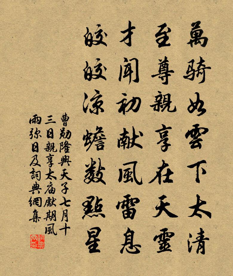 詩詞名句歷史字典書法欣賞書法字典國語詞典說文解字康熙字典古漢語字典標 題 作 者 詩 句 隆興天子七月十三日親享太廟先期風雨彌日及作者:曹勛 朝代:宋代原文萬騎如雲下太清,至尊親享在天靈。才聞初獻風雷息,皎皎涼蟾數點星。詩詞問答問:《隆興天子七月十三日親享太廟先期風雨彌日及》的作者是誰?答:曹勛問:該詩寫於哪個朝代?答:宋代書法欣賞隆興天子七月十三日親享太廟先期風雨彌日及書法作品詩文賞析【原題】:隆興天子七月十三日親享太廟先期風雨彌日及夕拔木震海窗戶俱動轉五更即止乃行禮時也喜而成三章詩詞推薦金陵雜興二百首蘇泂〔宋代〕謝公遺冢尚坡陀,絲竹中年好若何。亦到舊時攜妓處,野人行饁婦行歌。點絳唇(席間和昌甫)韓淲〔宋代〕銀筆金花,斷腸有句閒揮掃。又還落了。梅片陽春小。古往今來,風味須才調。山林少。這些襟抱。輸與江東老。和民樂梅堯臣〔宋代〕歲晚場功畢,野老相經過。有酒自斟酌,適意同笑歌。大兒緝牛衣,小兒護雞窠。囷廩見余積,息戍靡負戈。林間單父逢鄧司倉覆倉庫,因而有贈高適〔唐代〕邦牧今坐嘯,群賢趨紀綱。四人忽不擾,耕者遙相望。粲粲府中妙,授詞如履霜。炎炎伏熱時,草木無晶光。匹馬重過鴻儀寺晃沖之〔宋代〕秋色遽如許,寒林奈若何。客行傷老大,野次記經過。廢圃猶殘菊。枯池但折荷。吾生與物態,天意豈蹉跎。代人次韻曹郎中雷字二首唐士恥〔宋代〕駢羅瑟玉盡珍材,須女輝躔色為開。併合鄭鄉如旦月,鏗宏唐律過春雷。共驚高義摩雲表,定上夷庚握斗魁。鵬鷃初寒陸游〔宋代〕雨霽林猶滴,泥新路易乾。蕭條山步晚,憔悴客衣單。小女收魚笱,童兒放鴨欄。初寒豈不好,衰病自無歡。過涪州懷伊川涪翁兩先生李曾伯〔宋代〕昌黎昔作潮州游,潮人百世稱名州。又聞柳州柳子厚,柳人至今愛其柳。二公皆以人鳴唐,所至不偶為異常。卒今句祝文〔宋代〕季鷹滿眼杯傾淥,魯望長吟鬢欲斑。句釋惠崇〔宋代〕古木風煙盡,寒潭星斗深。和陶讀山海經十三首韻送機簡堂自景星岩再住吳芾〔宋代〕我與師來往,歲月雖未長。相看成二老,風流亦異常。既宴坐岩上,我方為聚糧。儻師能早歸,此樂猶示央。梅籬李龍高〔宋代〕廡下浮沈老伯鸞,樹間寂寞隱申蟠。主翁倘解憐芳潔,莫作藤蘿枳棘看。楊柳枝王哲〔元代〕一息來時流通氣*。騁風流。不來一息破胞抽。這回休。若要依前常建販,復從頭。胞兒裡面氣重收。再*僂。過小石潭梅堯臣〔宋代〕樹老石連潭,潭深煙翠入。群魚石下游,獨鳥潭上立。泉暖草長綠,山高風自急。徘徊興不窮,苔屐雲沾濕。種橘盧祖皋〔宋代〕小擘枝頭滿袖香,累累秋實正宜霜。每來長是移時去,為爾風流似故鄉。葉子山右史父宣義挽章二首呂祖謙〔宋代〕經笥深無底,高談一座傾。置身初濩落,有子晚光榮。命服鄉閭賀,安輿里巷迎。風枝何不定,忽忽到佳城。醉歌贈金元白劉子翬〔宋代〕南遊會稽今十年,重來風物皆依然。一時冠蓋零落盡,故人獨老空江邊。西陵倉曹實冗散,出無車馬眾所憐,江亭醉厭厭/南歌子賀鑄〔宋代〕紫陌青絲鞚,紅塵白紵衫。誰憐繡戶閉香奩。分付一春心事、兩眉尖。怯冷重熏被,羞明半捲簾。歡歸斜□□□□句張耒〔宋代〕逢君金華宴,正味百花仙西墅韓維〔宋代〕城居不為愜,言適西陂岡。雀噪野堂靜,雞鳴春日長。書棚落幽蠹,佛幔掩餘香。釋子廬岩至,清談殊未央。名句推薦燕燕輕盈,鶯鶯嬌軟,分明又向華胥見。姜夔《踏莎行·自沔東來丁未元日至金陵江上感夢而作》 何時一樽酒,重與細論文。杜甫《春日憶李白》 夔府孤城落日斜,每依北斗望京華。杜甫《秋興八首》 睡里消魂無說處。覺來惆悵消魂誤。晏幾道《蝶戀花·夢入江南煙水路》 新樣靚妝,艷溢香融,羞殺蕊珠宮女。趙佶《燕山亭·北行見杏花》 不知三江水,何事亦分流?陳子龍《三洲歌》 但看三五日,相見不如初。佚名《增廣賢文·上集》 將軍角弓不得控,都護鐵衣冷難著。岑參《白雪歌送武判官歸京》 柳梢聽得黃鸝語,此是春來第一聲。楊載《到京師》 羅襟濕未乾,又是淒涼雪。張淑芳《滿路花·冬》