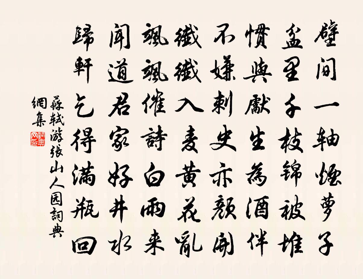 詩詞名句歷史字典書法欣賞書法字典國語詞典說文解字康熙字典古漢語字典標 題 作 者 詩 句 游張山人園作者:蘇軾 朝代:宋代游張山人園原文壁間一軸煙蘿子,盆里千枝錦被堆。慣與先生為酒伴,不嫌刺史亦顏開。纖纖入麥黃花亂,颯颯催詩白雨來。聞道君家好井水,歸軒乞得滿瓶回。詩詞問答問:游張山人園的作者是誰?答:蘇軾問:游張山人園寫於哪個朝代?答:宋代問:蘇軾的名句有哪些?答:蘇軾名句大全蘇軾游張山人園書法欣賞游張山人園書法作品注釋蘇軾詩集 卷九詩詞推薦贈故人馬子喬詩鮑照〔南北朝〕皎如川上鵠。赫似握中丹。宿心誰不欺。明白古所難。憑楹觀皓露。灑酒盪憂顏。永念平生意。窮光不忍還。淹留送程公明李新〔宋代〕解頤詩訓憶趨庭。四十專城發尚青。屈指世間無此樂,路行爭看老人星。湖上作陸游〔宋代〕耳目聰明手足輕,應酬幽事未忘情。百年日向漁樵過,千里雲從幾席生。樽酒每招鄰父共,圖書時與小兒評。但余春行洪咨夔〔宋代〕百舌梢頭一半春,日長無處著閒心。推枰競欲投機早,結眊誰知用意深。梅子胚胎鹽裹味,桐花擺布蜜邊陰。東皋舉帆松江經縣治北孫應時〔宋代〕楊柳煙中一塔孤,東風漫漫水平湖。扁舟誰倚高樓望,畫入吳淞春晚圖。次韻林明甫言志李彌遜〔宋代〕老竹抽萌便出林,焉知來者不如今。但看杞梓終成棟,不信潢污解作霖。久客謾撩蘇子恨,中流應動祖生心。乘桴元稹徐鈞〔宋代〕元和詩體夙馳聲,巧致公台只暫榮。綠野主人天下望,不應疏外負平生。荔枝龍眼二絕劉克莊〔宋代〕食觀本草豈非痴,二果甘滋可養脾。耄智自知無益處,肉身安得有輕時。德清五兄寄清茶毛滂〔宋代〕玉角蒼堅已照人,冰肝寒潔更無塵。鳳凰雨露生珍草,不比榛蕪亦漫春。漁父詠 贈友人 此首原誤作漁家傲王哲〔元代〕名宦為鹽判。室內同公案。閒心各一半贊。分過如何斷。好將雲水伴。夫婦山頭看。清風明月喚玩。結就無涯算。次韻弟師白至日及弄璋之什二首黃公度〔宋代〕時序鄉心破,煙波眼力催。城頭烏信喜,海上雁書來。一別壺山月,三看庾嶺梅。天涯椒桂酒,淚墮伯仁杯。和若夫韻二首吳芾〔宋代〕老夫吟詠本非長,僻性年來忽異常。唯是平生愛風月,致令清夜夢池塘。正慚遣與非工部,卻喜言詩有卜商。佳句南歌子(楚守周豫出舞鬟,因作二首贈之)蘇軾〔宋代〕紺綰雙蟠髻,雲欹小偃巾。輕盈紅臉小腰身。疊鼓忽催花拍、斗精神。空闊輕紅歇,風和約柳春。蓬山才調最清新黃匯征以石草蒲一本相遺石圓而蒼小竅數十大鄭剛中〔宋代〕細腰結垂窠,藏精事生育。兒已傅翼飛,孤懸尚憑屋。水仙脫霓裳,美實青如簇。實盡秋房枯,眾竅存虛目。何人元和癸巳余領蜀之七年奉詔征還…途經百牢關因題石門洞武元衡〔唐代〕昔佩兵符去,今持相印還。天光臨井絡,春物度巴山。鳥道青冥外,風泉洞壑間。何慚班定遠,辛苦玉門關。陳倅寄惠四詩用昌黎和裴相韻愧不能當也走筆曹彥約〔宋代〕近來人物眇江東,況也書生責勇功。痛定卻思三策謬,歸來猶想萬山崇。誰從荀伯官寮晨,賦入昌黎句法中。戎事代淮南鮑照〔南北朝〕淮南王。好長生。服食鍊氣讀仙經。琉璃藥椀牙作盤。金鼎玉匕合神丹。合神丹。戲紫房。紫房彩女弄明璫。鸞歌游梅坡席上雜酬李彌遜〔宋代〕得路山方盡,如歸館暫投。春風供笑傲,一醉豈人謀。祝英台近佚名〔宋代〕剪酴醿、移紅藥,深院教鸚鵡。消遣宿酲,敧枕熏沈炷。自從載酒西湖,探梅南浦,久不見、雪兒歌舞。恨無據。新柳薛能〔唐代〕輕輕須重不須輕,眾木難成獨早成。柔性定勝剛性立,一枝還引萬枝生。天鍾和氣元無力,時遇風光別有情。誰道名句推薦十年花骨東風淚,幾點螺香素壁塵。史達祖《鷓鴣天·搭柳欄乾倚佇頻》 才道莫傷神,青衫濕一痕。納蘭性德《菩薩蠻·新寒中酒敲窗雨》 君埋泉下泥銷骨,我寄人間雪滿頭。白居易《夢微之》 會稽愚婦輕買臣,余亦辭家西入秦。李白《南陵別兒童入京》 長恨人心不如水,等閒平地起波瀾。劉禹錫《竹枝詞九首·其七》 零落棲遲一杯酒,主人奉觴客長壽。李賀《致酒行》 犬吠水聲中,桃花帶露濃。李白《訪戴天山道士不遇》 寵柳嬌花寒食近,種種惱人天氣。李清照《念奴嬌·春情》 蛾眉淡了教誰畫?瘦岩岩羞戴石榴花。關漢卿《大德歌·夏》 丈夫貧賤應未足,今日相逢無酒錢。高適《別董大二首》