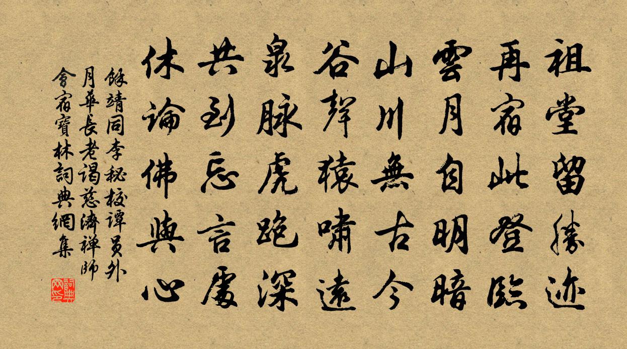 詩詞名句歷史字典書法欣賞書法字典國語詞典說文解字康熙字典古漢語字典標 題 作 者 詩 句 同李秘校譚員外月華長老謁慈濟禪師會宿寶林作者:余靖 朝代:宋代原文祖堂留勝跡,再宿此登臨。雲月自明暗,山川無古今。谷聲猿嘯遠,泉脈虎跑深。共到忘言處,休論佛與心。詩詞問答問:《同李秘校譚員外月華長老謁慈濟禪師會宿寶林》的作者是誰?答:余靖問:該詩寫於哪個朝代?答:宋代書法欣賞同李秘校譚員外月華長老謁慈濟禪師會宿寶林書法作品詩文賞析【原題】:同李秘校譚員外月華長老謁慈濟禪師會宿寶林道場詩詞推薦元宵詞二首黃彥輝〔宋代〕鰲頭移得山三島,月下傳來燈萬枝。香陌馬嘶紅萼錦,翠樓人倚綠楊眉。呈莫大猷令趙蕃〔宋代〕入境能知政,昔聞今信然。吾行萬安道,頗識令君賢。阡陌東西隔,人家遠近連。針青秧出水,穗長麥搖煙。犬吠滿庭芳如愚居士〔宋代〕吾乃當塗,棄儒奉道,遵行聖誨多年。已逾三紀,截滅六塵緣。因習業、自營度日,未嘗謁見豪賢。般若力,掀翻春日登大悲閣二首錢惟治〔宋代〕裊霞披迥殿,香霧擁輕簾。曉花歌靜院,芳樹捧晴簷。朝中措 夜深殘月過山房辛棄疾〔宋代〕夜深殘月過山房。睡覺北窗涼。起繞中庭獨步,一天星鬥文章。朝來客話,山林鍾鼎,那處難忘。君向沙頭細問,華山題王母祠李商隱〔唐代〕蓮華峰下鎖雕梁,此去瑤池地共長。好為 * 到東海,勸栽黃竹莫栽桑。無題李溟〔唐代〕喬木掛斗邑,水驛壞門開。向月片帆去,背雲行雁來。晚年名利跡,寧免路岐哀。前計不能息,若為玄鬢回。題倪處士舊居許渾〔唐代〕儒翁九十餘,舊向此山居。生寄一壺酒,死留千卷書。檻摧新竹少,池淺故蓮疏。但有子孫在,帶經還荷鋤。題道靜院院在中條山故王顏中丞所置虢州刺史…寫真存焉李商隱〔唐代〕紫府丹成化鶴群,青鬆手植變龍文。壺中別有仙家日,嶺上猶多隱士雲。獨坐遺芳成故事,褰帷舊貌似元君。自憐白河逢雁劉敞〔宋代〕白河見歸雁,顧我影徘徊。憶昔從此逝,相看經歲回。春生聊自樂,鄉近不須哀。為問經南國,能無尺素來。村中閒步劉得仁〔唐代〕閒共野人臨野水,新秋高樹掛清暉。不知塵里無窮事,白鳥雙飛入翠微。送陸太祝赴湖南幕同用送字(三韻)權德輿〔唐代〕不憚征路遙,定緣賓禮重。新知折柳贈,舊侶乘籃送。此去佳句多,楓江接雲夢。登山頂高輔堯〔宋代〕由徑尋山路,登臨步步疑。縱高終帶險,任達亦須危。況是多防地,那堪獨力時。荊榛方櫛比,直道擬奚為。昭君怨二首張祜〔唐代〕萬裡邊城遠,千山行路難。舉頭唯見日,何處是長安。漢庭無大議,戎虜幾先和。莫羨傾城色,昭君恨最多。送梅子明通判餘杭張耒〔宋代〕東南山水窟,錢塘吳越都。吾人神仙后,厭直承明廬。一舸去莫挽,落帆風月湖。蹁躚青衿子,能誦先生書。借問子楚小甑中實以物餉予{稻禾換口}之如芋而味王洋〔宋代〕君不見野人謀食搜山谷,不似輸錢買金粟。醾薇細瑣俱見情,豈有靈根不收錄。少陵飢走偏九州,命寄長鑱生事足賞海棠三絕范成大〔宋代〕憶向宣華夜倚闌,花光妍暖月光寒。如今蹋颯嫌風露,且只銅瓶滿插看。阮郎歸(送客歸來道中再得數語)魏了翁〔宋代〕驪駒未撤客乘鞍。征鞭搖晚寒。雁邊酲夢角驚殘。關山斜日邊。求道地,托恩天。人情久亦安。轉移都在笑顰間。詠梅五十首呈史尚書釋紹嵩〔宋代〕不隨桃李待春回,不待商量細細開。要識此花奇絕處,月明溪影亂氈毸。池亭夏晝陸游〔宋代〕茅舍蘆藩枕小灘,蕭林那復畏炎官。醉床酒解香初過,嬾架書橫夢未殘。饞愛流匙菰米滑,渴滿便杓粟漿酸。兒孫名句推薦偷彈清淚寄煙波,見江頭故人,為言憔悴如許。袁去華《劍器近·夜來雨》 上邪,我欲與君相知,長命無絕衰。佚名《上邪》 但使情親千里近,須信。無情對面是山河。辛棄疾《定風波·席上送范廓之游建康》 芳樹籠秦棧,春流繞蜀城。李白《送友人入蜀》 白日登山望烽火,黃昏飲馬傍交河。李頎《古從軍行》 我亦且如常日醉,莫教弦管作離聲。歐陽修《別滁》 冰肌玉骨,自清涼無汗。蘇軾《洞仙歌·冰肌玉骨》 種田不熟不如荒,養兒不肖不如無。馮夢龍《醒世恆言·卷十七》 庭前時有東風入,楊柳千條盡向西。劉方平《代春怨》 道同方獲其利,道異惟受其害。來俊臣《羅織經·察奸卷第八》