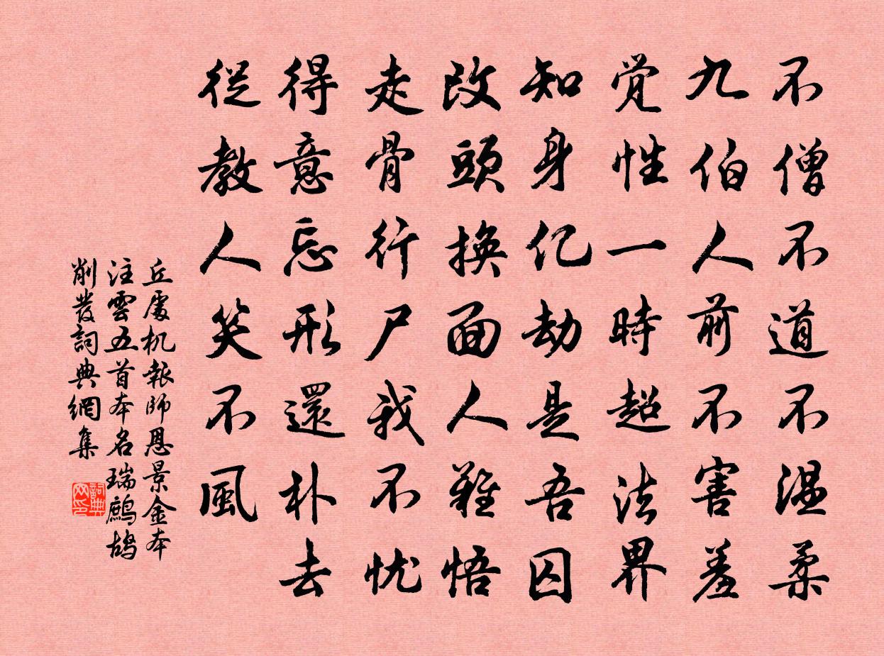 詩詞名句歷史字典書法欣賞書法字典國語詞典說文解字康熙字典古漢語字典標 題 作 者 詩 句 報師恩 景金本注云,五首本名瑞鷓鴣 削髮作者:丘處機 朝代:元代原文不僧不道不溫柔。九伯人前不害羞。覺性一時超法界。知身億劫是吾囚。改頭換面人難悟,走骨行屍我不憂。得意忘形還朴去,從教人笑不風詩詞問答問:《報師恩 景金本注云,五首本名瑞鷓鴣 削髮》的作者是誰?答:丘處機問:該詩寫於哪個朝代?答:元代問:該詩是什麼體裁?答:詞書法欣賞報師恩 景金本注云,五首本名瑞鷓鴣 削髮書法作品詩詞推薦延平次趙糾曹韻十四首紫氣陳宓〔宋代〕三尺有正氣,外邪何可乾。功用雖未見,韜藏誰將看。點絳唇·一夜東風曾允元〔宋代〕一夜東風,枕邊吹散愁多少。數聲啼鳥。夢轉紗窗曉。 來是春初,去是春將老。長亭道。一般芳草。只有歸時好南浦別白居易〔唐代〕南浦淒淒別,西風裊裊秋。一看腸一斷,好去莫回頭。長風紙平渡王子俊〔宋代〕剪紙鋪平江,雁飛暈字雙。秋山青隔岸,誰啟讀書窗。春日五首楊時〔宋代〕春深不見鷅鶹,百舌時聞自在鳴。獨步移床臥深屋,細看新燕巧經營。五更仇遠〔宋代〕山寺鐘未鳴,城樓角已奏。角聲正可聽,欹枕續殘漏。送梁尚書移守宛陵林季仲〔宋代〕堂堂體貌照簪纓,天與君王佐太平。拭眼待看蕭相國,舉杯且屬謝宣城。花間未聽歌聲徹,笛里先催別恨生。說與游石角過小嶺至長烏村柳宗元〔唐代〕志適不期貴,道存豈偷生。久忘上封事,復笑升天行。竄逐宦湘浦,搖心劇懸旌。始驚陷世議,終欲逃天刑。歲月題贈南台山院主吉大師金君卿〔宋代〕三紀修行箬笠僧,布衣襤褸發鬅鬙。邑人與卜幽棲處,象法能通最上乘。常宿靈喦敲玉磬,旋營精剎布金繩。江西和通判直閣立春聞鶯姚勉〔宋代〕寂寂江城真又春,土牛何物竟無神。試傾官酒梅花畔,不似園丁菜把新。彩勝豈留良夜夢,紙窗靜拂隔年塵。東風集英殿賜百官宴以雨放梅堯臣〔宋代〕春來無點雨,三月始聞雷。曉殿鳴檐急,群公罷食回。燕迎風翅健,馬踏霧泥開。晚覺微陽透,飛光上綠槐。贈一壺天李日者文天祥〔宋代〕汝南市人眼,壺小天地大。誰知賣藥翁,壺寬天地隘。李君血肉身,大化中一芥。天度三百餘,滿腔粲蓍蔡。仙翁監試衛通判送桂花一枝得四絕句以謝王邁〔宋代〕花映眉間一點黃,笑將文字共平章。高枝定不輕分付,自有花為知見香。晚晴陸游〔宋代〕雨如塵點送新涼,雲作魚鱗襯夕陽。蓬戶清閒貧亦好,筍輿安穩病何傷?曾公卷育陳子南昭亭詩因次韻吳則禮〔宋代〕君不見唐時畫馬曹將軍,肯道江都也絕倫。又不見即今陳郎論句法,頭頭未背少陵人。往時屢費曾郎酒,作意澆潑挽柳齋陳公四首劉克莊〔宋代〕夾輔曾調鼎,分憂屢建牙。虜猶聞范老,盜亦說宗爺。公晚參黃檗,人痴望白麻。臨歧卻葷茹,應怕念頭差。病中雜詠十首陸游〔宋代〕天遠不可問,將如此老何!老驚詩思退,貧欠藥錢多。剡縣尋僧宿,桐江買酒歌。市橋新柳色,又是一年過。清夜吟邵雍〔宋代〕月到天心處,風來水面時。一般清意味,料得少人知。謁束先生廟李若水〔宋代〕弔古懷騷人,接轡黃榆路。疏風吹廣原,馬首飛埃度。荒祠止道旁,古人寒鴉聚。入門煙素橫,虛壁丹青污。再拜七松亭張喬〔唐代〕七松亭上望秦川,高鳥閒雲滿目前。已比子真耕谷口,豈同陶令臥江邊。臨崖把卷驚回燒,掃石留僧聽遠泉。明月名句推薦颯颯西風滿院栽,蕊寒香冷蝶難來。黃巢《題菊花》 剩水殘山無態度,被疏梅料理成風月。辛棄疾《賀新郎·把酒長亭說》 微風搖紫葉,輕露拂朱房。沈約《詠芙蓉》 新豐美酒斗十千,鹹陽遊俠多少年。王維《少年行四首》 吏呼一何怒,婦啼一何苦。杜甫《石壕吏》 極陽以殺,極陰以生佚名《黃帝四經·經法·四度》 相望試登高,心隨雁飛滅。孟浩然《秋登蘭山寄張五》 雁濕行無次,花沾色更鮮。李世民《詠雨》 甚愛必大費;多藏必厚亡。故知足不辱,知止不殆,可以長久。老子《老子·德經·第四十四章》 送行無酒亦無錢,勸爾一杯菩薩泉。蘇軾《武昌酌菩薩泉送王子立》