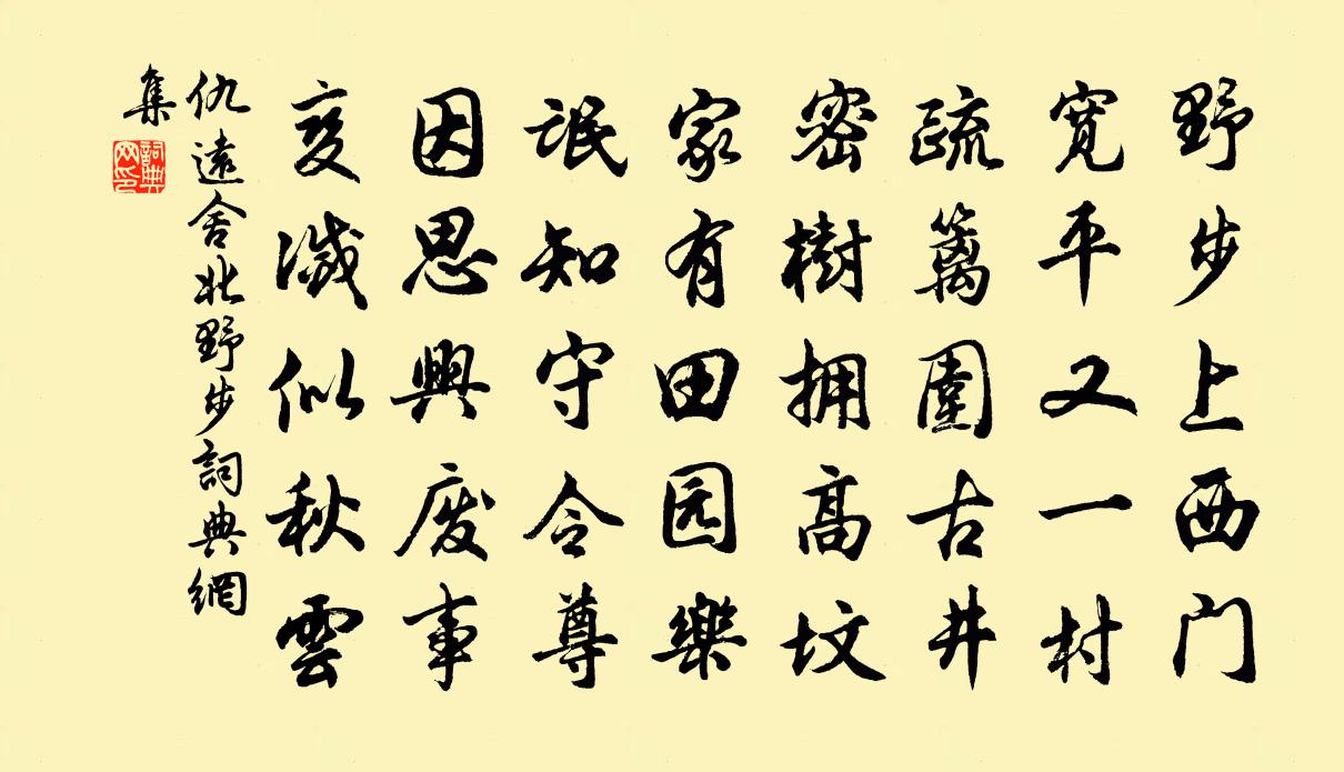 詩詞名句歷史字典書法欣賞書法字典國語詞典說文解字康熙字典古漢語字典標 題 作 者 詩 句 舍北野步作者:仇遠 朝代:宋代舍北野步原文野步上西門,寬平又一村。疏籬圍古井,密樹擁高墳。家有田園樂,氓知守令尊。因思興廢事,變滅似秋雲。詩詞問答問:舍北野步的作者是誰?答:仇遠問:舍北野步寫於哪個朝代?答:宋代仇遠舍北野步書法欣賞舍北野步書法作品詩詞推薦夜分趙希邁〔宋代〕夜分天籟寂,誰與共襟期。童子醉眠處,老夫吟苦時。雲黏蒼蘚石,月掛老松枝。一鶴來何處,相從立水湄。宮詞張公庠〔宋代〕楊花飛去落誰家,紫禁人閒惜歲華。謾向園林覓春色,折殘枝上兩三花。水龍吟 郭宣徽善甫開宴娛賓,命樂工郭仲禮王惲〔元代〕音弱弱,宛猶在耳,且有衰年情之感。明日嚴甫修撰為求樂府,賦越調以歌年情鄉之感。明日嚴甫修撰為求樂府,月華崧上人之杭釋惟一〔宋代〕月華如水夜沉沉,一曲簫韻韻更清。曲罷莫言無覓處,西湖後夜轉堪聽。散步後園曾豐〔宋代〕簿書不放出公出,飯罷舂容步後園。燕子方歸猶認主,竹君未老已生孫。姚王泣雨淚含怨,望帝啼風聲帶冤。新舊己已秋七月不雨人心焦然乃戊午齋宿致城隍清牟巘五〔宋代〕休休早稻已焦卷,晚稻搖風更可憐。枯盡百源無一滴,老龍何處捲雲眠。桂殿秋劉翰〔宋代〕青帝子,碧蓮宮。不駕雲車騎白龍。瑤池路遠羽衣濕,玉珮泠泠明月中。偈頌一百二十三首釋崇岳〔宋代〕仰面不見天,低頭不見地。吃飯了噇眠,聖諦第一義。重陽即事程公許〔宋代〕爛漫三年藥市游,飢驅忽到字江頭。淒涼風色欄乾暮,靉靆晴雲{禾罷}稏秋。紅葉不知人恨遠,黃花慣與客供愁甲申歲作楊冠卿〔宋代〕急雨來排難,余蒸頓解嚴,時蜩鳴露柳,客燕度風簾。屈指秋無幾,安心氣自恬。夜涼都不寐,落月瑩虛檐。暮秋枉裴道州手札,率爾遣興,寄近呈蘇渙侍御杜甫〔唐代〕久客多枉友朋書,素書一月凡一束。虛名但蒙寒溫問,泛愛不救溝壑辱。齒落未是無心人,舌存恥作窮途哭。道州秋熱憶舊遊二首劉克莊〔宋代〕塞上秋光冷似冰,當年豪舉氣憑陵。打球不用炎方馬,按獵初調異國鷹。山寨淒涼聞戌鼓,水村搖落見漁燈。而今木蘭花慢(用前韻呈王信父)張炎〔宋代〕江南無賀老,看萬壑、出清冰。想柳思周情,長歌短詠,密與傳燈。山川潤分秀色,稱醉揮、健筆剡溪藤。一語不過裴舍人故居劉長卿〔唐代〕慘慘天寒獨掩扃,紛紛黃葉滿空庭。孤墳何處依山木,百口無家學水萍。籬花猶及重陽發,鄰笛那堪落日聽。書幌石湖寺 其二王冕〔元代〕相憶懸清夢,相過笑白頭。不因吾道重,安得為茲留?翠竹邊江雨,黃花小院秋。明年春水足,準擬泛扁舟。五泄山三學院十題石屏釋鹹潤〔宋代〕峭石狀危屏,截斷諸峰青。白雲觸不飛,仙掌空遺名。失調名蘇軾〔宋代〕高安更過幾重山。下第後病中陸暢〔唐代〕獻玉頻年命未通,窮秋成病悟真空。笑看朝市趨名者,不病那知在病中。武侯廟(廟在白帝西郊)杜甫〔唐代〕遺廟丹青落,空山草木長。猶聞辭後主,不復臥南陽。神君歌十首劉克莊〔宋代〕咚咚街鼓動,寂寂市聲稀。祭罷社人散,老巫懷肉歸。名句推薦薊城通漠北,萬里別吾鄉。李頎《古塞下曲》 為者敗之,執者失之。老子《老子·道經·第二十九章》 人生自是有情痴,此恨不關風與月。歐陽修《玉樓春·尊前擬把歸期說》 荷笠帶斜陽,青山獨歸遠。劉長卿《送靈澈上人》 松雪飄寒,嶺雲吹凍,紅破數椒春淺。周密《獻仙音·吊雪香亭梅》 世間無限丹青手,一片傷心畫不成。高蟾《金陵晚望》 碧溪影里小橋橫,青簾市上孤煙起。謝逸《踏莎行·柳絮風輕》 但將千歲葉,常奉萬年杯。趙彥昭《奉和元日賜群臣柏葉應制》 天道遠,人道邇,非所及也,何以知之?左丘明《左傳·昭公·昭公十八年》 一年春又盡,倚杖對斜暉。左緯《春晚》