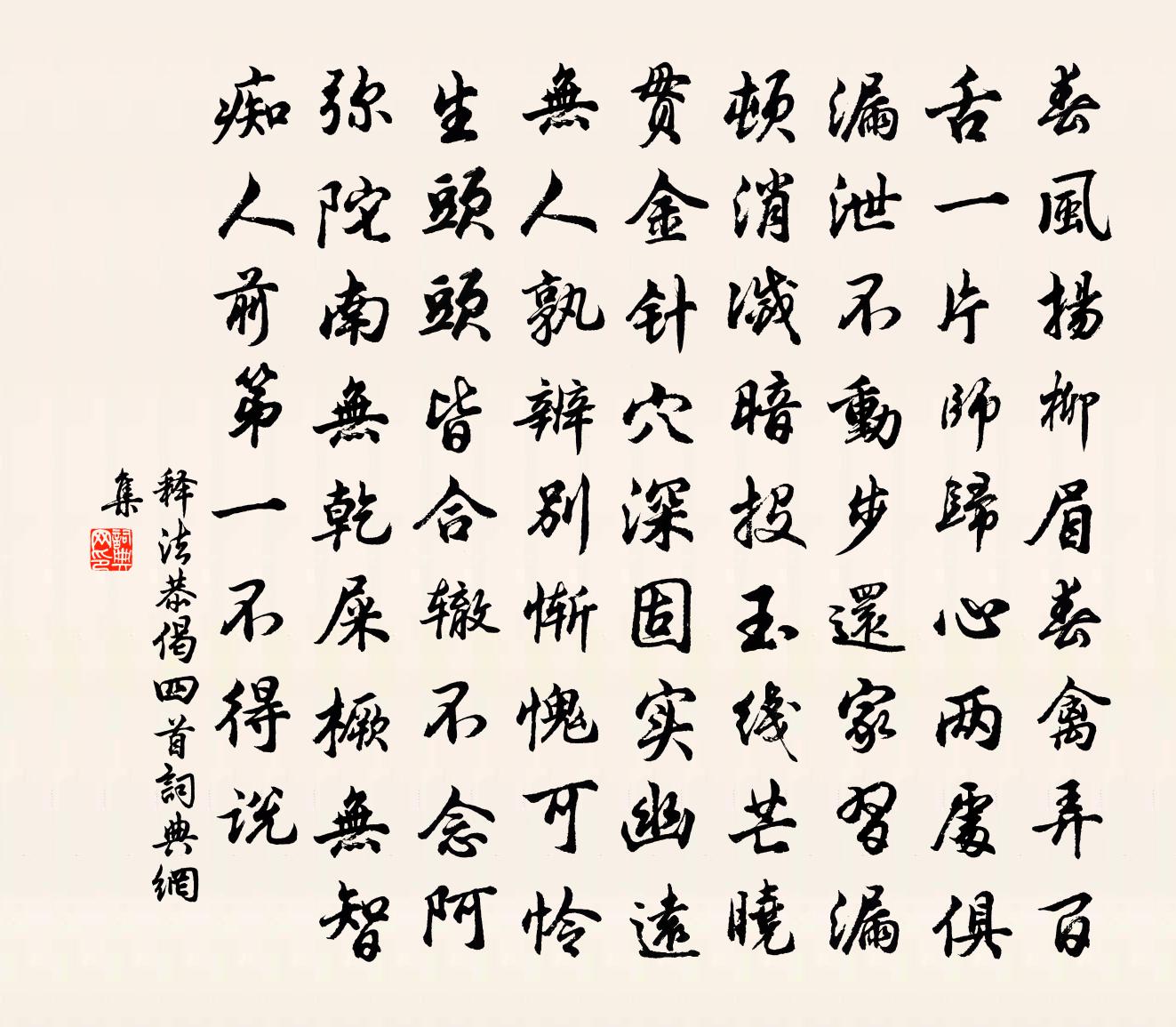 詩詞名句歷史字典書法欣賞書法字典國語詞典說文解字康熙字典古漢語字典標 題 作 者 詩 句 偈四首作者:釋法恭 朝代:宋代偈四首原文春風揚柳眉,春禽弄百舌。一片師歸心,兩處俱漏泄。不動步還家,習漏頓消滅。暗投玉線芒,曉貫金針穴。深固實幽遠,無人孰辨別。慚愧可憐生,頭頭皆合轍。不念阿彌陀,南無乾屎橛。無智痴人前,第一不得說。詩詞問答問:偈四首的作者是誰?答:釋法恭問:偈四首寫於哪個朝代?答:宋代釋法恭偈四首書法欣賞偈四首書法作品詩詞推薦和傅山父小園十詠李曾伯〔宋代〕剖破藩籬出一頭,要追岸壑老人游。知他栽得花和竹,髣髴舊時風度不。酬諸同官見和三首胡寅〔宋代〕莫道同時岸卉稠,背萱無態側葵羞。金蓬未實猶韜日,玉節深藏更耐秋。肯把仙姿供鷺悅,故標高致待龜游。期君與陳去非夏致宏孫信道游南澗同賦四首張嵲〔宋代〕山桃深復淺,亂髮傍幽岩。無人慰寂寞,晴日自毿毿。題招提院靜照堂李大臨〔宋代〕地勝堂新構,僧閒晝杜門。山林誰樂靜,城市亦非喧。客到空彈指,風來不動幡。祗應常宴坐,對鏡一無言。讀馬援傳黃伯樞〔宋代〕後車薏苡落讒人,珠貝文犀竟失真。馬革裹屍猶不恨,何須勝瘴與輕身。再寄胡夢昱〔宋代〕沉沉漢殿曉煙迷,燕雀輸他取次飛。爰把丹衰吐骨鯁,且甘白飯與魚肥。意循天理可無忤,豈料人心各有機。日薄川撥棹王哲〔元代〕四更里,瞥看牛斗光如*。照遍滿寬清虛,放盡靈輝凜冽。向東方也,玉花結。攢燭三山似電掣。熠耀如瓊瑤屑。謁金門(一名花自落、垂楊碧、出塞)韋莊〔唐代〕春雨足,染就一溪新綠。柳外飛來雙羽玉,弄晴相對浴。樓外翠簾高軸,倚遍闌乾幾曲。雲淡水平煙樹簇,寸心千仲冬十六日祭馬步強至〔宋代〕提轡傍險徑,喜隨雙炬紅。薄雲籠淡月,苦霧卷嚴風。馬害誰雲屏,神休覬所蒙。晨門未開鑰,殘夢續齋宮。題林詠道浮江別業徐大受〔宋代〕密林凝書寂,一葉動須驚。砌淨飛花影,池深落果聲。正宜鋪枕簟,且復倒瓶罌。向晚催歸急,煙江野艇橫。望大江方回〔宋代〕春草茫茫闊,春江渺渺流。斷魂欲誰訴,極目使人愁。更過天垂處,應無地盡頭。豪商似差樂,槌鼓發鹽舟。次章房陵韻四首陳造〔宋代〕詩社有血指,鉛刀齒魚腸。橫江限一鎖,未易枝龍驤。山澤護我瑕,珠璧耀我箱。勝譚當不遺,茗果秋夜長。郡齋贈王卿韋應物〔唐代〕無術謬稱簡,素餐空自嗟。秋齋雨成滯,山藥寒始華。濩落人皆笑,幽獨歲逾賒。唯君出塵意,賞愛似山家。出微王峽讀子厚詩恍然偶作二絕句張嵲〔宋代〕西來一水古今綠,峽里諸山天下奇。非是愚溪溪上客,未應輕作此山詩。中秋夜玄雲蔽月行李新〔宋代〕惆悵中秋不見月,太陰垂雲兔藏窟。我欲上天掃玄雲,桂露團團漬冰闕。中天放出千里光,層樓翠閣遙相望。一盃和知章詩顧況〔唐代〕fk鏤銀盤盛炒蝦,鏡湖蓴菜亂如麻。漢兒女嫁吳兒婦,吳兒儘是漢兒爺。劉侍御朝命許停官歸侍皇甫冉〔唐代〕孟孫唯問孝,萊子復辭官。幸遂溫凊願,其甘稼穡難。采芝供上藥,拾槿奉晨餐。棟里雲藏雨,山中暑帶寒。非時和蔣夔寄茶蘇軾〔宋代〕我生百事常隨緣,四方水陸無不便。扁舟渡江適吳越,三年飲食窮芳鮮。金齏玉膾飯炊雪,海螯江柱初脫泉。臨風題滄浪峽榜鄭仁表〔唐代〕分峽東西路正長,行人名利火然湯。路傍著板滄浪峽,真是將閒攪撩忙。周參謀以詩催再游末章戲賦二首張嵲〔宋代〕競說楊枝傾上國,樂天題品付歌行。但同學語雛鶯小,未見回眸剪水明。席舍主人能顧曲,曉來妝燭想銷檠。海棠名句推薦旦別河橋楊柳風,夕臥伊川桃李月。宋之問《寒食還陸渾別業》 為容不在貌,獨抱孤潔。張炎《疏影·梅影》 夜寒微透薄羅裳,無限思量。秦觀《畫堂春·春情》 凡出言,信為先。詐與妄,奚可焉?李毓秀《弟子規·信》 明朝事與孤煙冷,做滿湖、風雨愁人。吳文英《渡江雲三犯·西湖清明》 翠葆參差竹徑成。新荷跳雨淚珠傾。曲闌斜轉小池亭。周邦彥《浣沙溪·翠葆參差竹徑成》 與朋友交遊,須將他們好處留心學來,方能受益王永彬《圍爐夜話·第二則》 又似賈客蜀道間,千鐸萬磬鳴空山牛殳《琵琶行》 笑殺陶淵明,不飲杯中酒。李白《嘲王歷陽不肯飲酒》 博觀而約取,厚積而薄發蘇軾《稼說送張琥》