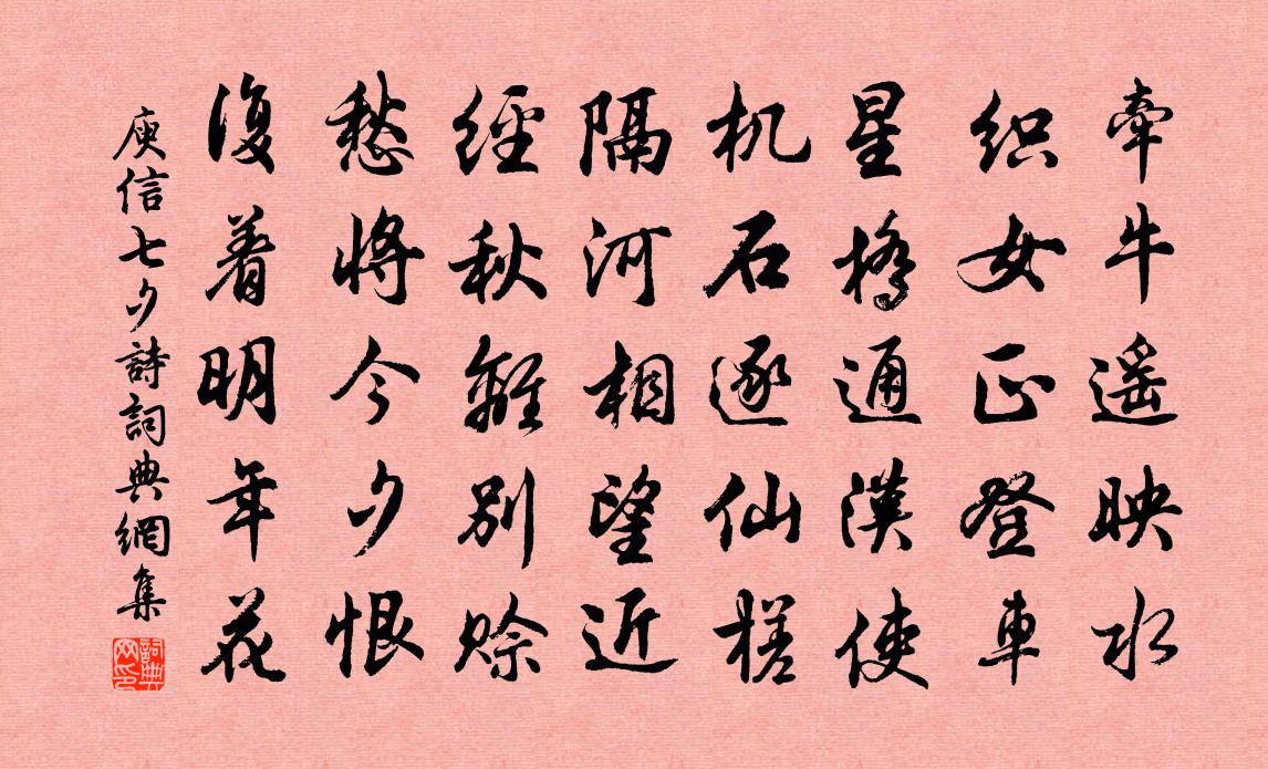 詩詞名句歷史字典書法欣賞書法字典國語詞典說文解字康熙字典古漢語字典標 題 作 者 詩 句 七夕詩作者:庾信 朝代:南北朝七夕詩原文牽牛遙映水。織女正登車。星橋通漢使。機石逐仙槎。隔河相望近。經秋離別賒。愁將今夕恨。復著明年花。詩詞問答問:七夕詩的作者是誰?答:庾信問:七夕詩寫於哪個朝代?答:南北朝問:庾信的名句有哪些?答:庾信名句大全庾信七夕詩書法欣賞七夕詩書法作品詩詞推薦木犀余觀復〔宋代〕盤盤老桂樹,金屑黃{上髟下龍}忪。孕此無盡香,襲襲乘西風。幽人為延佇,古意滋無窮。王孫招不來,西郊草秋聲張鎡〔宋代〕林居多解識秋聲,豈是松篁耳慣經。桐雜蟬鳴愁易起,蕉和蛩響夢頻醒。琅琅急雨喧荷港,戛戛清風戰葦亭。一事方量牧地次韻工曹王亞叟傅察〔宋代〕朝廷遮事備成康,郡邑承風底事忙。要使幅員無曠土,始知冀北有留良。疏狂似我徒勞耳,術業如君詎易量。奔走偈頌七十二首釋祖欽〔宋代〕萬法俱忘百念灰,等閒驀鼻拽將回。鏡光一照明如日,直得木人心眼開。中洲處士折梅花並新語為贈率易鄙句為謝葉適〔宋代〕中洲之中十樹梅,蟠枝著地照蒿萊。即非無主憑誰伴,自不沖寒要早開。午蝶只隨遊子意,暮笳難寫遁夫哀。幽懷縣君赴興慶宮朝賀載之奉行冊禮,因書即事權德輿〔唐代〕合卺交歡二十年,今朝比翼共朝天。風傳漏刻香車度,日照旌旗彩仗鮮。顧我華簪鳴玉珮,看君盛服耀金鈿。相期宿梅仙壇張廣漢〔宋代〕夜宿梅壇境,山寒萬籟空。無才供吏隱,有夢憶仙翁。石齒含殘雪,松髯奮急風。灶煙如可舐,跨鶴問鴻蒙。念奴嬌 飲渾源岳神仙會(張家鼒南塘本訂誤雲,會疑當作館)元好問〔金代〕小山招飲,恨還丹、不至人間豪傑。南渡衣冠多勵集,蕭灑蘭亭三月。陶冶襟靈,留連光景,觴詠今無復。黃壚雖乾道初予自臨川歸鍾陵李德遠范周士送別於西陸游〔宋代〕故人已作山頭土,倦客猶鄣陌上塵。十五年間真一夢,又騎羸馬涉西津。南湖有鷗成群里閭間雲數十年未嘗見也實塵中張鎡〔宋代〕不因他處食無魚,來慰先生索寞居。走筆贈詩君莫笑,從游此是最相於。雨章碣〔唐代〕低著煙花漠漠輕,正堪吟坐掩柴扃。亂沾細網垂窮巷,斜送陰雲入古廳。鎖卻暮愁終不散,添成春醉轉難醒。霽來晚泊三山懷古兼寄歷陽明游賀鑄〔宋代〕三山春水拍江流,六代餘風掃地收。破國龍驤復安在,賦詩宣城難與酬。傷心遠宦北宗老,滿眼舊遊南豫州。寄聲端午內中帖子詞太上皇后閣王珪〔唐代〕平明三殿進觴初,玉女傍邊捧道書。探得長生太清籙,同扶皇曆萬年餘。頌古九十八首釋印肅〔宋代〕不識是真識有心,識心遍處不求人。江陵米滿元無價,師子全威畫不成。代馮似宗壽樓文昌楊簡〔宋代〕肆筵設席,獲教蒙益。繾綣綢繆,問遺不息。食酪陸游〔宋代〕南烹北饌妄相高,常笑紛紛兒女曹。未必鱸魚芼菰菜,便勝羊酪薦櫻桃?次韻黔陽王令詩五絕句項安世〔宋代〕見說吟喔三十載,從來此事一生功。勸君莫用雕鐫得,只恐今人晚更窮。九江千歲龜歌贈無咎張耒〔宋代〕靈龜千年口不食,以背負床飲其息。吾家兩龜豈徒不食亦不息,壽與萬古無終極。濟南晁君博物天地通,夜窺牛斗墐屋方岳〔宋代〕旋墐山寮準備冬,石爐松火盡從容。功名那及生前酒,機會多如飯後鍾。誰寄一詩同保社,自將千竹比侯封。客來送趙吏部釋善珍〔宋代〕薏苡不類珠,疑似多謗傷。恭惟大雅姿,南物不入囊。鈴齋一片石,歷劫難讚揚。常恐難林客,夜半驚虹光。名句推薦美惡既殊,情貌不一,有溫良而為詐者,有外恭而內欺者,有外勇而內怯者,有盡力而不忠者。諸葛亮《將苑·卷一·知人性》 山遠近,路橫斜,青旗沽酒有人家。辛棄疾《鷓鴣天·陌上柔桑破嫩芽》 落日熔金,暮雲合璧,人在何處。李清照《永遇樂·落日熔金》 願我如星君如月,夜夜流光相皎潔。范成大《車遙遙篇》 曲終人不見,江上數峰青。錢起《省試湘靈鼓瑟》 長安回望繡成堆,山頂千門次第開。杜牧《過華清宮絕句三首》 夜合花開香滿庭,夜深微雨醉初醒。竇叔向《夏夜宿表兄話舊》 明年此會知誰健?醉把茱萸仔細看。杜甫《九日藍田崔氏莊》 草色青青柳色黃,桃花歷亂李花香。賈至《春思二首·其一》 初驚河漢落,半灑雲天裡。李白《望廬山瀑布水二首》