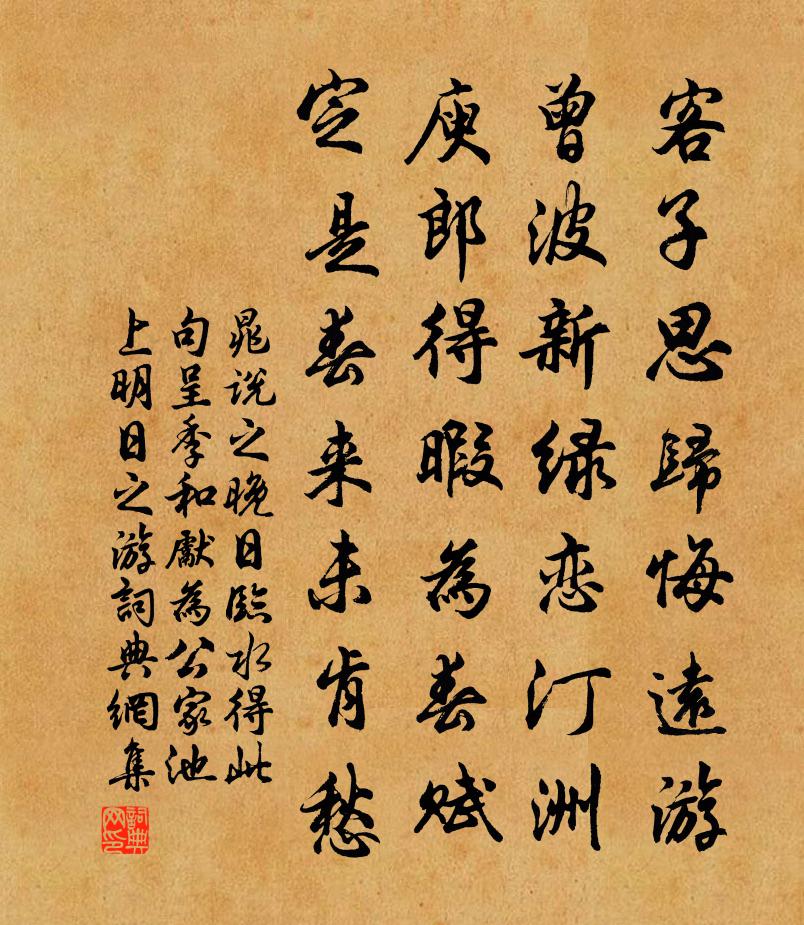 詩詞名句歷史字典書法欣賞書法字典國語詞典說文解字康熙字典古漢語字典標 題 作 者 詩 句 晚日臨水得此句呈季和先為公家池上明日之游作者:晁說之 朝代:宋代原文客子思歸悔遠遊,曾波新綠戀汀洲。庾郎得暇為春賦,定是春來未肯愁。詩詞問答問:《晚日臨水得此句呈季和先為公家池上明日之游》的作者是誰?答:晁說之問:該詩寫於哪個朝代?答:宋代書法欣賞晚日臨水得此句呈季和先為公家池上明日之游書法作品詩文賞析【原題】:晚日臨水得此句呈季和先為公家池上明日之游也詩詞推薦題汪水雲詩卷十一首劉師復〔宋代〕天造西湖錦繡堆,柳邊漁父小篷開。能言景定年間事,公主鸞簫錦櫂來。榴花曾幾〔宋代〕樹陰看已合,榴朵見初明。當夏豈無意,避春真有情。花雖後文杏,實可待環橙。病叟緣何喜,留苔看落英。禪人並化主寫真求贊釋正覺〔宋代〕額高眼深,該抹叢林。人驚大膽,我自無心。默轉機梭路,誰投缽水針。覿面相呈了也,抬頭何處相尋。精思秦觀〔宋代〕精思洞元化,白日升高旻。俯仰凌倒景,龍行速如神。半道過紫府,弭節聊逡巡。金床設寶幾,璀璨明月珍。僊者跋恩上人詩牟巘五〔宋代〕把斷風光不許通,坐天目頂月明中。下方雷作嬰兒叫,莫是山僧耳太聰。發益昌度正〔宋代〕牽江萬斛犯驚湍,終日號呼寸寸難。少駐不妨官避客,也教容易下前灘。答子勉三首黃庭堅〔宋代〕君不登郎省,還應上諫坡。才高殊未識,歲晚幸無他。櫪馬羸難出,鄰雞凍不歌。寒爐余幾火,灰里撥陰何。驚人句諶祜〔宋代〕禹甸草荒昏霧遍,漢宮花夢晝雲酣。平川道中李若水〔宋代〕客子結征衣,伺明鞭瘦馬。時平路無虞,年豐村有社。歸雁嘶層雲,飢烏啄平野。牆花初壓枝,橋柳已盈把。春岸將相棄國第十九文天祥〔宋代〕扈聖登黃閣,大將赴朝廷。胡為入雲霧,浩蕩乘滄溟。呈王平江二首趙蕃〔宋代〕倦著尚書履,閒凝燕寢香。聲猶傳漢殿,句豈羨韋郎。偃泊姑鈴閣,遄歸定玉堂。不惟資獻納,政復用文章。春晚二首劉應時〔宋代〕子規聲里正斜陽,風過斷橋流水香。頗怪影侵書帶綠,弄晴柳色過鄰牆。走筆送濟翁弟過浙東謁丘宗卿二首楊萬里〔宋代〕出省還家思巳昏,答書見客腹仍煩。政愁獨酌無佳客,家裡詩人忽扣門。主人司空後亭牡丹孫魴〔唐代〕佳卉挺芳辰,夭容乃絕倫。望開從隔歲,愁過即無春。體物真英氣,余花似庶人。蜂攢知眷戀,鳥語亦殷勤。況在寄章貢姚使君劉克莊〔宋代〕虔在江西尤鉅麗,極知君相選侯難。昔多法從懷州紱,今少詩人上將壇。斂戌官兵申拆洗,放衙豀洞報平安。衰頹觀我四首 死張問陶〔清代〕膠革全崩傀儡場,岐雷醫命竟無方。千秋許我留真氣,百事催人到夕陽。誰把黃金求駿骨,且餘一壠羨生王。涅槃大兒時中堂成德修弟喜而賦之因次元韻陶夢桂〔宋代〕有譚名利者,耳若了不聞。心乎平似水,身也懶於雲。眇眇居人世,駸駸過隙曛。田園趣歸去,風月謾平分。有子七十三歲作蘇轍〔宋代〕一生有志恨無才,久爾蕭蕭白髮催。力學當年真自信,初心到此未應回。舊人化去渾無幾,新障重生撥不開。七十清水驛叢竹天水趙雲余手種一十二莖柳宗元〔唐代〕檐下疏篁十二莖,襄陽從事寄幽情。只應更使伶倫見,寫盡雌雄雙鳳鳴。再題陸游〔宋代〕柴門數頃秋,半日為遲留。老驥厭伏櫪,飢鷹思下韝。野橋危欲斷,山雨落還收。何許丹青手,端能寫此愁。名句推薦若菩薩有我相人相眾生相壽者相。即非菩薩。鳩摩羅什譯《金剛經·大乘正宗》 一切都是命,半點不由人。佚名《增廣賢文·上集》 喃喃教言語,一一刷毛衣。白居易《燕詩示劉叟》 漠漠秋雲起,稍稍夜寒生。白居易《微雨夜行》 客路青山外,行舟綠水前。王灣《次北固山下》 遙看孟津河,楊柳郁婆娑。佚名《折楊柳歌辭五首》 功名祗向馬上取,真是英雄一丈夫岑參《送李副使赴磧西官軍》 它山之石,可以攻玉。佚名《鶴鳴》 舞榭歌台,風流總被雨打風吹去。辛棄疾《永遇樂·京口北固亭懷古》 水至清則無魚,人至察則無徒。班固《漢書·傳·東方朔傳》