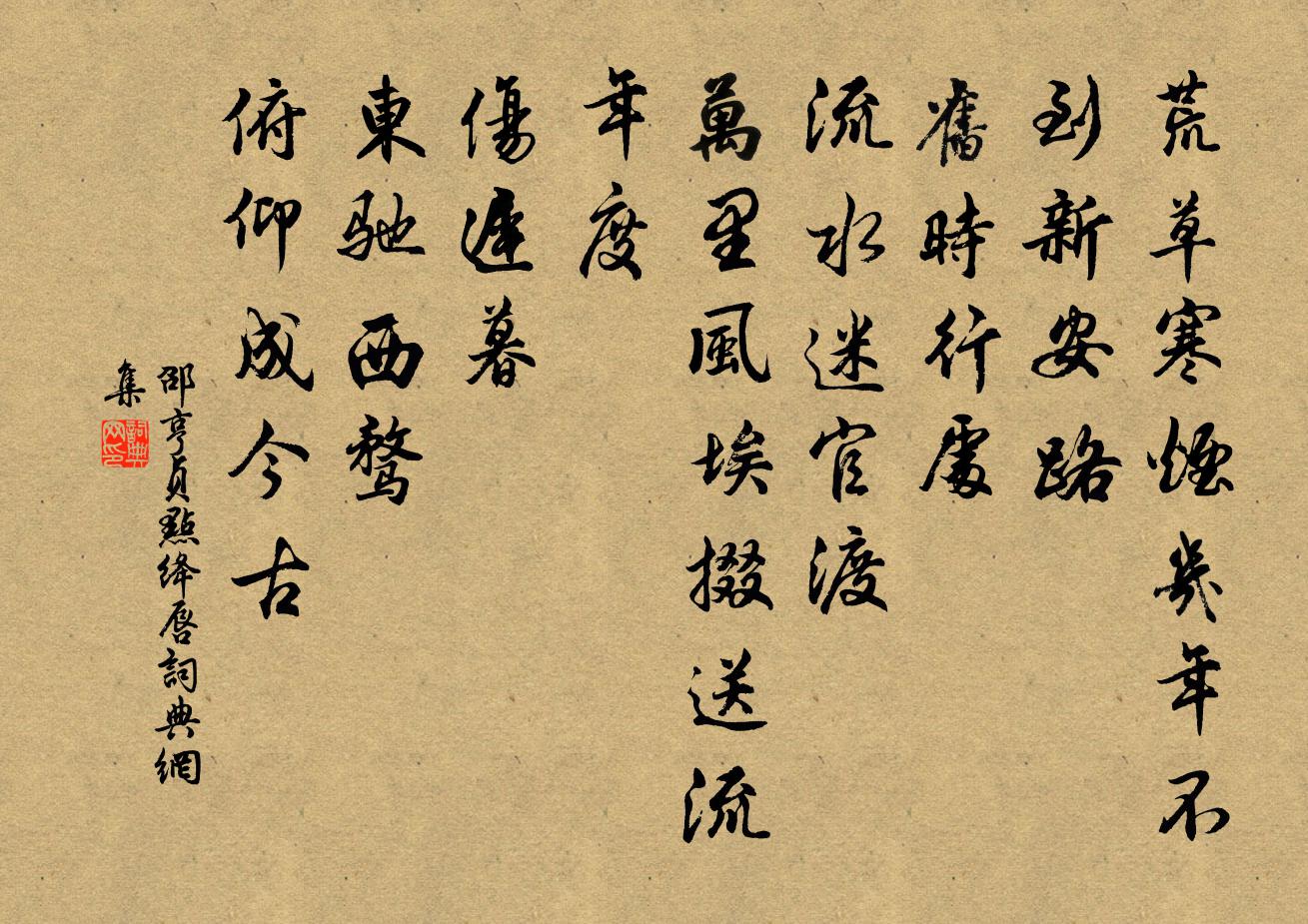 詩詞名句歷史字典書法欣賞書法字典國語詞典說文解字康熙字典古漢語字典標 題 作 者 詩 句 點絳唇作者:邵亨貞 朝代:元代點絳唇原文荒草寒煙,幾年不到新安路。舊時行處。流水迷官渡。萬里風埃,掇送流年度。傷遲暮。東馳西騖。俯仰成今古。詩詞問答問:點絳唇的作者是誰?答:邵亨貞問:點絳唇寫於哪個朝代?答:元代問:點絳唇是什麼體裁?答:詞邵亨貞點絳唇書法欣賞點絳唇書法作品詩詞推薦奉和御製讀唐書夏竦〔宋代〕天祚文皇德,元成雅道施。納忠裨闕政,偃革致昌期。宴喜刀方解,人亡鑒遽隳。數行遺奏在,猶可動神祗。瑤台第一層張元乾〔宋代〕寶曆祥開飛練上,青冥萬里光。石城形勝,秦淮風景,威鳳來翔。臘餘春色早,兆釣璜、賢佐興王。對熙旦,正格思歸二首戴復古〔宋代〕吟詩不換校書郎,但欲封侯管醉鄉。疏懶無成嵇叔夜,清狂似達賀知章。安貧不怕黃金盡,既老從教白髮長。百計塞上曲李白〔唐代〕大漢無中策,匈奴犯渭橋。五原秋草綠,胡馬一何驕。命將征西極,橫行陰山側。燕支落漢家,婦女無華色。轉戰石橋陶谷〔宋代〕重重翠幛聳雲端,玉殿金樓縹緲間。聖境不容凡俗到,故將飛瀑隔塵寰。次韻唐彥猷華亭十其四始皇馳道王安石〔宋代〕穆王得八駿,萬事得期修。茫茫萬載間,復此好遠遊。車輪與馬跡,此地亦嘗留。想當治道時,勞者屍如丘。巨室遺牡丹有作衛宗武〔宋代〕幾年有負傾城艷,慚愧今朝對洛花。憶昔富文同勝集,慨今姚魏屬誰家。賞心不作園林想,過眼聊為幾席華。回首句曹組〔宋代〕江雨帶潮來。過吳江題臞庵吳芾〔宋代〕壯歲經行今白頭,未容歸老復來游。人如化鶴雲間去,橋似垂虹天際浮。風月一川無限興,煙波萬頃不勝愁。三賢過廣愛寺,見三學演師,觀楊惠之塑寶山、朱蘇軾〔宋代〕朱瑤唐晚輩,得法尚雄深。滿寺空遺蹟,何人識苦心。長廊欹雨腳,破壁撼鍾音。成壞無窮事,他年復吊今。遇越州賀仲宣施肩吾〔唐代〕君在鏡湖西畔住,四明山下莫經春。門前幾個採蓮女,欲泊蓮舟無主人。題永豐吳尉當山亭曾豐〔宋代〕家居所至與山對,官居所至與山背。眼中悔失真崢嶸,得其似者宜加愛。尉仙三令奸膽寒,突兀數椽答清閒。誰橫舊將劉騭〔宋代〕彊弩當年討不庭。功成身退炳丹青。囊沙澤畔知兵法,聚米山前識陣形。驥老未甘秋伏櫪,劍閒猶覺夜衝星。分茅醉公子尹鶚〔唐代〕暮煙籠蘚砌,戟門猶未閉。盡日醉尋春,歸來月滿身。離鞍偎繡袂,墜巾花亂綴。何處惱佳人,檀痕衣上新。次韻清卿用使君鹿鳴韻見貽曹彥約〔宋代〕甲戌家聲僅有傳,等閒膏澤下雲天。苦無事業榮宗黨,強把忠勤了歲年。往事紛紜幾折解,後來奔軼要加鞭。得時菩薩蠻(回文)張孝祥〔宋代〕晚花殘雨風簾卷。捲簾風雨殘花晚。雙燕語虛窗。窗虛語燕雙。睡醒風愜意。意愜風醒睡。誰與話情詩。詩情話與句方孝能〔宋代〕壺公簪紱數如沙,三世青雲在一家。舉世美奉詔旨分督決獄甲戌判袂之武陽壬午還趙蕃〔宋代〕盛暑宵憂動邃旒,敕催諸道決纍囚。承流宣澤彌兢惕,履險航湍敢滯留。南北分馳才數夕,重輕釋系已三州。高材和文潛二首晁補之〔宋代〕索米強知當世策,種芝欲訪隱人書。未應只有鄰邦約,投老相看事事如。卜運算元張鎡〔宋代〕常記十年前,共醉梅邊路。別後頻收尺素書,依舊情相與。早願卻來看,玉照花深處。風暖還聽柳際鶯,休唱閒居名句推薦慨當初,倚飛何重,後來何酷。文徵明《滿江紅·拂拭殘碑》 草長鶯飛二月天,拂堤楊柳醉春煙。高鼎《村居》 秋江帶雨,寒沙縈水,人瞰畫閣愁獨。史達祖《八歸·秋江帶雨》 來掃千山雪,歸留萬國花。袁枚《春風》 賞賜不能喜,誅罰不能威。墨子《墨子·05章 七患》 人言落日是天涯,望極天涯不見家。李覯《鄉思》 亂世用能,平則去患。來俊臣《羅織經·控權卷第四》 為善則流芳百世,為惡則遺臭萬年。程登吉《幼學瓊林·卷三·人事》 最愛東山晴後雪,軟紅光里涌銀山。楊萬里《最愛東山晴後雪》 千錘萬鑿出深山,烈火焚燒若等閒。于謙《石灰吟》