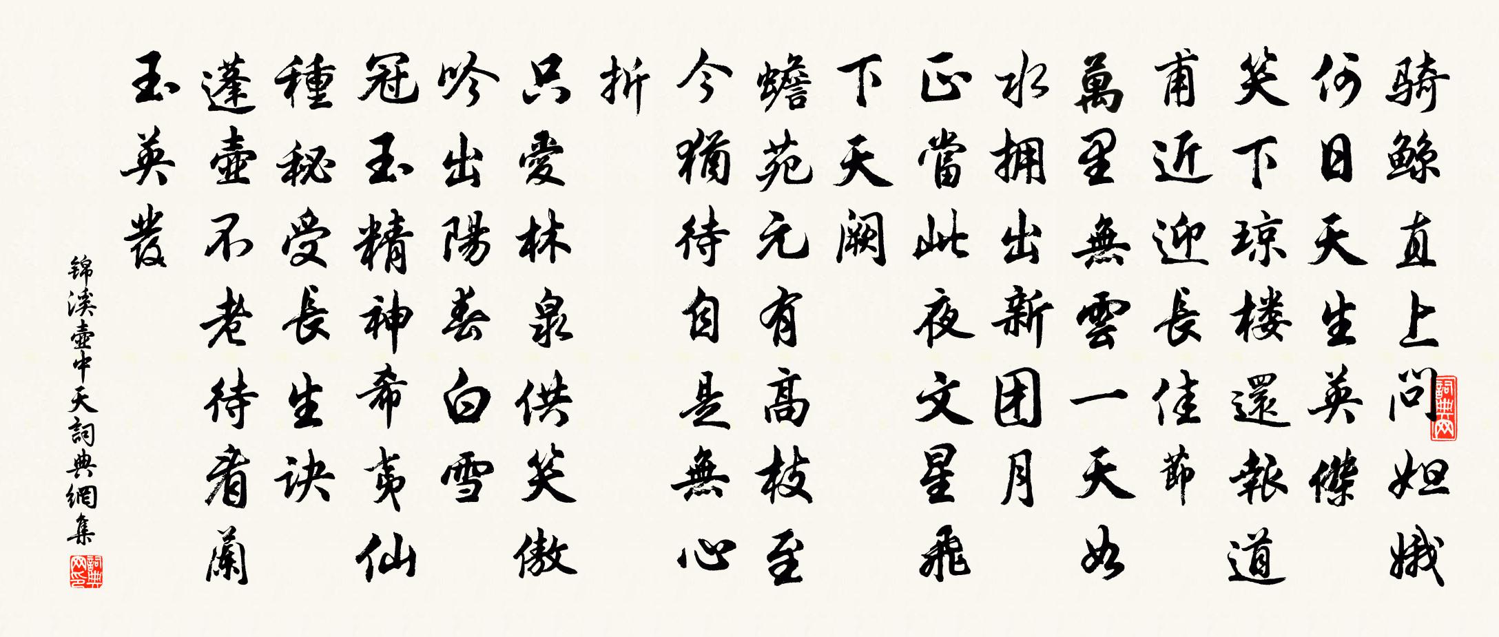 詩詞名句歷史字典書法欣賞書法字典國語詞典說文解字康熙字典古漢語字典標 題 作 者 詩 句 壺中天/念奴嬌作者:錦溪 朝代:宋代壺中天/念奴嬌原文騎鯨直上,問妲娥何日,天生英傑。笑下瓊樓,還報導,甫近迎長佳節。萬里無雲,一天如水,擁出新團月。正當此夜,文星飛下天闕。蟾苑元有高枝,至今猶待,自是無心折。只愛林泉供笑傲,吟出陽春白雪。冠玉精神,希夷仙種,秘受長生訣。蓬壺不老,待看蘭玉英發。詩詞問答問:壺中天/念奴嬌的作者是誰?答:錦溪問:壺中天/念奴嬌寫於哪個朝代?答:宋代問:壺中天/念奴嬌是什麼體裁?答:詞錦溪壺中天/念奴嬌書法欣賞壺中天/念奴嬌書法作品詩詞推薦和立齋宿友韻王柏〔宋代〕吾儕有何樂,同志味自長。天高與地下,參我人中央。痛掃物慾蔽,放出元明光。力學日不足,遊宦那可常。山人浪淘沙(素馨)劉克莊〔宋代〕目力已茫茫。縫菊為囊。論衡何必帳中藏。卻愛素馨清鼻觀,采伴禪床。風露送新涼。山麝開房。旋吹銀燭閉華堂漁父吳鎮〔元代〕如何小小作絲綸。只向湖中養一身。任公子,爾何人。枉釣如山截海胡廣徐鈞〔宋代〕六朝黃髮老三公,固位依違善取容。真是鄉原為德賊,如何至德比中庸。昔嘆宋庠〔宋代〕昔嘆桴乘海,今悲澗隱松。連城輕偽璧,畫室畏真龍。靜勝將生白,機亡恥合蹤。誰談龜手術,洴澼換吳封。春鳩溫憲〔唐代〕村南微雨新,平綠淨無塵。散睡桑條暖,閒鳴屋脊春。遠聞和曉夢,相應在諸鄰。行樂花時節,追飛見亦頻。譙丈復見貽仍次韻答之二首李流謙〔宋代〕筆陣旗開豹繞竿,敢持一鏃傍門闌。朅來戲作鳧飛舄,老去嫌為蚋聚酸。塵土簿書慵掛眼,瓊瑤文字喜彫肝。寄牋董祀妻蔡琰徐鈞〔宋代〕此生已分老沙塵,誰把黃金贖得身。十八拍笳休憤切,須知薄命是佳人。哨遍(秋水觀)辛棄疾〔宋代〕蝸角鬥爭,左觸右蠻,一戰連千里。君試思、方寸此心微。總虛空、並包無際。喻此理。何言泰山毫末,從來天地挽吳門昌母夫人二首李曾伯〔宋代〕慶事一門盛,修齡七袠強。綸封四大國,采侍兩文昌。夢幻存真覺,動庸看顯揚。家山空睇望,惜此令儀亡。登縣樓有感二首趙蕃〔宋代〕見說南樓秋氣多,夜涼槐竹影婆娑。滿樓風月成辜負,奈此青州從事何。同李秘校譚員外月華長老謁慈濟禪師會宿寶林余靖〔宋代〕祖堂留勝跡,再宿此登臨。雲月自明暗,山川無古今。谷聲猿嘯遠,泉脈虎跑深。共到忘言處,休論佛與心。曹山寺釋晦山〔宋代〕千年荷玉紫雲蟠,偶翳浮塵影欲寒。不是老人重著力,雨花洞口棘漫漫。頃客解梁有詩云中條山下讀周易定是前身關子晁說之〔宋代〕坂路十年塵坱身,不知何事往來頻。敢言上國非吾土,自許中條是故人。志在韋編徒寡與,人亡陵海謾多珍。龍門句方至〔宋代〕缺多圓少如月,盛極衰來物易秋。答豆盧居士春夜遊東園見懷皎然〔唐代〕春意賞不足,承夕步東園。事表精慮遠,月中華木繁。開襟寄清景,遐想屬空門。安得纚芳屣,看君幽徑萱。壬子元日遂安縣學講書齒飲前此四十三年錢建孫應時〔宋代〕壁字塵埃四十年,滿堂還喜會群賢。是非不用論今昨,禮樂從知有後先。酒外山川如動色,詩成金石迭相宣。分陽送鄭權尚書南海王建〔唐代〕七郡雙旌貴,人皆不憶回。戍頭龍腦鋪,關口象牙堆。敕設薰爐出,蠻辭咒節開。市喧山賊破,金賤海船來。白氎三月三日寒食釋行海〔宋代〕三月初三寒食雨,春光黯淡似秋光。羽書未報江東捷,何日看花到洛陽。公館文同〔宋代〕公館書沈沈,煙雲晚作陰。琴軒冰沼淨,書閣火爐深。默坐自有得,閒行誰可尋,還應上高閣,看雪一千岑。名句推薦其沸,如魚目,微有聲,為一沸;緣邊如湧泉連珠,為二沸;騰波鼓浪,為三沸陸羽《茶經·五之煮》 為惡而畏人知,惡中猶有善路;為善而急人知,善處即是惡根。洪應明《菜根譚·概論》 停船暫借問,或恐是同鄉。崔顥《長干行·君家何處住》 漱冰濯雪,眇視萬里一毫端。張孝祥《水調歌頭·金山觀月》 一朝哭都市,淚盡歸田畝。元結《農臣怨》 前度綠陰載酒,枝頭色比舞裙同。王沂孫《慶清朝·榴花》 樓台處處迷芳草,風雨年年怨落花。曾棨《維揚懷古》 數州訊息斷,愁坐正書空。杜甫《對雪》 怯於邑斗,而勇於寇戰。商鞅《商君書·戰法》 何用慰相思,裁書寄關右。李益《送諸暨王主簿之任》