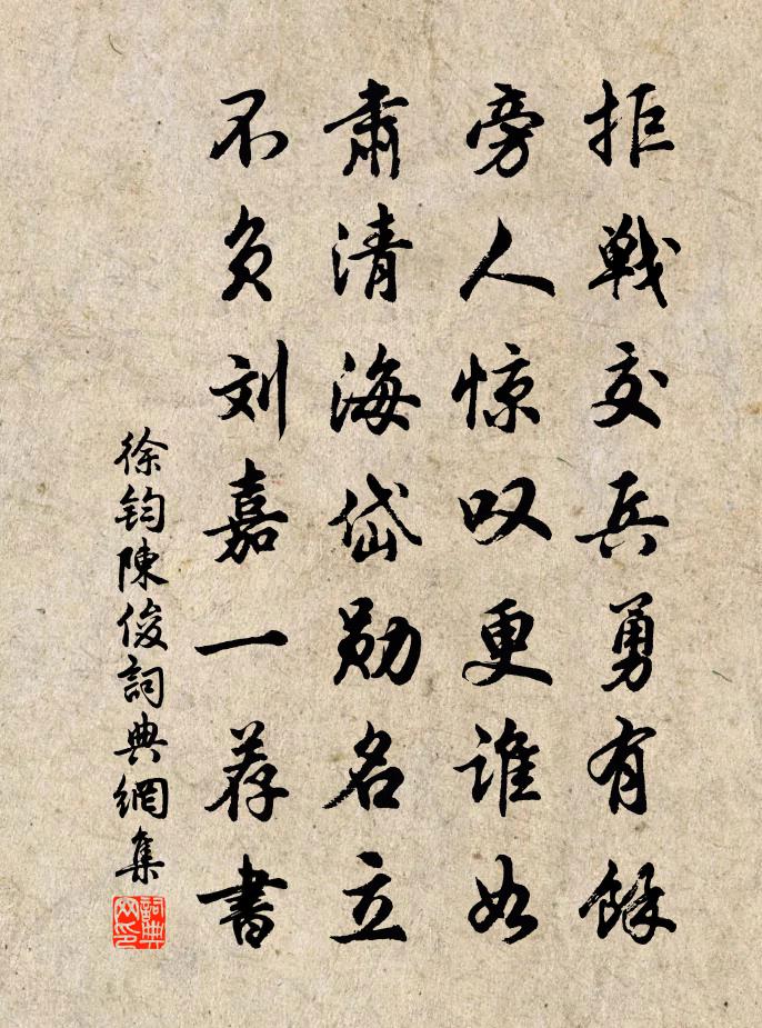 詩詞名句歷史字典書法欣賞書法字典國語詞典說文解字康熙字典古漢語字典標 題 作 者 詩 句 陳俊作者:徐鈞 朝代:宋代陳俊原文拒戰交兵勇有餘,旁人驚嘆更誰如。肅清海岱勛名立,不負劉嘉一薦書。詩詞問答問:陳俊的作者是誰?答:徐鈞問:陳俊寫於哪個朝代?答:宋代徐鈞陳俊書法欣賞陳俊書法作品詩詞推薦宮詞張公庠〔宋代〕上林隨駕賞芳辰,曲賜黃封腊味醇。供帳不須勞幕士,垂揚為蓋草為茵。寄集節二首張耒〔宋代〕北風號空庭,山雪鳴急霰。是時我與子,傾蓋初相見。相逢兩恨晚,語罷喜復嘆。明燈照紅爐,杯酌方爛漫。劉公水龍吟(觀競渡)李公昴〔宋代〕碧潭新漲浮花,柳陰稠綠波痕膩。一聲雷鼓,半空雪浪,雙龍驚起。氣壓鯨鯢,怒掀鱗鬣,擘開煙水。算戰爭蠻觸大中祥符封禪十首真宗〔宋代〕皇天上帝,陰驚下民。道崇廣覆,化洽鴻鈞。靈文誕錫,實命惟新。增高欽事,式奉嚴社。早春有懷林季仲〔宋代〕青春無語到天涯,百舌枝頭漫自誇。紅破輕寒入桃萼,香和宿雨落梅花。風吹杖屨千山晚,水照林塘兩鬢華。萬事曾谹父惠黃龍菜王洋〔宋代〕朝日團團齡碧峰,蔬盤牢饌四時同。園供小摘添幽事,雨打寒菘帶晚濃。可但牛香參玉版,直須進步禮黃龍。溪堂偈七首釋道顏〔宋代〕去年寒食後,今年寒食前。日日是好日,不是正中偏。送張仲宗押戟歸閩中陳與義〔宋代〕翩然花鴻鵠本不花群,亦復花為口長紛紛。去年弄影河北月,今年迎花江南雲。還家不比陶令冷,持節正效相如勤繆朝宗第一百一十六文天祥〔宋代〕空荒咆熊羆,摧殘沒藜莠。平生江海心,其人骨已朽。別董大二首高適〔唐代〕千里黃雲白日曛,北風吹雁雪紛紛。莫愁前路無知己,天下誰人不識君。六翮飄颻私自憐,一離京洛十餘年。丈夫東堂四首張耒〔宋代〕居止年來如傳舍,構堂珍重主人情。浮生行止誰能計,苟合真須學子荊。江村行張籍〔唐代〕南塘水深蘆筍齊,下田種稻不作畦。耕場磷磷在水底,短衣半染蘆中泥。田頭刈莎結為屋,歸來系牛還獨宿。水淹次韻劉簿寄示方岳〔宋代〕塵世崎嶇天一握,俗子追奔蝸兩角。先生宴坐心平夷,矮屋打頭甘寂寞。手提老筆挾霜氣,合上蓬山直延閣。高人送七兄監廟赴南宮兼吾大兄知縣二首周必大〔宋代〕河梁曾誦送行篇,蝸角牛毛十五年。畢竟中間皆夢爾,祗今相對各蒼然。蕭蕭暫隔連床雨,蕩蕩初行萬斛船。誰近和程公辟游宿猿洞二首陳襄〔宋代〕幾年營此草堂棲,施飾名園百卉齊。曾學子真耕谷口,今容摩什老山西。龍台日上千峰出,雁塔雲生一徑迷。知有南華寺五首李昴英〔宋代〕未參五祖已開山,全下全身此地安。不是香菸忘故里,衣留孔道要人看。軍中人日登高贈房明府宋之問〔唐代〕幽郊昨夜陰風斷,頓覺朝來陽吹暖。涇水橋南柳欲黃,杜陵城北花應滿。長安昨夜寄春衣,短翮登茲一望歸。聞道和樓大防尚書送行韻陳傅良〔宋代〕齊年兄弟又齊名,商略行藏共此生。自昔從君瞻馬首,如今輸我與鷗盟。讀書松竹交千載,曳履星辰聽五更。借問送韋商州弼沈佺期〔唐代〕會府應文昌,商山鎮國陽。聞君監郡史,暫罷尚書郎。王事嗟相失,人情貴不忘。累年同畫省,四海接文場。點翰清明登奉先城樓羅袞〔唐代〕年來年去只艱危,春半堯山草尚衰。四海清平耆舊見,五陵寒食小臣悲。煙銷井邑隈樓檻,雪滿川原泥酒卮。拭盡名句推薦飛絮飛花何處是,層冰積雪摧殘,疏疏一樹五更寒。納蘭性德《臨江仙·寒柳》 手種堂前垂柳,別來幾度春風?歐陽修《朝中措·送劉仲原甫出守維揚》 東風不為吹愁去,春日偏能惹恨長。賈至《春思二首·其一》 七國三邊未到憂,十三身襲富平侯李商隱《富平少侯》 何謂享福之才,能讀書者便是;何謂創家之人,能教子者便是。王永彬《圍爐夜話·第一O四則》 軍氣橫大荒,戰酣日將入。王昌齡《從軍行二首》 遺民淚盡胡塵里,南望王師又一年。陸游《秋夜將曉出籬門迎涼有感》 吳酒一杯春竹葉,吳娃雙舞醉芙蓉。白居易《憶江南詞三首》 蜀道之難,難於上青天!李白《蜀道難》 馬蹄濃露,雞聲淡月,寂歷荒村路。張榘《青玉案·被檄出郊題陳氏山居》