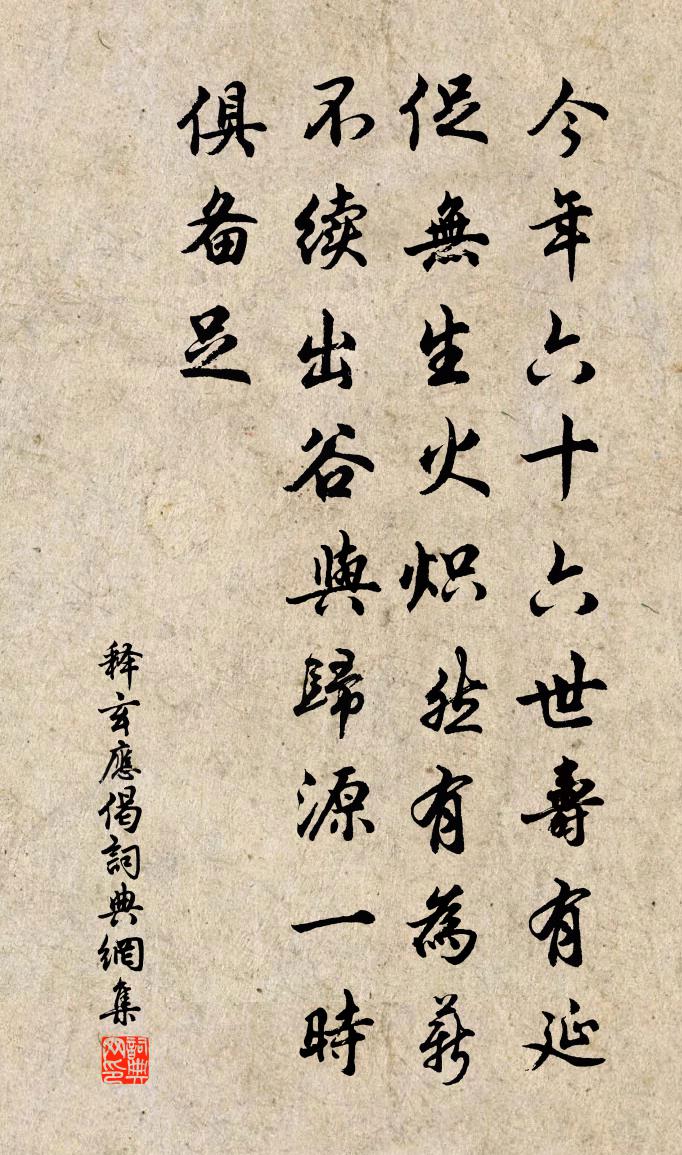 詩詞名句歷史字典書法欣賞書法字典國語詞典說文解字康熙字典古漢語字典標 題 作 者 詩 句 偈作者:釋玄應 朝代:宋代偈原文今年六十六,世壽有延促。無生火熾然,有為薪不續。出谷與歸源,一時俱備足。詩詞問答問:偈的作者是誰?答:釋玄應問:偈寫於哪個朝代?答:宋代釋玄應偈書法欣賞偈書法作品詩詞推薦井泉李呂〔宋代〕山溜碧泓澄,清甘歸色味。儻逢張又新,應不落第二。內司毀林建寺淳佑士人〔宋代〕合抱長村臥壑深,於今惟恨不空林。誰知廣廈千斤斧,斲盡人間孝子心。謝石主簿和章呂聲之〔宋代〕多君養就大椿年,便腹詩書晝欲眠。絳闕當年名藕甚,白雲他日跡飄然。千軍筆掃人誰敵,九轉丹成世莫傅。倦眼送姜子謙寄鍾離樓鑰〔宋代〕濠梁自古揚州域,禹娶塗山城尚留。鍾離雖嘗作楚縣,子男之國書春秋。卑梁爭桑起吳釁,陰陵失道除漢讎。嬴秦句厲文翁〔宋代〕蒼蕪萬頃渺無邊,鞭石飛梁接市廛。南柯子(塔院僧閣)陳與義〔宋代〕矯矯千年鶴,茫茫萬里風。闌乾三面看秋空。背插浮屠千尺、冷煙中。林塢村村暗,溪流處處通。此間何似玉霄峰再下第將歸荊楚上白舍人雍陶〔唐代〕窮通應計一時間,今日甘從刖足還。長倚玉人心自醉,不辭歸去哭荊山。木蘭花晏殊〔宋代〕簾旌浪卷金泥鳳。宿醉醒來長瞢忪。海棠開後曉寒輕,柳絮飛時春睡重。美酒一杯誰與共。往事舊歡時節動。不如星精石鄭損〔唐代〕突險呀空龍虎蹲,由來英氣蓄寒根。蒼苔點染雲生靨,老雨淋漓鐵漬痕。松韻遠趨疑認祖,山陰輕覆似憐孫。孤岩減字木蘭花沈瀛〔宋代〕棋枰響止。勝負豈能全兩喜。不競南風。忽爾三生六劫通。客方對酒。一片捷音來自壽。甚快人何。大勝呼廬百萬賀新郎 次呂叔泰南城懷古許有壬〔元代〕故壘空如堵。杳無蹤、朝台暮榭,燕歌趙舞。為問人間繁華夢,幾度邯鄲炊黍。只燕子、春來秋去。太液句陳何由偈頌一百零一首釋慧性〔宋代〕鼓沒弦琴,吹無孔笛。共樂堯年同舜日,達磨九年空面壁。頌古十五首釋慧遠〔宋代〕三喚三應,更饒貼稱。月逗寒窗,水歸巨浸。負汝負吾,全鋒敵勝。觸事虞儔〔宋代〕綠匣何煩至,黃衣尚有雲。催科寧是拙,稼穡亦良勤。當念溝中瘠,難專柱後文。誰令公喜怒,雁鶩政紛紛。和四弟夏雨孔武仲〔宋代〕蠶月雨冥冥,愁雲滿太清。庭階猶積潤,溝港更繁聲。嫩綠應浮野,余涼稍及城。隋河今不淺,放艇欲南征。西江月李處全〔宋代〕婥婥妝樓紅袖,亭亭將閫青油。東皇天巧世無儔。定有司花妙手。十里香風曉霽,千家綺陌春遊。竹西路轉古揚州春近董嗣杲〔宋代〕瀉月江當戶,編茅屋背崖。久貧難養氣,獨酌且開懷。雪水喧唯土,天風破楚霾。鞭春明日早,環佩想堯階。次韻酬禮之見始強至〔宋代〕慶曆天王設網羅,君時遺俊我登科。當時未識名猶熟,此日相逢分固多。摩戛青雲知志在,驚嗟素業怵時過。朱顏寄夏文州左藏佾文同〔宋代〕寄語文州守,謀邊想甚勞。封疆通鳥鼠,種落雜猿猱。甲馬廉頗少,詩書郄縠高。當須辦乃事,不用恥弓刀。留汪子明徐瑞〔宋代〕美人渺渺隔秋水,六年不見心茫茫。麥昴黍低各自媚,鶴長鎬短庸何傷。荷鑰未未素業在,讀憶具來真味長。是間名句推薦愁里高歌梁父吟,猶如金玉戛商音。鄭思肖《二礪》 月色入高樓,相思兩處愁。秋瑾《菩薩蠻·寄女伴》 言則稱於湯文,行則譬於狗豨。墨子《墨子·46章 耕柱》 捲地風來忽吹散,望湖樓下水如天。蘇軾《六月二十七日望湖樓醉書》 燕歌未斷塞鴻飛,牧馬群嘶邊草綠。李益《塞下曲·其一》 深秋簾幕千家雨,落日樓台一笛風。杜牧《題宣州開元寺水閣閣下宛溪夾溪居人》 惡言不出於口,忿言不反於身。戴聖《禮記·祭義》 湖南為客動經春,燕子銜泥兩度新。杜甫《燕子來舟中作》 誰料同心結不成,翻就相思結。夏完淳《卜運算元·秋色到空閨》 松間沙路淨無泥,瀟瀟暮雨子規啼。蘇軾《浣溪沙·游蘄水清泉寺》