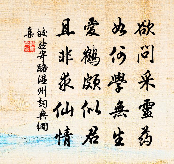 詩詞名句歷史字典書法欣賞書法字典國語詞典說文解字康熙字典古漢語字典標 題 作 者 詩 句 寄路溫州作者:皎然 朝代:唐代寄路溫州原文欲問采靈藥,如何學無生。愛鶴頗似君,且非求仙情。詩詞問答問:寄路溫州的作者是誰?答:皎然問:寄路溫州寫於哪個朝代?答:唐代問:寄路溫州是什麼體裁?答:五古皎然寄路溫州書法欣賞寄路溫州書法作品注釋全唐詩:卷818-72詩詞推薦安溪鹿鳴呈諸先輩陳宓〔宋代〕仙李蟠根連月窟,桂枝平步折天津。雪窗莫忘辛勤日,省酒簪花曲水濱。芍藥鄭雲林〔宋代〕與春相識亦多年,今歲春胡不到園。一任階前無芍藥,免教蜂蝶兩爭喧。次韻和表臣惠符離去歲重醞酒時與杜挺之李宣梅堯臣〔宋代〕贈以榴花酒,沉清貴隔年。不憂航滯磧,為泛盞如船。加品盈盤內,無花到眼前。還招李杜醉,野釀莫稱賢。和晚菊王安石〔宋代〕不得黃花九日吹,空看野葉翠葳蕤。淵明酩酊知何處,子美蕭條向此時。委翳似甘終草莽,栽培空欲傍藩籬。可憐禽言四首黎廷瑞〔宋代〕提壺盧,沽美酒,烹肥羜,剪新韭。琵琶胡姬玉縴手,清歌嫋嫋鶯囀柳,尊前勸我千萬壽。君不見東家逃亡西家走新制布裘白居易〔唐代〕桂布白似雪,吳綿軟於雲。布重綿且厚,為裘有餘溫。朝擁坐至暮,夜覆眠達晨。誰知嚴冬月,支體暖如春。中夕送渾大夫赴豐州劉禹錫〔唐代〕鳳銜新詔降恩華,又見旌旗出渾家。故吏來辭辛屬國,精兵願逐李輕車。氈裘君長迎風馭,錦帶酋豪踏雪衙。其奈失調名佚名〔宋代〕曾教入夜月添白。清音洞黃非熊〔宋代〕群山如削水如澠,一洞清音氣味凝。風送松聲歸遠壑,日移猿影下垂藤。林僧倚杖看泉脈,野客橫琴坐石稜。回首望凌煙閣劉公興〔唐代〕畫閣凌虛構,遙瞻在九天。丹楹崇壯麗,素壁繪勛賢。靄靄浮元氣,亭亭出瑞煙。近看分百辟,遠揖誤群仙。圖列次韻答張以道茶谷閒步張鎡〔宋代〕藝此百畝園,池亭粗供游。新從小堂陰,經營學山丘。攢叢數百樹,如對曠士流。奇石皆有情,聽詩疑點頭。方池和顏長官百詠邊庭朱繼芳〔宋代〕有客新從塞上回,解包收得戰場灰。營家未敢分明哭,請看刀痕始欲哀。鷓鴣天辛棄疾〔宋代〕困不成眠奈夜何。情知歸未轉愁多。暗將往事思量遍,誰把多情惱亂他。些底事,誤人哪。不成真箇不思家。嬌痴幽齊陳襄〔宋代〕幽徑絕塵蹤,莓苔上粉墉。秋聲連夜雨,寒色一溪松。學有書千卷,歡無酒萬鍾。雲屏孤夢斷,寂寞掩巫峰。夜行船侯善淵〔元代〕可惜芳年窮妙理。中途滯、教門無主。道院淒涼,故人疏淡,那更暮天愁雨。塊坐賓橫空無語。赤心訴、有誰知委宣府逢立秋計東〔清代〕秋氣吾所愛,邊城太早寒。披裘三伏慣,擁被五更殘。風自長城落,天連大漠寬。摩霄羨鷹隼,健翮爾飛搏。訪宋氏溪園宋庠〔宋代〕偶作城隅逝,居然物外期。林風瓢易覺,山雨石先知。藤老猶依格,溝斜更會池。看蟬琴誤曲,過樹路成歧。節近送荷渚歸越趙汝績〔宋代〕湘湖蓴線正宜羹,一舸濤江泛曉晴。屋破不妨從客借,田荒自欲課奴耕。不隨不激真吾事,乍佞乍賢皆世情。從此頌古一百二十一首釋宗杲〔宋代〕日是禍門,電激雷奔。娑竭出海,震動乾坤。薌岩山居孟夏二十絕舒岳祥〔宋代〕幽鳥時一啼,前峰晚來翠。人語慘澹中,復向煙雨外。名句推薦閒坐悲君亦自悲,百年多是幾多時。元稹《遣悲懷三首·其三》 以地事秦,譬猶抱薪而救火也,薪不盡,則火不止。劉向《戰國策·魏三·華軍之戰》 為政在人。取人以身。修身以道。修道以仁。子思《中庸·第二十章》 暗燈涼簟怨分離,妖姬,不勝悲。閻選《河傳·秋雨》 天與三台座,人當萬里城。張九齡《奉和聖制送尚書燕國公赴朔方》 君去滄江望澄碧,鯨鯢唐突留餘跡。李白《赤壁歌送別》 清談可以飽,夢想接無由。韓愈《洞庭湖阻風贈張十一署·時自陽山徙掾江陵》 漠漠秋雲起,稍稍夜寒生。白居易《微雨夜行》 積善三年,知之者少,為惡一日,聞於天下。房玄齡《晉書·帝紀·第一章》 看破的,遁入空門;痴迷的,枉送了性命。曹雪芹《紅樓夢·第五回》