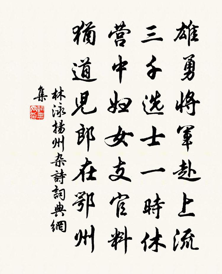 詩詞名句歷史字典書法欣賞書法字典國語詞典說文解字康熙字典古漢語字典標 題 作 者 詩 句 揚州雜詩作者:林泳 朝代:宋代揚州雜詩原文雄勇將軍赴上流,三千選士一時休。營中婦女支官料,猶道兒郎在鄂州。詩詞問答問:揚州雜詩的作者是誰?答:林泳問:揚州雜詩寫於哪個朝代?答:宋代林泳揚州雜詩書法欣賞揚州雜詩書法作品詩詞推薦將進酒·城下路賀鑄〔宋代〕城下路,淒風露,今人犁田古人墓。岸頭沙,帶蒹葭,漫漫昔時流水今人家。黃埃赤日長安道,倦客無漿馬無草。一翦梅(贈紫雲友)葛長庚〔宋代〕劍倚青天笛倚樓。雲影悠悠。鶴影悠悠。好同攜手上瀛洲。身在閻浮。業在閻浮。一段紅雲綠樹愁。今也休休。古送桓子之郢成禮孟浩然〔唐代〕聞君馳彩騎,躞蹀指南荊。為結潘楊好,言過鄢郢城。摽梅詩有贈,羔雁禮將行。今夜神仙女,應來感夢情。後庭怨王諲〔唐代〕君不見紅閨少女端正時,夭夭桃李仙容姿。幸得君王憐巧笑,披香殿里薦蛾眉。蛾眉雙雙人共進,常恐妾身從此擯偶成葛天民〔宋代〕始參龍象種,終現馬牛身。再整衝冠髻,難忘漉酒巾。散花天上女,撥草道中人。寄語林和靖,非翁不卜鄰。秦和十月二十四日初見雪呈相國元老邵雍〔宋代〕壬子初逢雪,未多仍卻晴。人間都變白,林下不勝清。寒士痛遭恐,窮民惡看驚。杯觴限新法,何故便能傾。漁父/漁歌子陸游〔宋代〕晴山滴翠水挼藍。聚散漁舟兩復三。橫埭北,斷橋南。側起船篷便作帆。奉和永豐殿下言志詩 十庾信〔南北朝〕披林求木實。拂雪就園蔬。濁醪非鶴髓。蘭餚異蟹蛆。野情風月曠。山心人事疎。徒知守瓴甓。空欲報璠璵。己卯十月一日至燕越五日罹狴犴有感而賦文天祥〔宋代〕風前泣燈影,日下泣霜花。鍾信忽然動,屋陰俄又斜。悶中聊度歲,夢裡尚還家。地獄何須問,人間見夜叉。路中口號皇甫曾〔唐代〕還鄉不見家,年老眼多淚。車馬上河橋,城中好天氣。舟中早起郭印〔宋代〕迤邐東方白,猶餘數點星。亂鴉啼古木,宿鷺起寒汀。日襯殘雲赤,煙含遠岫青。江山無限思,不覺是飄□。西江月(示忠彥)曹冠〔宋代〕秋霽姮娥二八,寒光逼散浮雲。小山叢桂吐清芬。猶帶蟾宮風韻。因念兩登仙籍,恩沾雨露方新。汝今妙歲已能文夏養真父輓詞張嵲〔宋代〕四十青春鬢未皤,翻如槁謝葉徉柯。親闈有彩今難戲,客館無魚尚有歌。遺愛偏存梅渚畔,新塋空占闔山阿。素車懷仁令陳德任新作占山亭二絕蘇軾〔宋代〕我是膠西舊使君。此山仍合與君分。故應竊比山中相,時作新詩寄白雲。謝池春陸游〔宋代〕賀監湖邊,初系放翁歸棹。小園林、時時醉倒。春眠驚起,聽啼鶯催曉。嘆功名、誤人勘笑。朱橋翠徑,不許京塵花飛引高似孫〔宋代〕花少思兮離離,企佳人兮不來。風嫋嫋兮吹愁,綠滿樹兮香在苔。鴃哀兮今歇。杳新知兮誰悅,期佳人兮柰何別。九月十日醵飲丹山陳著〔宋代〕舉頭又是菊花天,走遍山林命苟全。忍賦庚寅傷亂世,漫書甲子記流年。陶籬一醉虛拋久,蕭寺重遊夢覺然。今是孟子一暴十寒陳普〔宋代〕一粒微陽稍兆和,嚴凝莫奈雪霜多。天人勝負為消長,造物其如所息何。用舊韻送魯元翰知洺州蘇軾〔宋代〕我在東坡下,躬耕三畝園。君為尚書郎,坐擁百吏繁。鳴蛙與鼓吹,等是俗物喧。永謝十年舊,老死三家村。惟君許州題德星亭薛能〔唐代〕瀵水南流東有堤,堤邊亭是武陵溪。槎松配石堪僧坐,蕊杏含春欲鳥啼。高樹月生滄海外,遠郊山在夕陽西。頻來名句推薦守分安命,順時聽天。朱柏廬《朱子家訓·全文》 半生已分孤眠過,山枕檀痕涴。納蘭性德《虞美人·曲闌深處重相見》 盡做舊愁都忘卻,新愁何處著王庭筠《謁金門·雙喜鵲》 赤壁磯頭落照,肥水橋邊衰草,渺渺喚人愁張孝祥《水調歌頭·和龐佑父》 崑山玉碎鳳凰叫,芙蓉泣露香蘭笑。李賀《李憑箜篌引》 暮雨相呼失,寒塘欲下遲。崔塗《孤雁二首·其二》 棠梨花映白楊樹,儘是死生別離處。白居易《寒食野望吟》 永豐西角荒園裡,盡日無人屬阿誰。白居易《楊柳枝二首》 心即理也。天下又有心外之事,心外之理乎王陽明《傳習錄·卷上·徐愛錄》 鏡水夜來秋月,如雪。溫庭筠《荷葉杯·鏡水夜來秋月》