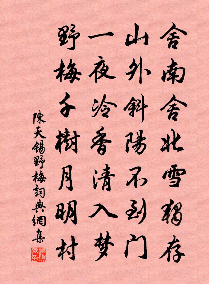 詩詞名句歷史字典書法欣賞書法字典國語詞典說文解字康熙字典古漢語字典標 題 作 者 詩 句 野梅作者:陳天錫 朝代:宋代野梅原文舍南舍北雪獨存,山外斜陽不到門。一夜冷香清入夢,野梅千樹月明村。詩詞問答問:野梅的作者是誰?答:陳天錫問:野梅寫於哪個朝代?答:宋代陳天錫野梅書法欣賞野梅書法作品詩詞推薦春日雜興方岳〔宋代〕春來多病感頹齡,草藥泥瓶不暫停。身似漏船難補貼,齒如改屐久凋零。炎黃豈解留年壽,莊老聊堪悅性靈。長劍陳明遠書塾與蔣平仲張伯成清話仇遠〔宋代〕霜晴泛渚狎輕鷗,人物欣逢古太丘。喬木故家猶昨日,寒花老圃正清秋。尊開北海心先醉,燭盡西窗話不休。笑我句蘄春鄉人〔宋代〕園客有絲難比瓮,鮫人無杼自成綃。次韻二首劉克莊〔宋代〕老懶尤於筆硯疏,難陪騎省賦閒居。去周柱下誰為史,傳鄴侯家尚有書。台饋不煩公粟肉,戶租難辦客車魚。側旁題朱伯勤千峰紫翠樓楊萬里〔宋代〕秀嶺西頭鳳嶺東,周曹略數一千峰。商量沒頓新樓處,頓著穠藍釅紫中。一色千峰翠作圍,忽然齊換紫綃衣。客來雪九首傅察〔宋代〕高堂連夜賞,蛾眉映珠櫳。誰憐閉門客,衣穿履亦空。紹興祀岳鎮海瀆四十三首佚名〔宋代〕瞻彼芒芒,日北之常。既高既厚,迺紀迺網。薦鬯伊始,靈示孔將。玄服鐵駕,覽此下方。野色范仲淹〔宋代〕非煙亦非霧,羃羃映樓台。白鳥忽點破,夕陽還照開。肯隨芳草歇,疑逐遠帆來。誰謂山公意,登高醉始回。頌古三十一首釋玿〔宋代〕明月大悲院裹齋,鐵圍山嶽盡沖開。豬頭象鼻,烏觜魚腮。石人撫掌呵呵笑,寒山拾得在天台。惜雙雙/惜分飛晁端禮〔宋代〕天上星杓春又到。應律管、微陽已報。暖信驚梅早。昨夜南枝,先得芳菲耗。遲日曈朧光破曉。馥繡幄、麝爐煙裊滿江紅(雙頭蓮)劉學箕〔宋代〕一柄雙花,低翠蓋、呈祥現美。人正在、薰風亭上,滿襟如水。二陸比方夸俊少,兩喬相併修容止。雨初晴、午永頌古十首釋法薰〔宋代〕冬來底事要商量,向道京師出大黃。多少病貓餐死鼠,日中抬首眼無光。登樓感事寄天台友人釋智圓〔宋代〕閒倚危欄思黯然,浮生誰共歡流年。愁催華發生無極,心許青山去有緣。冷談空江澄暮色,參差歸雁沒寒煙。吟餘句嚴大猷〔宋代〕笏未到身難擊泚,兵如入手易擒吳。程順子升齋吳泳〔宋代〕雨養焦谷牙,清晨勃然興,風入春筍節,一夕長數層。地道元敏樹,生意實可徵。一息不滋長,枯荄莽丘陵。所以挽時僉判王柏〔宋代〕靈辰不留兮,挽者何悲。羌茂行之皎皎兮,而今已而。惟孝友百行之首兮,何習俗之日醨。惟不虧其降衷兮,何足老嘆劉克莊〔宋代〕肘後奇書懶更開,只今年鬢已相催。但聞方士騰空去,不見童男入海回。無藥能留炎帝在,有人曾哭老聃來。醉鄉出東林六七里望廬山錢載〔清代〕連峰出云云半開,奔渠卷雪響春雷。雲中屈曲明如玉,都是天池頂瀉來。送汪莊仲赴江東倉幕強仲荊門簽判樓鑰〔宋代〕不見適齋老,於今三四秋。弟兄登宦路,親黨駐行舟。老病無詩思,衰懷重別愁。外家門戶盛,勉力紹箕裘。送呂武仲司戶范純之司法赴南宮試袁說友〔宋代〕欣然願作送行詩,盛事江邦獨見之。釃酒且同明月醉,驅車未怕朔風吹。相逢暫入紅蓮幕,穩去高攀丹桂枝。莫負名句推薦此地朝來餞行者,翻向此中牧征馬。孟浩然《高陽池送朱二》 用國者,得百姓之力者富,得百姓之死者強,得百姓之譽者榮。荀子《荀子·王霸》 天際兩蛾凝黛,愁與恨、幾時極。韓元吉《霜天曉角·題採石蛾眉亭》 沾衣欲濕杏花雨,吹面不寒楊柳風。志南《絕句》 親愛我,孝何難。親憎我,孝方賢。李毓秀《弟子規·入則孝》 中庭月色正清明,無數楊花過無影。張先《木蘭花·乙卯吳興寒食》 將軍玉帳貂鼠衣,手持酒杯看雪飛。劉基《北風行》 巧媳婦煮不得沒米粥馮夢龍《警世通言·卷十二》 有約不來過夜半,閒敲棋子落燈花。趙師秀《約客》 陽春布德澤,萬物生光輝。佚名《長歌行》