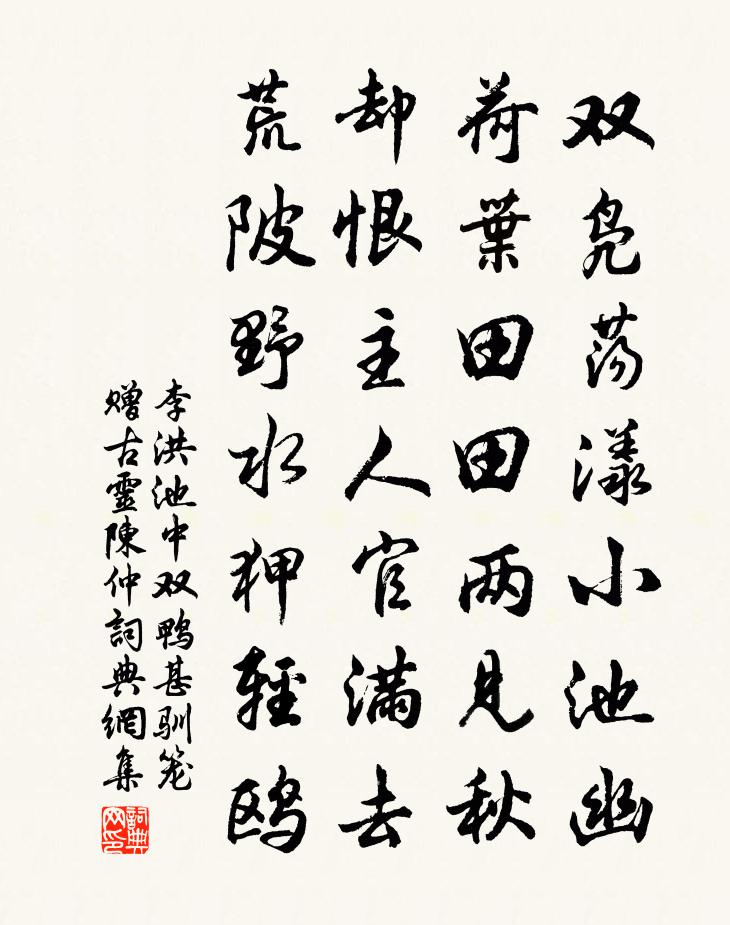 詩詞名句歷史字典書法欣賞書法字典國語詞典說文解字康熙字典古漢語字典標 題 作 者 詩 句 池中雙鴨甚馴籠贈古靈陳仲作者:李洪 朝代:宋代池中雙鴨甚馴籠贈古靈陳仲原文雙鳧蕩漾小池幽,荷葉田田兩見秋。卻恨主人官滿去,荒陂野水狎輕鷗。詩詞問答問:池中雙鴨甚馴籠贈古靈陳仲的作者是誰?答:李洪問:池中雙鴨甚馴籠贈古靈陳仲寫於哪個朝代?答:宋代李洪池中雙鴨甚馴籠贈古靈陳仲書法欣賞池中雙鴨甚馴籠贈古靈陳仲書法作品詩詞推薦滸以秋蘭一盆為供戴復古〔宋代〕吾兒來侍側,供我一秋蘭。蕭然出塵姿,能禁風露寒。移根自岩壑,歸我几案間。養之以水石,副之以小山。儼如菩薩蠻郭應祥〔宋代〕牡丹已過酴醿謝。那堪風雨連朝夜。底事最堪悲。春歸人未歸。春宜留取住。人卻推將去。早晚遂江濱。歡然夸尹夏日睡起白玉蟾〔宋代〕圓玉響中銷日永,鏗金徽外作風悲。萬蟻戰酣山雨至,飢腸雷動且吟詩。題福佑王廟王淮〔宋代〕關中失鹿人爭逐,一去鴻門不可尋。千古英雄死遺恨,封侯廟食更何心。苕霅歌釋文珦〔宋代〕昔聞兩溪水色異,苕清霅渾猶渭涇。又聞發源自天目,懸高墜峻如建瓴。日夜滾滾流不止,盡過白蘋紅蓼汀。流入答翰林蘇學士宋祁〔宋代〕開顏忽見故人書,並得雕章念索居。自是犧尊憶溝水,敢將吾笠望卿車。流年遂往蹉跎在,末路雖還連蹇餘。彈飾緣識宋太宗〔宋代〕耳根清靜本來修,萬法從心不外求。海岳動搖山色異,玄珠盡在眼中收。持齋道士尋紅葉,醉臥仙人未白頭。麋鹿送圓載上人歸日本國皮日休〔唐代〕講殿談餘著賜衣,椰帆卻返舊禪扉。貝多紙上經文動,如意瓶中佛爪飛。颶母影邊持戒宿,波神宮裡受齋歸。家山望孤石詩鮑照〔南北朝〕江南多暖石。雜樹茂寒峯。朱華抱白雲。陽條熙朔風。蚌節流綺藻。輝石亂煙虹。泄雲去無極。馳波往不窮。嘯歌趙和宗輓詩三首曹彥約〔宋代〕匯水夸同邑,桐江事事賢。骨寒誰與地,言重卻箋天。遊宦常千里,歸來共一川。西門今日路,忍淚入資延。書懷陸游〔宋代〕蕭颯先秋鬢,龍鍾未死身。不惟今日老,已是一生貧。食菜從兒瘦,關門任客嗔。世間餘一念,河雒尚胡塵。州城西園入齋祠社陳叔達〔唐代〕升壇預潔祀,詰早肅分司。達氣風霜積,登光日色遲。農教先八政,陽和秩四時。祈年服垂冕,告幣動褰帷。瘞地贊黃檗和尚釋法薰〔宋代〕破布裹真珠,古寺甘守拙。與裴國安名,對百丈吐舌。棒頭敲出小廝兒,卻向大愚言下瞥。瞥不瞥,返遭一掌如何頌古一○一首釋子淳〔宋代〕門頭戶尾事千差,了盡猶來未到家。明月堂前無影木,嚴凝雪夜正開花。和東林湛堂禪師喜雪韻五首袁燮〔宋代〕去歲寒雲久積陰,四郊雪片臘中深。今年一稔民安業,老守區區慰此心。效王仲至少監詠姚花用其韻四首黃庭堅〔宋代〕湯沐冰肌照春色,海牛壓簾風不開。直言紅塵無路入,猶傍蜂須蝶翅來。秋日登樓李新〔宋代〕濃掃清陰壑秋,眼光新糊塗仲宣樓。等閒欲作東山醉,卻為蒼生不破愁。夏日梅雨中寄睦公齊己〔唐代〕梅月來林寺,冥冥各閉門。已應雙履跡,全沒亂雲根。琢句心無味,看經眼亦昏。何時見清霽,招我憑岩軒。蘆花道人換被圖王冕〔元代〕高昌野人見幾早,發須不待秋風老。脫身放浪煙水間,富貴功名盡除掃。坐對漁翁交有道,青綾何似蘆花好?從時水雲園池盧方春〔宋代〕貪山上水樓,一望一層秋。幽抱發朗詠,驚飛雙白鷗。斯文今寂寞,諸老舊風流。漁者亦樂此,扣舷清夜遊。名句推薦幽微靈秀地,無可奈何天。曹雪芹《紅樓夢·第五回》 窗含西嶺千秋雪,門泊東吳萬里船。杜甫《絕句》 雲外好呼南去雁,系書先為報江鄉。齊之鸞《九日登清水營城》 遊人記得承平事,暗喜風光似昔年。韋莊《長安清明》 蟲有虺者,一身兩口,爭食相齕遂相殺也,人臣之爭事而亡其國者,皆虺類也。韓非及後人《韓非子·說林下》 必得之事,不足賴也;必諾之言,不足信也。管仲《管子·形勢》 銜霜當路發,映雪擬寒開。何遜《詠早梅 / 揚州法曹梅花盛開》 謂誰朝來不作意,狂風挽斷最長條。杜甫《絕句漫興九首·其一》 多言數窮,不如守中。老子《老子·道經·第五章》 木落雁南度,北風江上寒。孟浩然《早寒江上有懷 / 早寒有懷 / 江上思歸》