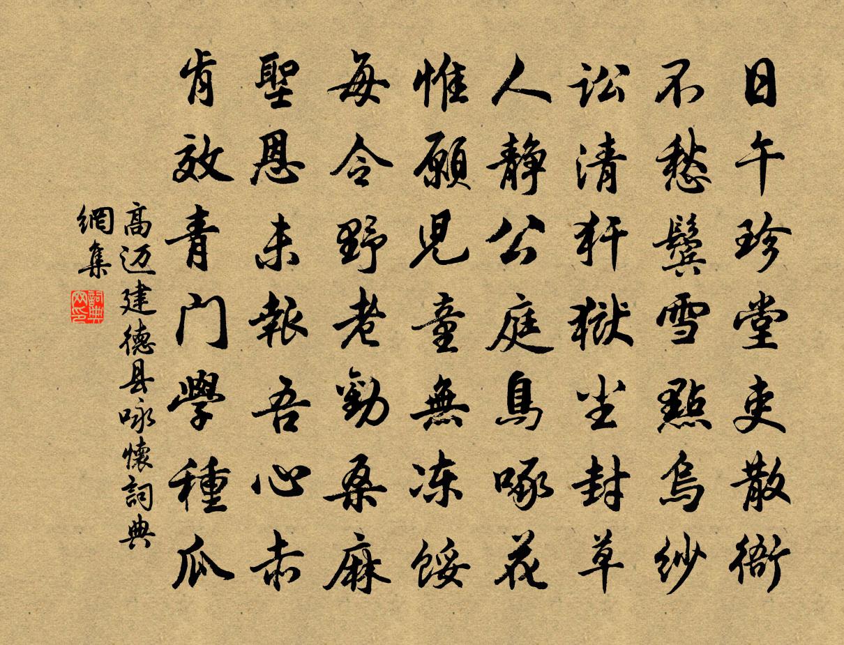 詩詞名句歷史字典書法欣賞書法字典國語詞典說文解字康熙字典古漢語字典標 題 作 者 詩 句 建德縣詠懷作者:高邁 朝代:宋代建德縣詠懷原文日午珍堂吏散衙,不愁鬢雪點烏紗。訟清犴獄塵封草,人靜公庭鳥啄花。惟願兒童無凍餒,每令野老勸桑麻。聖恩未報吾心赤,肯效青門學種瓜。詩詞問答問:建德縣詠懷的作者是誰?答:高邁問:建德縣詠懷寫於哪個朝代?答:宋代高邁建德縣詠懷書法欣賞建德縣詠懷書法作品詩詞推薦偈頌七十六首釋師範〔宋代〕指天指地弄精魂,只為生來無腦門。韶石一棒打不殺,至今恩愛俱成冤。正當四月八,底事與誰論。門外千峰萬峰故人家陳杰〔宋代〕蓬頭歷齒王霸子,葛帔練裙任昉兒。世緒何妨有凋落,若敖羊舌正堪悲。忽見檳榔詩庾信〔南北朝〕綠房千子熟。紫穗百花開。莫言行萬里。曾經相識來。漁父吳鎮〔元代〕重整絲綸欲掉船。江頭新月正明圓。酒瓶倒,岸花懸。拋卻漁竿和月句李白〔唐代〕野禽啼杜宇,山蝶舞莊周。 書窗梅花數枝病起再見瓶中盛開因作王洋〔宋代〕書堂籬落冷如灰,十日相忘亦自猜。初訝凍枝無艷脈,那知寒室自花開。銅瓶結實元非種,蔀屋迎春似有媒。方信檢覆葉縣魯山田李晉卿餞於首山寺留別梅堯臣〔宋代〕我本山水鄉,看山常不足。自從到官來,塵事便拘束。嘗聞此山寺,法宇深雲木。無由一來過,夢想向岩谷。按田壽安雜詩十首壽安雜詩十首神林從二首司馬光〔宋代〕雞幘奇峰雲外橫,青壁行尋不可上。卻羨樵兒輕險峽,腰繩操斧長來往。冬至節假賦愁陰喜霽黃彥平〔宋代〕愛日明朝至,寒雲此夕同。預知鴉啄雪,先驗鳥呼風。鄉國追隨外,年華感嘆中。清愁將濁酒。斟酌並成空。偈三十五首釋祖珍〔宋代〕岩谷相從始晏然,又攜瓶錫應時緣。奉川此去無多遠,興發何妨訪戴船。楊岐和尚贊釋慧遠〔宋代〕劄楊岐,獨腳寨。嚇臨濟,小廝兒。栗棘金圈輸貸價,土曠和人稀賣與誰。只將破草鞵泥彈子,向十字街頭換得眼送天雄監兵李中吉宋祁〔宋代〕督府監軍重,清時握節榮。長雲抱漢壘,殘月偃邊兵。戍霧漁撾疊,衢風鶴蓋平。不應煩暑路,河朔趁飛觥。句楊潛〔宋代〕烘日淺深色。酬裴相公題興化小池見招長句白居易〔唐代〕為愛小塘招散客,不嫌老監與新詩。山公倒載無妨學,范蠡扁舟未要追。蓬斷偶飄桃李徑,鷗驚誤拂鳳凰池。敢辭即事虞儔〔宋代〕天末孤鴻遠,園荒一徑深。畦蔬供小摘,家釀慰孤斟。齋日渾無事,春天故作陰。濬池兼插柳,取次見吾心。題柴言山水陸游〔宋代〕草亭臨峭絕,霜嶂起嶙峋。危磴儻可上,老夫思卜鄰。和子華招潞公暑飲司馬光〔宋代〕朱門近在府園樂,杖屢過從跬步中。避暑連翩投轄宴,析酲蕭灑滿襟風。閒來高韻渾如鶴,醉里朱顏卻變童。剪燭出郭陳造〔宋代〕對花不領幾柳下,以詩自苦如東野。今年陡覺負芳時,狎興蕭條殊曩者。西湖南園怳入夢,漫道尻輪神作馬。可堪竹溪惠白雕三絕劉克莊〔宋代〕白雪通身潔,丹砂傅頂紅。贈余有深意,鷳義與閒通。徹雲澗鄭露〔唐代〕延綿不可窮,寒光徹雲際。落石早雷鳴,濺空春雨細。名句推薦行多有病住無糧,萬里還鄉未到鄉。盧綸《逢病軍人》 青出於藍而勝於藍程登吉《幼學瓊林·卷二·師生》 露清枕簟藕花香,恨悠揚。顧敻《虞美人·觸簾風送景陽鍾》 玉可碎而不可改其白,竹可焚而不可毀其節。羅貫中《三國演義·第七十六回》 地白風色寒,雪花大如手。李白《嘲王歷陽不肯飲酒》 突營射殺呼延將,獨領殘兵千騎歸。李白《從軍行》 掛席幾千里,名山都未逢。孟浩然《晚泊潯陽望廬山》 不力行,但學文。長浮華,成何人。李毓秀《弟子規·餘力學文》 君是南山遺愛守,我為劍外思歸客。蘇軾《滿江紅·江漢西來》 數里黃沙行客路,不堪回首思秦原。周朴《春日秦國懷古》