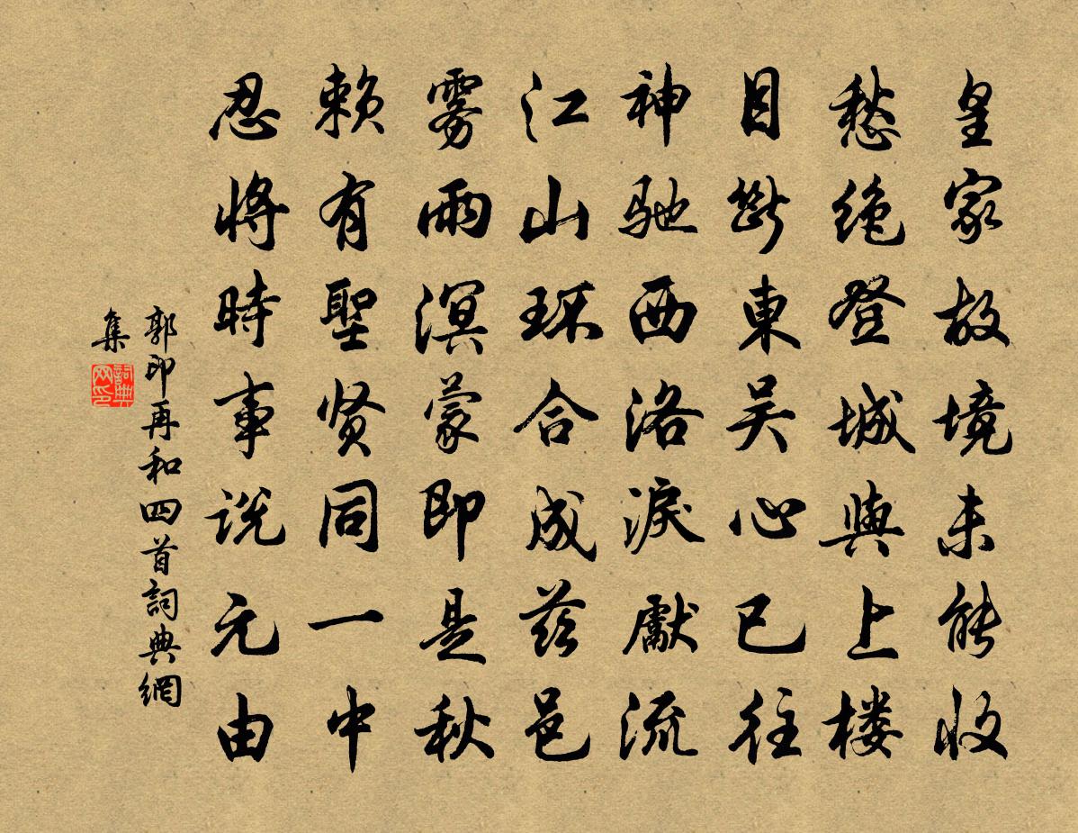 詩詞名句歷史字典書法欣賞書法字典國語詞典說文解字康熙字典古漢語字典標 題 作 者 詩 句 再和四首作者:郭印 朝代:宋代再和四首原文皇家故境未能收,愁絕登城與上樓。目斷東吳心已往,神馳西洛淚先流。江山環合成茲邑,霧雨溟濛即是秋。賴有聖賢同一中,忍將時事說元由。詩詞問答問:再和四首的作者是誰?答:郭印問:再和四首寫於哪個朝代?答:宋代郭印再和四首書法欣賞再和四首書法作品詩詞推薦西江月姜特立〔宋代〕富貴從來自有,人生最羨長年。駸駸八秩未華顛。更喜此身強健。金印新來如斗,絲綸御墨猶鮮。棗如瓜大藕如船答寄廣信六弟韓維〔宋代〕才見高帆落歸艑,又攜輕劍逐戎麾。步兵廚里仍多酒,王粲軍中不廢詩。絕塞風煙通夕靜,近關榆柳識春遲。花時與福州滿禪人釋正覺〔宋代〕而今別後記丁寧,曹洞家風句未形。月滿鳳林寒不夢,年深龜殼灼猶靈。沈沈莫觸蛇頭毒,的的須明犀角星。便與種說山居李復〔宋代〕隱君欒葉為清門,誅茅卜築歲已深。池影青蒼山墮地,松枝夭矯龍出林。六月取冰自鑿谷,百壺進酒不論金。阮生上游參預壽二首程公許〔宋代〕並生覆載間,肖翹無小大。陰陽所發舒,榮瘁各變態。若為壽命獨,劂有松柏檜。鬱郁被澗阿,童童狀車蓋。神明湖邊曉行陸游〔宋代〕蹇驢清曉掠湖堤,緩轡迎涼帽影低。露拆渚蓮紅漸鬧,雨催陂稻綠初齊。先秋葉已時時墮,失旦雞猶續續啼。不是晴後棄雪四首楊萬里〔宋代〕天上瓊樓萬玉妃,月宮學舞試雲衣。霓裳未徹天風起,腦子花鈿星散飛。簡雪窗重寺丞周端臣〔宋代〕聖賢事業在心槃,禹稷顏回豈異觀。世故波潤同起減,姓名千古要清寒。贈夏宗禹真德秀〔宋代〕虎頭自合取侯封,好為明時立雋功。做了玉關班定遠,卻陪芝嶺夏黃公。山居詩釋延壽〔宋代〕得喪從來事甚均,任緣徒用苦勞神。野蔬隨分堪充口,石室依稀中庇身。碧海幾時無去棹,舉世渾成無事人。若教辱井項安世〔宋代〕寺前蔬圃是台城,寺後寒泉入柳營。玉甃多年無舊物,銀瓶終日有哀聲。游童走卒爭嗤點,弱水貧泉共姓名。不似漢陽太白樓李群玉〔唐代〕江上層樓翠靄間,滿簾春水滿窗山。青楓綠草將愁去,遠入吳雲暝不還。晨起觀雪趙蕃〔宋代〕荒雞號何多,鄰犬吠愈悍。初迷紙窗隙,旋失布衾暖。呼童戶先啟,走報雪且滿。為言果羞明,若爾真待伴。須臾句周洙〔宋代〕憑君點數西南景,枕上觀山有幾州。出郊趙汝績〔宋代〕難得晴如許,春遊第一番。鳥啼花底樹,雲裹面前山。馬躍平沙地,帆投落日村。戲呼漁子問,吾與汝誰閒。導引佚名〔宋代〕帝皇盛烈,教孝謹民常。嚴父位明堂。管絲金石含天韻,籩豆薦芬芳。肅然音響靈來下,容與動祥光。四方內外交時事王鎡〔宋代〕羽書飛報南州捷,百萬戎師盡轉官。豪傑危中成事易,規模狹處濟時難。雲生殺氣雕旗暗,風肅軍聲虎帳寒。何日種荔枝核有感李若水〔宋代〕荔子欲傳種,他年養老饕。試將千顆植,已喜寸萌高。豈耐雪霜苦,空慚澆灌勞。何殊茂陵客,藏核種蟠桃。淳化五年秋八月二十四日鉅鹿魏野江東僧用晦魏野〔宋代〕危城閒登臨,秋色際空碧。四顧廊且平,萬慮忽然釋。精誠日月暗,曠達天地窄。壯節但孤聳,憤氣欲四射。鹽穴瑞鶴仙(壽上饒倅洪莘之,時攝郡事,且將赴漕事)辛棄疾〔宋代〕黃金堆到斗。怎得似、長年畫堂勸酒。蛾眉最明秀。向水沈煙里,兩行紅袖。笙歌撋就。爭說道、明年時候。被姮名句推薦郁孤台下清江水,中間多少行人淚?辛棄疾《菩薩蠻·書江西造口壁》 感之欲嘆息,對酒還自傾。李白《春日醉起言志》 不枉東風吹客淚。相思難表,夢魂無據,惟有歸來是。歐陽修《青玉案·一年春事都來幾》 黃河萬里觸山動,盤渦轂轉秦地雷。李白《西嶽雲台歌送丹丘子》 青春須早為,豈能長少年。孟郊《勸學》 兒女紛紛夸結束,新樣釵符艾虎。劉克莊《賀新郎·端午》 半壁見海日,空中聞天雞。李白《夢遊天姥吟留別 / 別東魯諸公》 芳菲歇去何須恨,夏木陰陰正可人。秦觀《三月晦日偶題》 話須通俗方傳遠,語必關風始動人。馮夢龍《警世通言·卷十二》 雪霜凌厲而見殺,來歲不改其性也黃庭堅《書幽芳亭記》