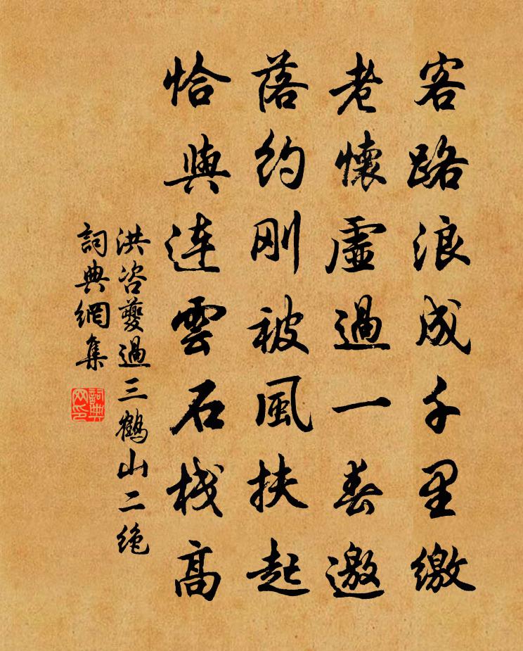 詩詞名句歷史字典書法欣賞書法字典國語詞典說文解字康熙字典古漢語字典標 題 作 者 詩 句 過三鶴山二絕作者:洪咨夔 朝代:宋代過三鶴山二絕原文客路浪成千里繳,老懷虛過一春邀。落約剛被風扶起,恰與連雲石棧高。詩詞問答問:過三鶴山二絕的作者是誰?答:洪咨夔問:過三鶴山二絕寫於哪個朝代?答:宋代洪咨夔過三鶴山二絕書法欣賞過三鶴山二絕書法作品詩詞推薦題盱胎軍東南第一山二首楊萬里〔宋代〕第一山頭第一亭,聞名未到負平生。不因王事略小出,那得高人同此行。萬里中原青未了,半篙淮水碧無情。登臨題山谷居士書坡公帖袁說友〔宋代〕當年二老嘆云云,猶喜坡翁返故鄉。展卷如今但陳跡,丘原無復起蘇黃。示禪人釋慧遠〔宋代〕懸崖捉拍舞三台,死虎驚忙眼豁開。聖地不生凡草木,果然親見瞎堂來。送李季允侍郎歸蜀五絕用禪房花竹幽為韻劉宰〔宋代〕密葉秋逾潤,幽花晚更妍。去來誰是主,試問白頭禪。句許玠〔宋代〕苔封曲徑無人到。十日西過永濟橋邵雍〔宋代〕十日西行過永濟,時時細雨濕衫衣。多情會得山神意,猶恐行人欠翠微。八月十六日見梅文天祥〔宋代〕廣寒殿里玉樓開,那得孤山處士來。半夜西風半身影,夢中騎得雪驢回。送耕甫弟赴補杜范〔宋代〕所性常存存,危者惟人心。子才秀吾宗,一歕凡馬喑。俊快恐易蹶,謹勿輕千金。賢關集多士,轡策方駸駸。功名次韻汪卿方岳〔宋代〕霜洗梅花春滿握,夜寒吹老城頭角。瑣窗硯作離騷香,吐句不教花莫落。裁量要是修月手,我欲追隨慚筆閣。平生道山座主先生平章呂公輓歌辭五首方回〔宋代〕乃公同此老,兩柱共擎天。初作二千石,才生十九年。漢陽□最大,嶺外帥何緣。極恨湖濱相,奸臣喜弄權。菩薩蠻趙希蓬〔宋代〕何人四座環歌扇。平生有限何曾見。今日忽遭逢,流霞映臉紅。此恨憑誰語,夢逐巫山去。對景苦奔波,其如愁思酬蘇員外味道夏晚寓直省中見贈沈佺期〔唐代〕並命登仙閣,分曹直禮闈。大官供宿膳,侍史護朝衣。卷幔天河入,開窗月露微。小池殘暑退,高樹早涼歸。冠劍春望林滋〔唐代〕春海鏡長天,青郊麗上年。林光虛霽曉,山翠薄晴煙。氣暖禽聲變,風恬草色鮮。散襟披石磴,韶景自深憐。別李季蘭朱放〔唐代〕古岸新花開一枝,岸傍花下有分離。莫將羅袖拂花落,便是行人腸斷時。送呂知常赴太和丞黃庭堅〔宋代〕我去太和欲期矣,呂君初得太和官。邑中亦有文字樂,惜不同君澗谷盤。觀山千尺夜泉落,快閣六月江風寒。往尋諫院台省語佚名〔唐代〕遺補相惜,御史相憎,郎官相輕。酬王侍御鮑溶〔唐代〕慚非青玉制,故以贈仙郎。希冀留書閤,提攜在筆床。詎能輝繡服,安得似芸香。所報何珍重,清明勝夜光。四犯令侯置〔宋代〕月破輕雲天淡注。夜悄花無語。莫聽陽關牽離緒。拚酩酊、花深處。明日江郊芳草路。春逐行人去。不似酴醿開獨五鼓孔武仲〔宋代〕夜枕回遠夢,北窗覺微明。遙知扶桑曲,萬頃搖光晶。江海已瀺灂,魚龍俱震驚。大哉陽德敏,頃刻周四溟。天星應潮井馬之純〔宋代〕俯看滄海仰看山,相去分明霄壤間。有井無冬亦無夏,與潮俱往又俱還。想應透徹深無底,怪得浮沉轉似環。不用名句推薦昨日春如,十三女兒學繡。辛棄疾《粉蝶兒·和趙晉臣敷文賦落花》 冥冥寒食雨,客意向誰親?劉一止《冥冥寒食雨》 仁人之事者,必務求興天下之利,除天下之害。墨子《墨子·16章 兼愛(下)》 睡起莞然成獨笑,數聲漁笛在滄浪。蔡確《夏日登車蓋亭》 遙看孟津河,楊柳郁婆娑。佚名《折楊柳歌辭五首》 波面澄霞,蘭艇采香去。高觀國《祝英台近·荷花》 漢家天子今神武,不肯和親歸去來。王之渙《涼州詞二首》 三山半落青天外,二水中分白鷺洲李白《登金陵鳳凰台》 兒不嫌母醜,狗不嫌家貧。佚名《增廣賢文·下集》 一恕字是接物之要,所以終身可行也。王永彬《圍爐夜話·第六則》