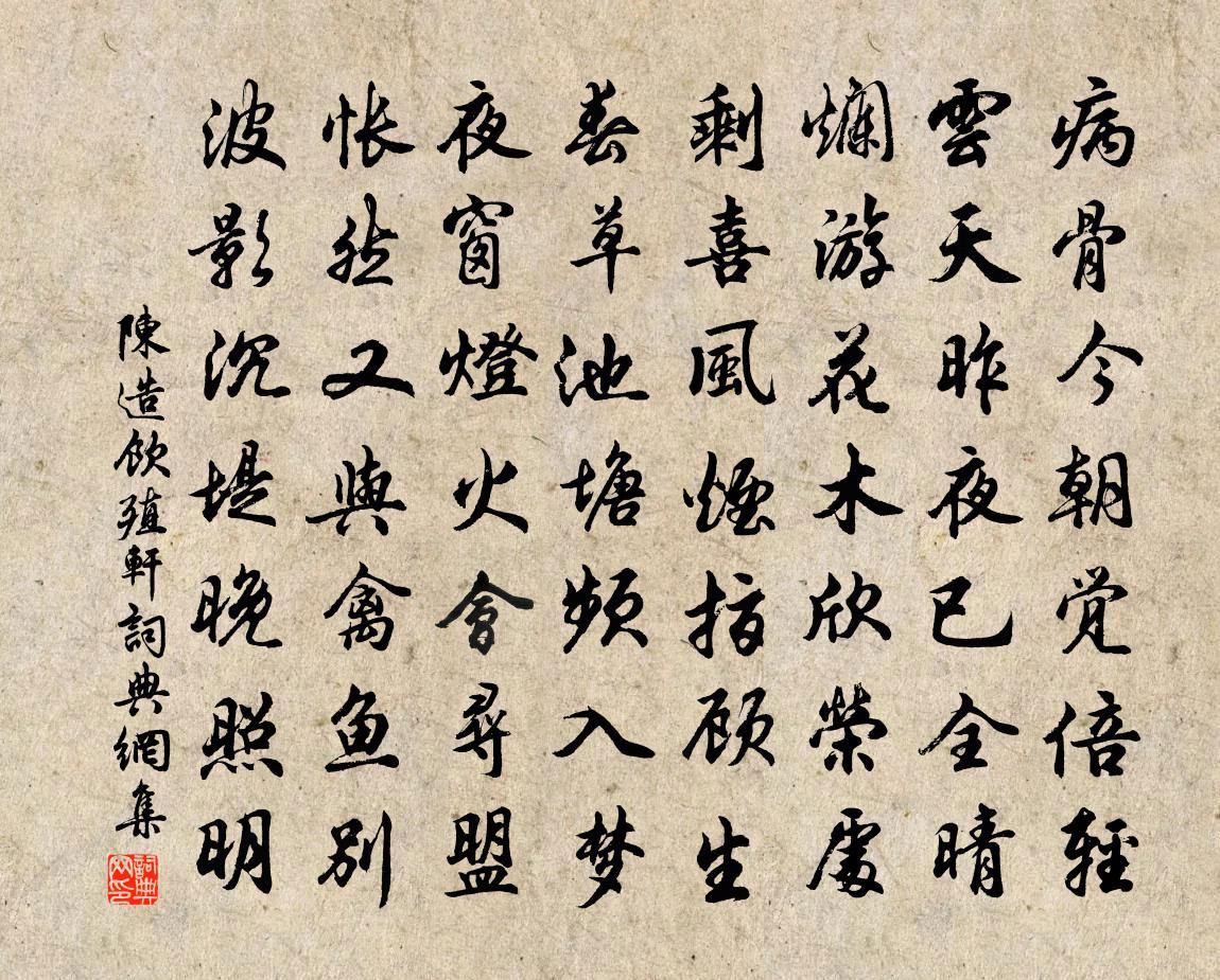詩詞名句歷史字典書法欣賞書法字典國語詞典說文解字康熙字典古漢語字典標 題 作 者 詩 句 飲殖軒作者:陳造 朝代:宋代飲殖軒原文病骨今朝覺倍輕,雲天昨夜已全晴。爛游花木欣榮處,剩喜風煙指顧生。春草池塘頻入夢,夜窗燈火會尋盟。悵然又與禽魚別,波影沉堤晚照明。詩詞問答問:飲殖軒的作者是誰?答:陳造問:飲殖軒寫於哪個朝代?答:宋代陳造飲殖軒書法欣賞飲殖軒書法作品詩詞推薦冬節日疾作不能親祀事但具禮不拜戲作示內王洋〔宋代〕他鄉易感歲時侵,病入衰骸苦不禁。臥聽兒孫羞栗脯,倦依爐火只愁吟。房無肥腯牲三俎,幕有聲香酒數斟。苦與靈岩寺偃松一首蘇籀〔宋代〕直哉狗十尋乾,狗亭亭無附狗枝。紆哉獨縱肆,蟠據何離奇。垂髯郁千霜,蛟臂犀兕皮。揉剛為謙屈,至高而聽卑梅詹初〔宋代〕萬木枯歲晚,寒梅獨不移。幽香對白雪,清景月明時。菊花新葛長庚〔宋代〕念我東皇大帝兒。是操觚弄翰之職。飛落塵寰,似此度,算應希。向這裡。安能便、策景御氣。灰頭土面、千河水宜甫家有金鈴菊客未這識因代菊贈宜甫司馬光〔宋代〕主人倦邀客,寂寞委蒼苔。此日開無益,明年不復開。無題馮小青〔明代〕冷雨幽窗不可聽,挑燈閒看牡丹亭。人間亦有痴於我,豈獨傷心是小青!中元作李商隱〔唐代〕絳節飄颻宮國來,中元朝拜上清回。羊權須得金條脫,溫嶠終虛玉鏡台。曾省驚眠聞雨過,不知迷路為花開。有娀憶母二首釋雲岫〔宋代〕天不高兮海不深,白雲飛處定關心。蒲鞋能上時人眼,那更西風葉落金。滿江紅 游南岩和范廓之韻辛棄疾〔宋代〕笑拍洪崖,問千丈、翠岩誰削?依舊是、西風白馬,北村南郭。似整復斜僧屋亂,欲吞還吐林煙薄。覺人間、萬事范奉議作西江月勸酒韓維〔宋代〕故里親交半柏城,坐中牢落似明星。雨多秋草荒三逕,零重寒花坼萬鈴。閒後並和詩筆廢,興來未放酒杯停。樽前偶成張耒〔宋代〕卻掃客不至,端為四國騷。杯寒薦園實,食儉煮溪毛。霜過橘柚熟,天晴鴻鵠高。幽齋高木近,不寢聽雞號。奉贈宣義大師英公李若拙〔宋代〕昔歲高名動九重,衡山別後碧雲空。紫袍親受龍墀上,白足頻登虎殿中。小篆每輕秦相法,隸書猶鄙晉臣功。多才朱明寺楊備〔宋代〕不悌爭分不義財,舊居金碧照樓台。何緣斗夜狂風雨,暗裡卻飛錢帛來。漁夫舞史浩〔宋代〕萬斛黃金迷俯仰。輕舠不礙飛雙槳。光透碧霄千萬丈。真堪賞。恰如鏡里人來往。書齋雪後趙嘏〔唐代〕擁褐坐茅檐,春晴喜初日。微風入桃徑,爽氣歸縹帙。頻時苦風雪,就景理巾櫛。樹暖高鳥來,窗閒曙雲出。鄉遙昭君怨(玩月)劉辰翁〔宋代〕月出東山之上。長憶御街人唱。恨我不能琴。有琴心。徙倚秋波平瑩。漸久玉肌清冷。待更下闌乾。起來看。周祀圜丘歌 登歌庾信〔南北朝〕歲之祥。國之陽。蒼靈敬。翠雲長。象為飾。龍為章。乘長日。坯蟄戶。烈雲漢。迎風雨。六呂歌。雲門舞。省滌春日感與有懷芳洲徐瑞〔宋代〕老去空驚歲月遒,桑榆雖晚尚堪疏。髮霜任自桃花笑,客間雖憑燕語留。勝地有緣頻入夢,清吟無與獨登樓。故人春晚書懷陸游〔宋代〕萬里西遊為覓詩,錦城更付一官痴。脫巾漉酒從人笑,拄笏看山頗自奇。疏雨池塘魚避釣,曉鶯窗戶客爭棋。老來次韻楊宰凌霄花陳造〔宋代〕高花笑屬賦花人,花自鮮明筆有神。可惜人間兩清絕,不教媚嫵對閒身。名句推薦驟雨過,珍珠亂撒,打遍新荷。元好問《驟雨打新荷》 知章騎馬似乘船,眼花落井水底眠杜甫《飲中八仙歌》 為者敗之,執者失之。老子《老子·道經·第二十九章》 何期今日酒,忽對故園花。文森《九日》 夜寒驚被薄,淚與燈花落納蘭性德《菩薩蠻·蕭蕭幾葉風兼雨》 白雲依靜渚,春草閉閒門。劉長卿《尋南溪常山道人隱居 / 尋南溪常道士》 誰愛風流高格調,共憐時世儉梳妝。秦韜玉《貧女》 金樽清酒斗十千,玉盤珍羞直萬錢。李白《行路難·其一》 以國為國,以天下為天下。劉向 編《六親五法》 天秋日正中,水碧無塵埃。柳宗元《湘口館瀟湘二水所會》