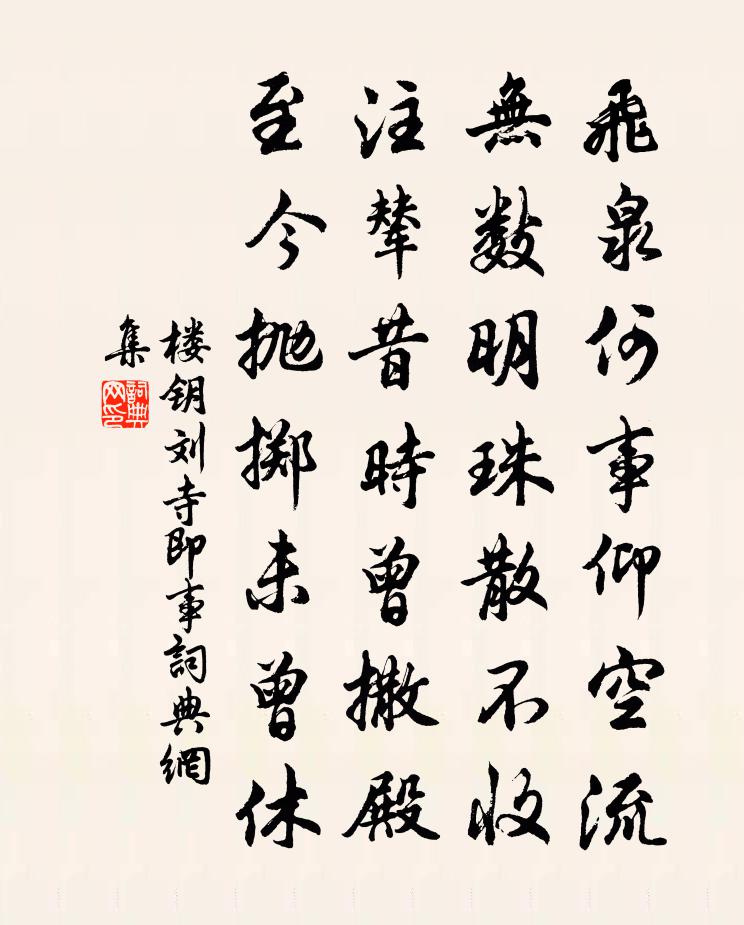 詩詞名句歷史字典書法欣賞書法字典國語詞典說文解字康熙字典古漢語字典標 題 作 者 詩 句 劉寺即事作者:樓鑰 朝代:宋代劉寺即事原文飛泉何事仰空流,無數明珠散不收。注輦昔時曾撒殿,至今拋擲未曾休。詩詞問答問:劉寺即事的作者是誰?答:樓鑰問:劉寺即事寫於哪個朝代?答:宋代樓鑰劉寺即事書法欣賞劉寺即事書法作品詩詞推薦送趙狀元赴湖州幕徐璣〔宋代〕玉陛傅臚曉,身居第一功。絕班知禮異,專局信儒崇。賢俊科名上,邦家事業中。規模垂廣遠,鼎鼐蓄含洪。更化贈禮部尚書唐質肅公輓詞二首王珪〔唐代〕偶歇延英對,如何遽不來。卹恩天子厚,遺直世人哀。路轉侵龍耳,星沈近斗魁。送車知幾乘,莫賦泰山頹。哭邢芻父六首蘇泂〔宋代〕太學三旬食,邢家萬事空。初頭才過我,半後已無公。惚恍扶床語,倉皇就木終。從今顏巷冷,寧復孔尊同。絕句張翬〔唐代〕茫茫煙水上,日暮陰雲飛。孤坐正愁緒,湖南誰搗衣。自江源過雙流不宿逕行之成都陸游〔宋代〕斷筰飄飄掛渡頭,臨江立馬喚漁舟。少城已破繁華夢,老境聊尋汗漫遊。斜日驛門雙堠立,早霜風葉一林秋。詩材喜從弟雪中遠至有作杜荀鶴〔唐代〕深山大雪懶開門,門逕行蹤自爾新。無酒禦寒雖寡況,有書供讀且資身。便均情愛同諸弟,莫更生疏似外人。晝短和吳侍御被使燕然盧照鄰〔唐代〕春歸龍塞北,騎指雁門垂。胡笳折楊柳,漢使采燕支。戍城聊一望,花雪幾參差。關山有新曲,應向笛中吹。芳庭為作希聖二字以詩謝之胡仲弓〔宋代〕貫休鐵畫天上奇,芳庭心法今似之。偃波垂露久不作,雲煙灑灑光陸離。北山塔穎健筆卓,西湖倒瀉為研池。長空琴書齋顧逢〔宋代〕不道鄴侯家,有人如伯牙。七弦真得趣,萬卷足生涯。石鼎時添火,銅瓶日換花。高山流水罷,筆下走龍蛇。題壁南陽驛婦〔宋代〕流落南來自可嗟,避人不敢御鉛華。卻憐當日鶯鶯事,獨立春風露鬢斜。偈頌二百零五首釋正覺〔宋代〕主中主,須辨取。動犯威嚴,細看規矩。貴不可得其名,壽不可窮其數。四溟潮落露仙山,萬里雲開廓天宇。西齋秋感二十首方回〔宋代〕寒士足奇士,貴人多俗人。俗人尚自可,盜賊乘風塵。子美客長安,悲歌驚鬼神。柄國者誰子,曲江近前嗔。逆臣夢中詠醉人蘇轍〔宋代〕城中醉人舞連臂,城外醉人相枕睡。此人心中未必空,暫爾頹然似無事。我生從來不解飲,終日騰騰少憂累。昔年本意和倪雲林原韻陳維崧〔清代〕風光三月連櫻筍,美人躊躇白日靜。小屏空翠颭東風,不見其餘見衫影。無端料峭春閨冷,忽憶青驄別鄉井。長將酹江月 賦濟南風景,和東坡韻張之翰〔元代〕南山北濟,算難盡、十二全齊風物。平地華峰天一柱,鵲倚岩岩青壁。金線橫波,真珠出水,趵突噴寒雪。無窮瀟陰晴不定簡唐覲秘校並敖吳二君五首蘇轍〔宋代〕西鄰豫章客,病骨瘦欒欒。清夜眠孤枕,終朝飽一簞。雨多愁不出,講罷未應餐。約我晴相過,門前泥欲乾。石限病起陳與義〔宋代〕幽人病起山深處,小院鴉鳴日午時。六尺屏風遮宴坐,一簾細雨獨題詩。九河嘆劉奉世〔宋代〕冀東皆禹跡,漸海觀朝宗。河陰漸淪沒,平沙盪無蹤。漢武築宣房,作歌稱成功。今塞商胡口,清流不時通。何當次韻張通判游釣隱園項安世〔宋代〕大家有寶初不靳,戲把兼金擲虛牝。小家尺寸入校量,澀縮支撐惟恐盡。張侯胸中無不有,詩未落手人已信。偶然舞曲歌辭白紵辭二首楊衡〔唐代〕玉纓翠佩雜輕羅,香汗微漬朱顏酡。為君起唱白紵歌,清聲裊雲思繁多,凝笳哀琴時相和。金壺半傾芳夜促,梁塵名句推薦嘆息此人去,蕭條徐泗空李白《經下邳圯橋懷張子房》 撩亂邊愁聽不盡,高高秋月照長城。王昌齡《從軍行七首》 美功不伐,貴位不善佚名《孔子家語·弟子行》 用之在於機,顯之在於勢。姜子牙《六韜·文韜·兵道》 近者不親,無務求遠墨子《墨子·02章 修身》 節用儲蓄,以備凶災范曄《後漢書·本紀·肅宗孝章帝紀》 綠樹暗長亭,幾把離尊,陽關常恨不堪聞。陸游《浪淘沙·丹陽浮玉亭席上作》 卻將萬字平戎策,換得東家種樹書。辛棄疾《鷓鴣天·有客慨然談功名因追念少年時事戲作》 國君好仁,天下無敵焉。孟子《孟子·盡心章句下·第四節》 秋至搗羅紈,淚滿未能開。江淹《悼室人》