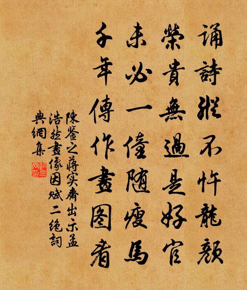 詩詞名句歷史字典書法欣賞書法字典國語詞典說文解字康熙字典古漢語字典標 題 作 者 詩 句 蔣實齋出示孟浩然畫像因賦二絕作者:陳鑒之 朝代:宋代原文誦詩縱不忤龍顏,榮貴無過是好官。未必一僮隨瘦馬,千年傳作畫圖看。詩詞問答問:《蔣實齋出示孟浩然畫像因賦二絕》的作者是誰?答:陳鑒之問:該詩寫於哪個朝代?答:宋代書法欣賞蔣實齋出示孟浩然畫像因賦二絕書法作品詩詞推薦武林書事九首方回〔宋代〕我有敝廬在何許,南紫陽山北黃山。煙耕雨釣付兒輩,一榻高枕松聲間。金剛隨機無盡頌無法可得分第二十二釋印肅〔宋代〕信知如是是,如是是非是。真如無是非,咄哉休瞌睡。寓直偶題王禹偁〔宋代〕兩朝書命媿無才,謾逐詞臣侍玉階。病似相如多避事,拙於方朔少詼諧。命奇只合先休退,道在何妨更卷懷。白首偈答百丈僧釋道常〔宋代〕不要三乘要祖宗,三乘不要與君同。君今欲會通宗會,後夜猿啼在亂峰。郊廟歌辭。享太廟樂章。舒和張說〔唐代〕六鍾翕協六變成,八佾徜徉八風生。樂九韶兮人神感,美七德兮天地清。呈尤侍郎陸禮部張鎡〔宋代〕今春少晴天,雨聲常綿延。曉來羲車展雲出,射我屋瓦生蒼煙。憶昔既冠時,壯志平幽燕。先王手扶太極起,餘事寄家人晁補之〔宋代〕孟光家世自清芬,鴻亦幽情慕隴雲。汲水輓車歸去好,茯苓日日長松根。清平樂·春風依舊趙令畤〔宋代〕春風依舊。著意隨堤柳。搓得蛾兒黃欲就。天氣清明時候。去年紫陌青門。今霄雨魄雲魂。斷送一生憔悴,只銷幾瑞鷓鴣晏殊〔宋代〕越娥紅淚泣朝雲。越梅從此學妖嚬。臘月初頭、庾嶺繁開後,特染妍華贈世人。前溪昨夜深深雪,朱顏不掩天真。答閻求仁黃庭堅〔宋代〕暮天攜手步河梁,把酒淹留斜日光。生當有別各異方,古人嗟此樂難當。大梁嬉遊少年場,春風花枝囀鸝黃。節物登延慶佛閣用出郊韻三首吳潛〔宋代〕東西南北幸同官,休作班荊解後看。一笑喜逢粳秫賤,相攀莫待菊茱殘。沙鷗點點投波沒,檐鵲聲聲帶日乾。美景東齋雜書陸游〔宋代〕有客可劇談,有酒可盡醉;老夫老更窮,終日惟坐睡。既無客款門,酒亦未易致。頹然北窗下,兀兀有餘味。摸魚子許有孚〔元代〕買陂塘旋栽楊柳,新來已見成務。小山叢桂人如玉,何用為云為雨。懷北渚。悵渺渺予懷,目斷游龍嶼。憑誰寄語留題微之廨中清輝閣王安石〔宋代〕故人名字在瀛洲,邂逅低徊向此留。鷗鳥一雙隨坐嘯,荷花十丈對冥搜。水涵樽俎清如洗,山染衣巾翠欲流。宣室病橘杜甫〔唐代〕群橘少生意,雖多亦奚為。惜哉結實小,酸澀如棠梨。剖之盡蠹蟲,采掇爽其宜。紛然不適口,豈只存其皮。蕭蕭楊尉三和篇補其二以為答不敢虛盛意李石〔宋代〕湖亭飲酒對新鵝,金錯杯中卷白波。村鼓冬冬更堪憶,畫船照水采菱歌。偈六十三首釋道寧〔宋代〕乾坤之內,宇宙之中,高懸舜日,大扇堯風。祝一人之壽算,祈萬世之穹隆。唯吾家佛子受賜頗多,物外優遊恁何挽妹婿汪汻四首許月卿〔宋代〕一疾那知死,三朝竟不醒。遺羹真慘愴,分肉尚精明。玉樹衣難彩,壁岩氈枉青。英魂千古在,稚子讀書聲。偈頌九十三首釋梵琮〔宋代〕無生國,路不遙。豁開功德歲,提起般若刀。百寶光中垂雨露,五須彌頂鼓波濤。還源無別旨,今日與明朝。雲間喜李詡秀才見訪因贈許渾〔唐代〕浙南分首日,誰謂別經時。路遠遙相訪,家貧喜見知。不須辭不酌,更請續新詩。但得心中劍,酬恩會有期。名句推薦翻空白鳥時時見,照水紅蕖細細香。蘇軾《鷓鴣天·林斷山明竹隱牆》 流水便隨春遠,行雲終與誰同。晏幾道《臨江仙·鬥草階前初見》 夜市賣菱藕,春船載綺羅。杜荀鶴《送人游吳》 欲吊沉累無所,但有漁兒樵子,哀此寫離憂。張孝祥《水調歌頭·過岳陽樓作》 山遠翠眉長。高處淒涼。菊花清瘦杜秋娘。吳文英《浪淘沙·九日從吳見山覓酒》 死者不可再生,用法務在寬簡。吳兢《貞觀政要·卷八·論刑法》 回眸一笑百媚生,六宮粉黛無顏色。白居易《長恨歌》 任你官清似水,難逃吏滑如油。馮夢龍《醒世恆言·卷二十》 謫仙何處,無人伴我白螺杯。黃庭堅《水調歌頭·遊覽》 映階碧草自春色,隔葉黃鸝空好音。杜甫《蜀相》