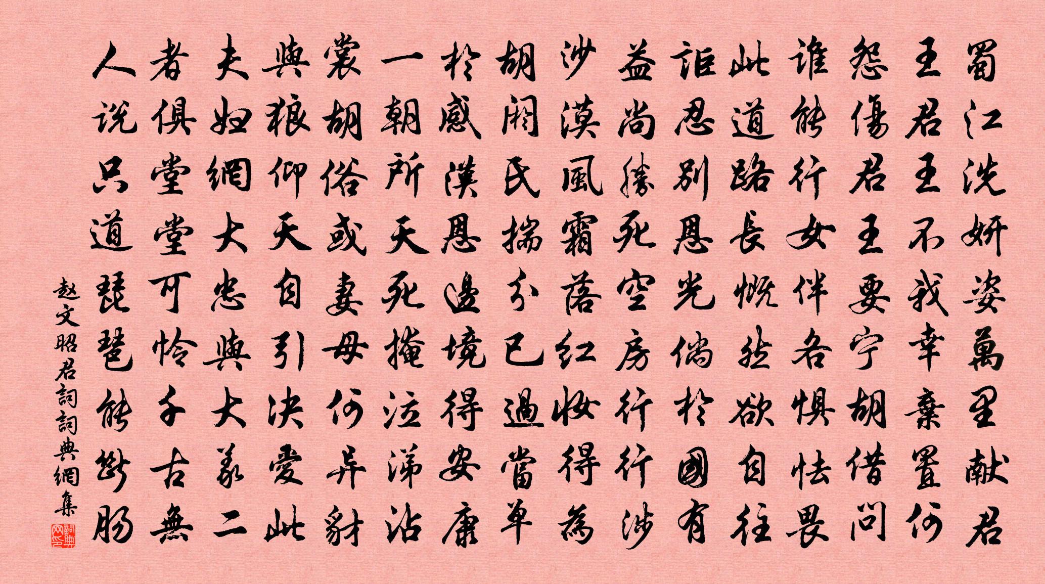 詩詞名句歷史字典書法欣賞書法字典國語詞典說文解字康熙字典古漢語字典標 題 作 者 詩 句 昭君詞作者:趙文 朝代:宋代昭君詞原文蜀江洗妍姿,萬里獻君王。君王不我幸,棄置何怨傷。君王要寧胡,借問誰能行。女伴各懼怯,畏此道路長。慨然欲自往,詎忍別恩光。倘於國有益,尚勝死空房。行行涉沙漠,風霜落紅妝。得為胡閼氏,揣分已過當。單于感漢恩,邊境得安康。一朝所天死,掩泣涕沾裳。胡俗或妻母,何異豺與狼。仰天自引決,愛此夫婦網。大忠與大義,二者俱堂堂。可憐千古無人說,只道琵琶能斷腸。詩詞問答問:昭君詞的作者是誰?答:趙文問:昭君詞寫於哪個朝代?答:宋代趙文昭君詞書法欣賞昭君詞書法作品詩詞推薦夜登山亭陸游〔宋代〕飛觀崢嶸天宇寬,幽人半醉憑闌乾。三山渺渺鸞鶴遠,七澤茫茫蓑笠寒。清吹拂林橫玉笛,紫雲覆鼎熟金丹。童顏蝶戀花張掄〔宋代〕□□□□□□□。□□□□,□□□□□。□影□□□□□。□□□□□□□。□□□□長不老。天□□□,□□詠史下蜀先主陳普〔宋代〕北投南走若窮猿,極目蒼梧欲斷魂。如許英雄不成事,止緣的是靖王孫。北行第九十文天祥〔宋代〕浮雲暮南征,我馬向北嘶。荊棘暗長原,子規晝夜啼。蕃與斯遠季奕同生於十二月蕃初五日季奕初十趙蕃〔宋代〕鄭子才不疎,徐子文甚勇。一旦召嚴徐,一旦策晁董。去年蕭寺中,杯酒兼旬同。間闊見難合,況乎分悴豐。棋·莫將戲事擾王安石〔宋代〕莫將戲事擾真情,且可隨緣道我贏。戰罷兩奩分白黑,一枰何處有虧成。七十翁吟五言古體十首方回〔宋代〕晦庵論文感興詩,論文本非得意論文作。近人輒效尤,以詩言理學。志南寫柳吹,曼卿詠禽樂。我翁盛稱之,豈不挽秘撰趙郡運子固周南〔宋代〕舊學虛蒙一字褒,暮年曾得拜江臯。丹砂雅意成前約,玩印連章避左曹。事業略曾隨手見,死生應嘆有身勞。只今鮮于諫議輓詞二首范祖禹〔宋代〕西蜀文章老,中朝侍從臣。諫垣風烈在,書殿寵光新。宣室虛前席,清漳嘆病身。致君才未展,青史跡空陳。題尤使君郡圃十二詩節愛堂李庚〔宋代〕吾愛巴揚州,夜不然官燭。吾愛陽道州,日炊米二斛。使君美無度,力蹈前賢躅。宜爾海雲邊,十萬戶蒙福。太平宮遇雨岳珂〔宋代〕山居五旬晴,山行一日雨。太平咫尺間,千里隔跬步。黃泥深三尺,風聲更號怒。誰語逋客知,山靈倘留汝。題方大夫家訓錢時〔宋代〕中興天子方御戎,長城萬里張魏公。此時此家盡好武,抵掌一呼來幕中。幕中群雄肝膽烈,指顧關河日彈鋏。若為臨江仙陳三聘〔宋代〕白首故人重會面,論交爾汝忘形。從今心跡喜雙清。飛鴻追往事,為蝶笑餘生。琥珀杯濃春正好,此懷端為君傾。柳梢青(西湖)趙汝愚〔宋代〕水月光中,煙霞影里,湧出樓台。空外笙簫,雲間笑語,人在蓬萊。天香暗逐風回。正十里、荷花盛開。買個扁舟鵲橋仙熊以寧〔宋代〕隱君仙裔,帥垣佳配。誰似碩人清貴。幾番鸞誥自天來,森綠綬、彩衣當砌。蓮開十丈,蓂留十莢,遲十日、瑤池賀新郎 席上聞歌有感劉克莊〔宋代〕妾出於微賤。小年時、朱弦彈絕,玉笙吹遍。粗識國風關雎亂,羞學流鶯百囀。總不涉、閨情春怨。誰向西鄰公子偈二首釋端裕〔宋代〕易填巨壑,難滿漏卮。若有操持,了無難易。拈卻大地,寬綽有餘。放出纖毫,礙塞無路。旅次岳陽寄京中親故曹鄴〔唐代〕君山南面浪連天,一客愁心兩處懸。身逐片帆歸楚澤,魂隨流水向秦川。月回浦北千尋雪,樹出湖東幾點菸。更欲對雪懷淮安郡王郊居晁說之〔宋代〕六出花開郊野興,王居不數沈休文。洞房窈窕玉簫遠,綺席徘徊瓊糈醺。大藥定應須火候,佳人可復悞行雲。自憐初冬出扁門歸湖上陸游〔宋代〕桑柘枝空葉作堆,斜陽更著角聲催。雲歸玉笥茫茫去,水下蘭亭曲曲來。稻壟受犁寒欲遍,漁船入市晚爭回。貂裘名句推薦君以為易,其難也將至矣。左丘明《國語·晉語·郭偃論治國之難易》 君言不得意,歸臥南山陲。王維《送別》 東風楊柳欲青青。煙淡雨初晴。晏殊《訴衷情·東風楊柳欲青青》 大鵬一日同風起,扶搖直上九萬里。李白《上李邕》 今夜月明江上、酒初醒。黃庭堅《南歌子·槐綠低窗暗》 海上千烽火,沙中百戰場。李頎《古塞下曲》 爐火照天地,紅星亂紫煙。李白《秋浦歌十七首》 東風吹我過湖船。楊柳絲絲拂面。張孝祥《西江月·問訊湖邊春色》 岸旁青草長不歇,空中白雪遙旋滅。岑參《熱海行送崔侍御還京》 養其小者為小人,養其大者為大人。孟子《孟子·告子章句上·第十四節》