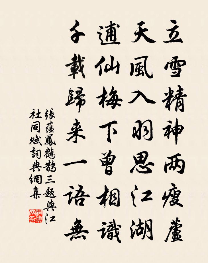 詩詞名句歷史字典書法欣賞書法字典國語詞典說文解字康熙字典古漢語字典標 題 作 者 詩 句 鳳鶴鵲三題與江社同賦作者:張蘊 朝代:宋代鳳鶴鵲三題與江社同賦原文立雪精神兩瘦蘆,天風入羽思江湖。逋仙梅下曾相識,千載歸來一語無。詩詞問答問:鳳鶴鵲三題與江社同賦的作者是誰?答:張蘊問:鳳鶴鵲三題與江社同賦寫於哪個朝代?答:宋代張蘊鳳鶴鵲三題與江社同賦書法欣賞鳳鶴鵲三題與江社同賦書法作品詩詞推薦大雨排悶陸游〔宋代〕地潤礎流水,氣蒸人脫裘。前知暴雨至,孰解老農憂?送鄭長史之嶺南(一本題作送鄭史)賈島〔唐代〕雲林頗重疊,岑渚復幽奇。汨水斜陽岸,騷人正則祠。蒼梧多蟋蟀,白露濕江蘺。擢第榮南去,晨昏近九疑。書蕭千岩集樂雷發〔宋代〕向來楊陸共崢嶸,吟到停雲趣轉清。古似洞庭張雅樂,嚴如即墨斂殘兵。茵蔯終不肥方朔,芣苡何堪病冉耕。細讀季冬自嵩山赴洛道中作獨孤及〔唐代〕皇運偶中變,長蛇食中土。天蓋西北傾,眾星隕如雨。胡塵動地起,千里聞戰鼓。死人成為阜,流血塗草莽。策馬觀曹壽卿上舍詩軸題其後陳棣〔宋代〕君詩字字敵雙南,直把驪珠取次探。李杜盟寒誰共主,曹劉機淺不須參。囊中句限緣多愛,天外心歸計飽諳。讀罷南軒獨坐余芑舒〔宋代〕往來都是由天造,妙處何須更我為。但向物初看老子,恍然身外有嬰兒。漁父四時曲春趙汝鐩〔宋代〕霽江浮春新水肥,粼粼鴨綠東風微。波心上下舴艋滑,釣車香餌卷落暉。纖鱗噞喁錦穿柳,半留賣錢半換酒。爛醉和耘老弟冬夜聞雨有懷虞儔〔宋代〕 * 睡思欲蒙蒙,珍重賢人酒一中。夜靜喜聽懸霤雨,寒多更怯戰窗風。檐花細落渾疑夢,詩句頻催政未工。雪擁顧城李倫〔唐代〕世久荒墟在,白雲幾代耕。市廛新草綠,里社故煙輕。不謹罹天討,來蘇豈忿兵。誰雲殷鑑遠,今古在人程。紹興以後蜡祭四十二首佚名〔宋代〕興獻恭莊,燎煙分酪。載陟載降,禮容可度。欽惟爾神,上下肅肅。成我稷黍,鑒此牲玉。冬至前月赴季父梅花之集與韓蒲向憲唐乾諸人胡寅〔宋代〕天寒袖薄竹光侵,溪轉橋橫草閣深。妃子定應來月窟,寧馨誰說是瑤林。顏開玉色春光滿,香動冰姿冷不禁。漫道報願慧長老寫師像求贊釋正覺〔宋代〕水秋而清,月寒而明。萬機休罷,三際齊平。塵消卻到法身住,幻起還從佛口生。長天之覆,大地之擎。諸祖與之題天台石橋趙湘〔唐代〕白石峰猶在,橫橋一徑微。多年無客過,落日有雲歸。水淨苔生髮,山寒樹著衣。如何方廣寺,千古去人稀。避方寇五絕鄭剛中〔宋代〕皇家休運正無疆,撼樹蚍蜉不自量。未作天街一杯血,暫憑山谷恣跳梁。答問游廬山日子董嗣杲〔宋代〕欲游廬山恨不遍,遊子先須兩腳健。山中浪走不知方,逢人問路空徬徨。人言五老山水窟,半是神仙半是佛。獨行聲聲慢張閣〔宋代〕長天霞散,遠浦潮平,危闌注目江皋。長記年年榮遇,同是今朝。金鑾兩回命相,對清光、頻許揮毫。雍容久,正砥柱四首范祖禹〔宋代〕禹開砥柱放河奔,濁浪軒軒日月昏。唯有三門君不見,驚波一起動乾坤。溪陰堂蘇軾〔宋代〕白水滿時雙鷺下,綠槐高處一蟬吟。酒醒門外三竿日,臥看溪南十畝陰。句司馬光〔宋代〕霜花錯節開。望夫山鄧剡〔宋代〕朝望夫,暮望夫,一夕化作山石枯。潮水去卻回,行人來不來。名句推薦荷葉生時春恨生,荷葉枯時秋恨成。李商隱《暮秋獨游曲江》 青春花姊不同時。淒涼生較遲。吳文英《醉桃源·芙蓉》 枯楊枯楊爾生稊,我獨七十而孤棲。李白《雉朝飛》 往年同在鸞橋上,見倚朱闌詠柳綿。韓偓《寒食日重遊李氏園亭有懷》 馬上牆頭,縱教瞥見,也難相認晁端禮《水龍吟·詠月》 曲終人醉。多似潯陽江上淚。朱敦儒《減字木蘭花·劉郎已老》 相看兩不厭,只有敬亭山。李白《獨坐敬亭山》 誰信多情道,相思漸覺詩狂少。吳綺《惜分飛·寒夜》 呵筆難臨帖,敲床且煮茶。大須《暮雪》 堂上謀臣尊俎,邊頭將士干戈辛棄疾《西江月其六》
