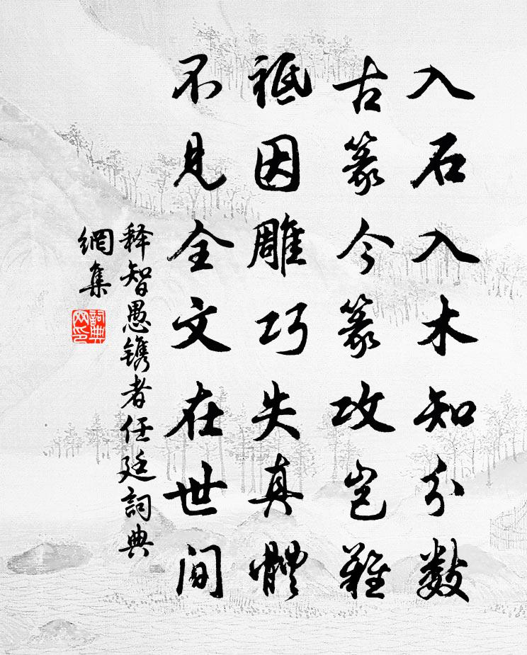 詩詞名句歷史字典書法欣賞書法字典國語詞典說文解字康熙字典古漢語字典標 題 作 者 詩 句 鐫者任廷作者:釋智愚 朝代:宋代鐫者任廷原文入石入木知分數,古篆今篆攻豈難。祗因雕巧失真體,不見全文在世間。詩詞問答問:鐫者任廷的作者是誰?答:釋智愚問:鐫者任廷寫於哪個朝代?答:宋代釋智愚鐫者任廷書法欣賞鐫者任廷書法作品詩詞推薦贈醫士詹翠峰熊禾〔宋代〕我觀卦氣先天圖,更參岐伯答問書。雖然三墳不可得,此即造化陰陽樞。超然便可會大道,學不至此應非儒。醫亦至鄂期年以饟事不給於詩己亥夏五廿有八日始岳珂〔宋代〕蕭蕭衰發倚西風,兩岸青山盡識儂。東去西來緣底事,只應添得一龍鍾。攤破浣溪沙/山花子賀鑄〔宋代〕錦韉未弦瑟瑟徽。玉纖新擬鳳雙飛。縹緲燭煙花暮暗,就更衣。約略整環釵影動,遲回顧步佩聲微。宛是春風胡蝶婆羅門引姬翼〔元代〕一毫不立,萬緣俱遣露真詮。沖虛躡景泠然。莫向他方物外,別覓洞中天。是韓*逐塊,陽焰為泉。亘初本源。只再和四首劉克莊〔宋代〕伏閣何其壯,登舟得許哀。人多稱快者,上豈少恩哉。惡草毋留種,夭桃不待媒。九重方遠佞,寧放鄭詹來。贊真覺像化姜布釋可湘〔宋代〕吃德山惡辣,耐同參逼拶。盪除露布葛藤,直得水底火發。阿刺刺,夫是之謂真覺菩薩。春夜陸游〔宋代〕客向燈前老,愁從枕上生。雨聲添好睡,花氣散餘酲。舊事談誰聽,新詩鏈不成。惟當速歸老,鄰父待同耕。閒居十首陳造〔宋代〕雪雲脫壞漏朝陽,風物橫前引興長。紅糝紫蕤今次第,遷鶯來燕費商量。溫泉宮鮑溶〔唐代〕憶昔開元天地平,武皇十月幸華清。山蒸陰火雲三素,日落溫泉雞一鳴。彩羽鳥仙歌不死,翠霓童妾舞長生。仍聞詩品二十四則·典雅司空圖〔唐代〕玉壺 * ,賞雨茆屋。坐中佳士,左右修竹。白雲初晴,幽鳥相逐。眠琴綠陰,上有飛瀑。落花無言,人淡如菊。獨樂園七題採藥圃司馬光〔宋代〕吾愛韓伯休,採藥賣都市。有心安可欺,所以價不二。如何彼女子,已復知姓字。驚逃入窮山,深畏名為累。詠桂呈張貳車劉黻〔宋代〕昨夜烽風吹作花,異香早已滿天涯。蓬萊深處兩三樹,風月分來第一家。綽約道妝如侍案,婆娑醉影欲乘槎。廣寒郴江百詠並序上仙閣阮閱〔宋代〕曲檻危梯紫翠中,蘇仙宅畔古城東。不須更著登山屐,萬岫千峰一日窮。上已日孫永〔宋代〕海內中和日,雲間已上辰。笙歌九天半,花木十洲春。桃花吳融〔唐代〕滿樹和嬌爛漫紅,萬枝丹彩灼春融。何當結作千年實,將示人間造化工。崇山圖七賢詩張嵲〔宋代〕短壑長松經始余,次山無往不從吾。便應掃盡陳蹤跡,摹作三溪少隱圖。贈裴迪王維〔唐代〕不相見,不相見來久。日日泉水頭,常憶同攜手。攜手本同心,復嘆忽分襟。相憶今如此,相思深不深。題龍陽縣青草湖唐溫如〔唐代〕西風吹老洞庭波,一夜湘君白髮多。醉後不知天在水,滿船清夢壓星河。竹齋二首王阮〔宋代〕一圍寒綠鎖城闉,中有茅檐更絕塵。千戶封侯千畝是,可憐燕頷虎頭人。早自偏門入城晚出南堰門以歸陸游〔宋代〕早從偏門入,暮從南堰歸。鮑郎山前路,空翠浮煙霏。秋令忽已深,病骨頻添衣。向來慕功名,常恐斯心違。乃今名句推薦魯女東窗下,海榴世所稀。李白《詠鄰女東窗海石榴》 禁里疏鍾官舍晚,省中啼鳥吏人稀。王維《酬郭給事 / 贈郭給事》 去年今日此門中,人面桃花相映紅。崔護《題都城南莊》 埋沒錢塘歌吹里,當年卻是皇都。魏大中《臨江仙·埋沒錢塘歌吹里》 惆悵東欄一株雪,人生看得幾清明。蘇軾《東欄梨花》 良辰當五日,偕老祝千年。權德輿《端午日禮部宿齋有衣服彩結之貺以詩還答》 深知身在情長在,悵望江頭江水聲。李商隱《暮秋獨游曲江》 君不肖,則國危而民亂,君賢聖則國安而民治,禍福在君不在天時。姜子牙《六韜·文韜·盈虛》 君問歸期未有期,巴山夜雨漲秋池。李商隱《夜雨寄北》 東風動百物,草木盡欲言。李白《長歌行》