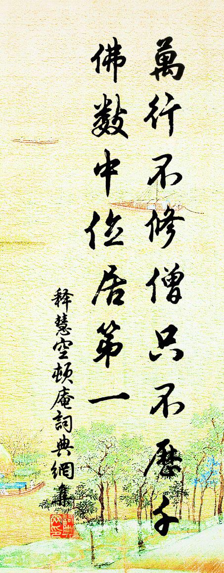 詩詞名句歷史字典書法欣賞書法字典國語詞典說文解字康熙字典古漢語字典標 題 作 者 詩 句 頓庵作者:釋慧空 朝代:宋代頓庵原文萬行不修,僧只不歷。千佛數中,位居第一。詩詞問答問:頓庵的作者是誰?答:釋慧空問:頓庵寫於哪個朝代?答:宋代釋慧空頓庵書法欣賞頓庵書法作品詩詞推薦峽路崔道融〔唐代〕清猿啼不住,白水下來新。八月莫為客,夜長愁 * 。送鄉中故人方乾〔唐代〕少小與君情不疏,聽君細話勝家書。如今若到鄉中去,道我垂鉤不釣魚。漁家傲(丁卯生日自作)郭應祥〔宋代〕去歲簿書叢里過。生朝也有人來賀。隨分侑尊呼幾個。胡廝和。愁顏鎮日何曾破。素髮如今添老大。歸來方是閒當書璿公房牡丹潘閬〔宋代〕寺中聞說牡丹花,多少人爭耳傍夸。潦倒參軍來看晚,數枝已謝病僧家酒渴愛江清韋莊〔唐代〕酒渴何方療,江波一掬清。瀉甌如練色,漱齒作泉聲。味帶他山雪,光含白露精。只應千古後,長稱伯倫情。次韻李參政和薛秘書詩見寄魏了翁〔宋代〕將相時來應不免,人生難得自由身。及今且續宋一藝,莫逐蟲魚注李巡。和宮怨羅公升〔宋代〕竹葉垂黃雨露偏,羞緣買賦費金錢。有緣會有承恩日,莫遣峨眉減去年。再次韻答完夫穆父(二公自言,先世同在西掖)蘇軾〔宋代〕掖垣老吏識郎君,並轡天街兩絕塵。汗血固應生有種,夜光那復困無因。豈知西省深嚴地,也著東坡病瘦身。免使山居雜詩九十首曹勛〔宋代〕真隱古招提,長林如磔蝟。雖有群山峰,所欠一支水。草木乏秀潤,岩竇燥肌理。安能借僧錫,卓處泉涌沸。秋夜對月王之道〔宋代〕青廓經新雨,扶疏桂影秋。夜涼山色靜,風細水光浮。坐久因忘寐,詩成得散愁。願言乘此興,同賦庾公樓。途中旅思二首鮑溶〔唐代〕喔喔雞鳴曉,蕭蕭馬辭櫪。草草名利區,居人少於客。生期三萬日,童耄半虛擲。修短命半中,憂歡復相敵。朝提玉華宮杜甫〔唐代〕溪回松風長,蒼鼠竄古瓦。不知何王殿,遺構絕壁下。陰房鬼火青,壞道哀湍瀉。萬籟真笙竽,秋色正蕭灑。美人嘲柳州柳子厚呂溫〔唐代〕柳州柳刺史,種柳柳江邊。柳管依然在,千秋柳拂天。和率齋王簾使三首劉鑒〔宋代〕試手東風第一杯,一番人物萃歐梅。曳裙昔憚王門峻,振鐸今逢孔席開。送酒馬軍江上去,持書驛使隴頭來。斯文立春蕭德藻〔宋代〕半夜新春入管城,平明銅雀綠苔生。浮澌把斷東風路,訴與青州借援兵。水調歌頭 壽王子壽,時年八十三王惲〔元代〕汾流*余潤,霜菊滿秋香。釀成一堂和氣,來薦老人觴。七十人生稀有,況復年逾八十,飲啖日康強。骯髒欲誰與和康節天意為人二吟王義山〔宋代〕鳥獸不可與同群,人道無虧方是人。已分工夫須盡我,學中本領在明倫。川雲意思乾坤外,杯酒襟懷天地春。識得送銅澤王歸城李端〔唐代〕昔聞公族出,其從亦高車。為善唯求樂,分貧必及疏。身承漢枝葉,手習魯詩書。尚說無功德,三年在石渠。林欽之主簿挽章姜特立〔宋代〕敬讀銘鐫語,遙知磊落胸。主襟如郭震,豪氣似元龍。萬里摧車軸,三春折澗松。天雖不可問,餘慶後人鍾。晚泊濟陽朱自牧〔金代〕江北秋陰一半晴,晚涼留與客襟清。水邊畫角孤城暮,雲底殘陽遠樹明。旅雁為誰來有信,斷蓬如我去無程。寥寥名句推薦無人解,樹轉午陰涼舒頔《小重山·端午》 木從繩則正,後從諫則聖。佚名《尚書·商書·說命上》 不登高山,不知天之高也;不臨深溪,不知地之厚也荀子《荀子·勸學》 夢裡不知身是客,一晌貪歡。李煜《浪淘沙令·簾外雨潺潺》 可惜重陽,不把黃花與。吳文英《蝶戀花·九日和吳見山韻》 得百姓之力者富,得百姓之死者強,得百姓之譽者榮。荀子《荀子·王霸》 即從巴峽穿巫峽,便下襄陽向洛陽。杜甫《聞官軍收河南河北》 婚姻勿貪勢家。顏之推《顏氏家訓·止足篇》 君在陰兮影不見,君依光兮妾所願。傅玄《車遙遙篇》 永豐西角荒園裡,盡日無人屬阿誰。白居易《楊柳枝二首》