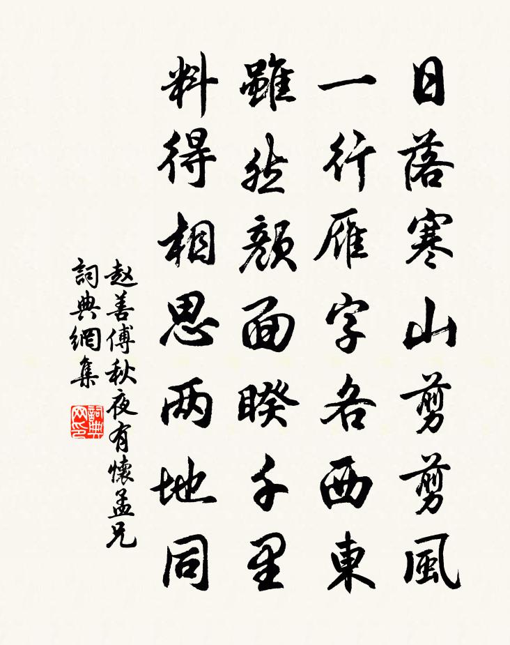 詩詞名句歷史字典書法欣賞書法字典國語詞典說文解字康熙字典古漢語字典標 題 作 者 詩 句 秋夜有懷孟兄作者:趙善傅 朝代:宋代秋夜有懷孟兄原文日落寒山剪剪風,一行雁字各西東。雖然顏面睽千里,料得相思兩地同。詩詞問答問:秋夜有懷孟兄的作者是誰?答:趙善傅問:秋夜有懷孟兄寫於哪個朝代?答:宋代趙善傅秋夜有懷孟兄書法欣賞秋夜有懷孟兄書法作品詩詞推薦雨霽晚眺(庚子年冬大駕幸蜀後作)韋莊〔唐代〕入谷路縈紆,岩巔日欲晡。嶺雲寒掃蓋,溪雪凍黏須。臥草跧如兔,聽冰怯似狐。仍聞關外火,昨夜徹皇都。滴水岩陳岩〔宋代〕點溜常穿石眼寒,蘚紋如繡不曾乾。山頭一滴曹溪水,山下人人仰面看。永寧里小園與沈校書接近,悵然題寄羊士諤〔唐代〕故里心期奈別何,手移芳樹憶庭柯。東皋黍熟君應醉,梨葉初紅白露多。海上懷華中舊遊寄鄭縣劉少府造、渭南王少府崟獨孤及〔唐代〕涼風台上三峰月, * 邊萬里沙。離別莫言關塞遠,夢魂長在子真家。黃鶴洞中仙 繼重陽韻 前後各喝馬一聲馬鈺〔元代〕癸卯到人間,本是非凡兔。因為玲瓏*下來,馬氏住。願再修行做。復遇害風仙,傳得深深趣。黃鶴洞中仙道成,征婦思徐照〔宋代〕年半為郎婦,郎去戍採石。又雲戍濠梁,不得真訊息。半年無信歸,獨自宋羅幃。西風吹妾寒,倩誰寄郎衣。姑老和子瞻泗州僧伽塔蘇轍〔宋代〕清淮濁汴爭強雄,龜山下閟支祁宮。高秋水來無遠近,盪滅洲渚乘城墉。千艘銜尾誰復惜,萬人雨泣哀將窮。城中高宗皇帝輓詞林栗〔宋代〕倉猝扶宗社,艱危啟聖神。英雄歸駕御,狂狡願和親。泛掃妖氛淨,恢張治化新。倦勤三紀外,頭白盡遺民。下橫山,灘頭望金華山四首楊萬里〔宋代〕道是蘭溪水較寬,蘭溪欲到怪生難。後船隻羨前船快,不覺前船閣在灘。懷烏山柏許僧宗文李呂〔宋代〕清風明月休論景,翠竹黃花不離禪。好個趙州關捩子,陶潛欲辯已忘言。祥符寺得句許必勝〔宋代〕安蔬自足慰平生,峰靜松閒澗水平。山意悟時僧不語,落花聲間梵音清。調笑令蘇軾〔宋代〕漁父。漁父。江上微風細雨。青蓑黃箬裳衣。紅酒白魚暮歸。歸暮。歸暮。長笛一聲何處。九月一日游昭亭丁復〔元代〕山色江光帶近郊,道旁楊柳舞寒條。半生九日黃花酒,多在西風白下橋。千里客游仍暮景,異鄉人事又今朝。老來落花三首廖行之〔宋代〕春深處處有花妍,已覺春工興浩然。投曉憑欄枝上看,飄零贏得舞容翩。謝惠詩張明中〔宋代〕君詩來貺我難當,語帶誠齋句妙香。鮫室垂垂新下泣,蠙珠顆顆爛生光。魂飛錦里花爭巧,夢到池塘草又芳。早晚李溪曲別鄭遇徐照〔宋代〕七十二灘聲共聞,一朝路向李溪分。梅花無情動春夢,未好憶家先憶君。和簡文帝賽漢高帝廟詩徐陵〔南北朝〕山宮類牛首。漢寢若龍川。玉盌無秋酎。金燈滅夜煙。丹帷迫靈岳。紺席下羣仙。堂虛沛築響。釵低戚舞妍。何殊贊三教圖釋法薰〔宋代〕警世昏,三老翁,服雖殊,心亦同。於中議優劣,蒿箭射虛空。五日滎陽郡王餉酒張鎡〔宋代〕閒中滋味諳來慣,懶費心情為節辰。丹篆但期詩崇出,紅泥俄見酒壺新。移船遣送隨魚信,洗盞開嘗對鶴賓。絕勝送談星辰許季升二首楊萬里〔宋代〕許子儒冠怨誤身,如今投筆說星辰。未須道我何時貴,且道何時子脫貧。名句推薦日暮蒼山遠,天寒白屋貧。劉長卿《逢雪宿芙蓉山主人》 燕子飛時,綠水人家繞。蘇軾《蝶戀花·春景》 重鑄鋤犁作斤,姑舂婦擔去輪官,輸官不足歸賣屋。元稹《田家詞 / 田家行》 桐花半畝,靜鎖一庭愁雨。周邦彥《瑣窗寒·寒食》 老至居人下,春歸在客先。劉長卿《新年作》 日長籬落無人過,惟有蜻蜓蛺蝶飛。范成大《四時田園雜興·其二》 洛陽城裡春光好,洛陽才子他鄉老。韋莊《菩薩蠻》 岳王祠畔,楊柳煙鎖古今愁。戴復古《水調歌頭·題李季允侍郎鄂州吞雲樓》 晝出耘田夜績麻,村莊兒女各當家。范成大《夏日田園雜興·其七》 林鶯啼到無聲處,青草池塘獨聽蛙。曹豳《春暮·門外無人問落花》