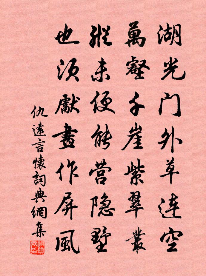詩詞名句歷史字典書法欣賞書法字典國語詞典說文解字康熙字典古漢語字典標 題 作 者 詩 句 言懷作者:仇遠 朝代:宋代言懷原文湖光門外草連空,萬壑千崖紫翠叢。縱未便能營隱墅,也須先畫作屏風。詩詞問答問:言懷的作者是誰?答:仇遠問:言懷寫於哪個朝代?答:宋代仇遠言懷書法欣賞言懷書法作品詩詞推薦螢唐彥謙〔唐代〕日下蕪城莽蒼中,濕螢撩亂起衰叢。寒煙陳後長門閉,夜雨隋家舊苑空。星散欲陵前檻月,影低如試北窗風。羈人奉和崔尚書贈大理陸卿鴻臚劉卿見示之作蘇頲〔唐代〕戲藻嘉魚樂,棲梧見鳳飛。類從皆有召,聲應乃無違。美價逢時出,奇才選眾稀。避堂貽後政,掃第發前幾。出曳送新平故人懷楚〔唐代〕常聽倉庚思舊友,又因蝴蝶夢生涯。一千餘里河連郭,三十六峰寒到家。陰島直分東虢雁,晴樓高入上陽鴉。姜嫄登烏江寶泉寺南山望金陵作賀鑄〔宋代〕我愛金陵望不厭,獨尋微逕躡晴嵐。柔桑淺草三月尾,踴塔飛樓一水南。苒苒流雲牽仿像,遲遲艷日助醺酣。何須魚遊春水張元乾〔宋代〕芳洲生萍芷。宿雨收晴浮暖翠。煙光如洗,幾片段預告飛點淚。清鏡空餘白髮添,新恨誰傳紅綾寄。溪漲岸痕,浪吞沙七夕朱繼芳〔宋代〕兒女穿針夜向分,樓頭月落尚爐薰。憑誰為覓機邊石,留取支床臥白雲。送清隱純老住池陽杉山曹勛〔宋代〕冥冥細雨綠陰齊,湛湛長江客去時。剔起眉毛欣應供,橫擔楖栗看來期。宴韋侍御新亭林滋〔唐代〕煙磴披青靄,風筵藉紫苔。花香凌桂醑,竹影落藤杯。鳴籟將歌遠,飛枝拂舞開。未愁留興晚,明月度雲來。酒鬍子盧注〔唐代〕同心相遇思同歡,擎出酒胡當玉盤。盤中臲卼不自定,四座清賓注意看。可亦不在心,否亦不在面,徇客隨時自圓沙彌付衣釋大觀〔宋代〕鷲嶺將何付飲光,十成綿密轉乖長。鄮峰恁么不恁么,尺線單比自短長。舟行即事二首張耒〔宋代〕去去路日遠,行行歲向深。晚田荒更闊,秋野曉多陰。岸蓼飛寒蝶,汀沙戲水禽。迎風蘆顫葉,眩日棗裝林。早蟹寄范石湖五首王阮〔宋代〕近來能辟千年谷,歸去非思一籌鱸。聊示維摩隱几相,要教獅子致文殊。送鄭鍊師貶辰州戎昱〔唐代〕辰州萬里外,想得逐臣心。謫去刑名枉,人間痛惜深。誤將瑕指玉,遂使謾消金。計日西歸在,休為澤畔吟。寄胡山甫舒岳祥〔宋代〕梅梢殘雨知頭數,溪上無風麥自青。遲子不來還獨臥,踏檐啼鳥喚入醒。浣沙溪汪莘〔宋代〕屬余賦詞。遂以此意賦之。二月初二夜白日青天蘸水開。落花江上玉鞭回。東君擎出牡丹來。獨占洛陽春氣足,遂念奴嬌·鬧紅一舸姜夔〔宋代〕余客武陵。湖北憲治在焉:古城野水,喬木參天。余與二三友,日蕩舟其間。薄荷花而飲,意象幽閒,不類人境。殘句槐花黃蘇軾〔宋代〕槐花黃,舉子忙;促織鳴,懶婦驚。送鄧侍郎劉克莊〔宋代〕追陪豹尾恰逾年,劉叟安能望鄧先。聖主憂賢勤召對,諸公祖道羨登仙。降庚寅歲雖相似,雌甲辰旬守自憐。風雨次商於感舊寄盧中丞蔣吉〔唐代〕昔年簪組隘丘門,今日旌幢一院存。何事商於淚如雨,小儒偏受陸家恩。三月望日微雨汎舟西湖四首張鎡〔宋代〕清明才過雨連風,著色湖山便面中。草上踏青人自出,艤船無地不飛紅。名句推薦笛中聞折柳,春色未曾看。李白《塞下曲六首·其一》 莫買沃洲山,時人已知處。劉長卿《送方外上人/送上人》 豈知民力艱,顆米皆琳琅。黃燮清《秋日田家雜詠》 言則稱於湯文,行則譬於狗豨。墨子《墨子·46章 耕柱》 一片春愁待酒澆。江上舟搖,樓上簾招。蔣捷《一剪梅·舟過吳江》 正是天山雪下時,送君走馬歸京師。岑參《天山雪歌送蕭治歸京》 命里無時,求之不來。馮夢龍《醒世恆言·卷十八》 萬里人南去,三春雁北飛。韋承慶《南中詠雁詩》 平皋行雁下,曲渚雙鳧出。崔元翰《奉和聖制重陽旦日百寮曲江宴示懷》 世間最難得者兄弟。程登吉《幼學瓊林·卷二·兄弟》