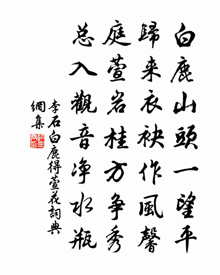 詩詞名句歷史字典書法欣賞書法字典國語詞典說文解字康熙字典古漢語字典標 題 作 者 詩 句 白鹿得萱花作者:李石 朝代:宋代白鹿得萱花原文白鹿山頭一望平,歸來衣袂作風馨。庭萱岩桂方爭秀,總入觀音淨水瓶。詩詞問答問:白鹿得萱花的作者是誰?答:李石問:白鹿得萱花寫於哪個朝代?答:宋代李石白鹿得萱花書法欣賞白鹿得萱花書法作品詩詞推薦送嚴黃門拜御史大夫再鎮蜀川兼覲省岑參〔唐代〕授鉞辭金殿,承恩戀玉墀。登壇漢主用,講德蜀人思。副相韓安國,黃門向子期。刀州重入夢,劍閣再題詞。春草元微之除浙東觀察使,喜得杭越鄰州,先贈長白居易〔唐代〕稽山鏡水歡游地,犀帶金章榮貴身。官職比君雖校小,封疆與我且為鄰。郡樓對玩千峰月,江界平分兩岸春。杭越次韻和縉叔游仲容西園二首蘇洵〔宋代〕春入禁城懷舊隱,偶來芳圃似還家。番番翠蔓纏松上,粲粲朱梅入竹花。客慢空勞嚴置兕,酒多無用早成蛇。相公夢睹梅堯臣〔宋代〕閉目光不揚,夢睹良亦審。既非由目光,所見定何稟。白日杳無朕,冥遇嘗在寢。此恨不可窮,悲淚空流枕。和皇太子梅詩二首楊萬里〔宋代〕清賞堂前隔俗塵,南枝得雪曉爭新。獨將卻月凌風影,攙獻儲皇第一春。吊友人墓林尚仁〔宋代〕樹陰雲影暗空山,銘石雖存不忍看。燒罷紙錢灰未冷,落花啼鴃雨聲寒。大字吟邵雍〔宋代〕詩成半醉正陶陶,更用如椽大筆抄。盡得意時仍放手,到凝情處略濡毫。魯陽卻日功猶淺,宗慤乘風志未高。寫出對仙華雪懷方鳳〔宋代〕仙華萬仞石離離,山上嶄嶄萬壑危。雪與梅花俱在望,琴攜野鶴轉相隨。清如和靖西湖夜,興如王猷剡上時。我欲江蘺生幽渚沈約〔南北朝〕澤蘭被荒徑。孤芳豈自通。幸逢瑤池曠。得與金芝叢。朝承紫台露。夕潤綠池風。既美修嫮女。復悅繁華童。夙昔頌古三首釋寶印〔宋代〕水因有月方知靜,天為無雲始覺高。獨坐孤峰休更問,此時難著一絲毫。千秋歲·苑邊花外黃庭堅〔宋代〕苑邊花外。記得同朝退。飛騎軋,鳴珂碎。齊歌雲繞扇,趙舞風回帶。岩鼓斷,杯盤狼藉猶相對。灑淚誰能會。醉示兒輩陸游〔宋代〕窮居懷抱久無懽,猶賴吾兒得少寬。謹視雞豚供老疾,力營薪炭備春寒。舊書綴緝編無絕,小瓮調停味不酸。坐使論語絕句一百首張九成〔宋代〕吾於萬理已無疑,何必容心更去推。自此有無皆不立,有知翻以累無知。隆興甲申仲冬回郡城宿龍泉寺遇雪孫應時〔宋代〕乘興登山寺,匆匆未暇歸。偶逢天色變,忽見雪花飛。佛屋渾迷瓦,僧房半掩扉。坐看青嶂老,一知透禪機。次韻酬陳判官見貽祖無擇〔宋代〕一篇為惠枉瑤封,疑是仙文自蕊宮。始信夫君才力大,居然天地入形籠。滿江紅(和呂居仁酬芮國瑞提刑)葛郯〔宋代〕家住苕西,小池映、青山一曲。翠深里、猿呼鶴應,短牆低屋。麥影離離翻翠浪,泉聲НН敲寒玉。怪夜來、有蟻乾明院門望江山懷淮陽城南步二首張耒〔宋代〕憶昨淮陽把酒,目前惟欠山林。江上雲岑千壘,何為特地愁心。論語絕句一百首張九成〔宋代〕試問如何是探湯,喻其漸入久無傷。顧於不善乃如此,深恐斯人志不剛。蓮盤莊納涼姚寬〔宋代〕密竹蔭回塘,陰陰小院涼。低回忘扇拂,獨自懶衣裳。弱蔓扶新綠,紅蕖並晚香。華胥愁不到,只在水雲鄉。次韻高子明投贈二首方回〔宋代〕中原從昔信多艱,尚有文才與古班。詩律規隨元好問,樂章雋永蔡蕭閒。要知精會神全處,須到聲銷色泯間。此話名句推薦日暖桑麻光似潑,風來蒿艾氣如薰。蘇軾《浣溪沙·軟草平莎過雨新》 若待得君來向此,花前對酒不忍觸。蘇軾《賀新郎·夏景》 待羔兒、酒罷又烹茶,揚州鶴。辛棄疾《滿江紅·和范先之雪》 多少新亭揮淚客,誰夢中原塊土。劉克莊《賀新郎·送陳真州子華》 未知鹿死誰手房玄齡《晉書·載記·第五章》 大道如青天,我獨不得出。李白《行路難三首》 美人卷珠簾,深坐顰蛾眉。李白《怨情》 彩舟雲淡,星河鷺起,畫圖難足。王安石《桂枝香·登臨送目》 賢路當廣而不當狹,言路當開而不當塞脫脫《宋史·列傳·卷一百七十六》 田舍清明日,家家出火遲。王建《寒食》
