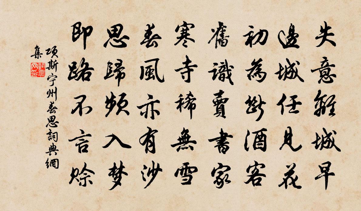 詩詞名句歷史字典書法欣賞書法字典國語詞典說文解字康熙字典古漢語字典標 題 作 者 詩 句 寧州春思作者:項斯 朝代:唐代寧州春思原文失意離城早,邊城任見花。初為斷酒客,舊識賣書家。寒寺稀無雪,春風亦有沙。思歸頻入夢,即路不言賒。詩詞問答問:寧州春思的作者是誰?答:項斯問:寧州春思寫於哪個朝代?答:唐代問:寧州春思是什麼體裁?答:五律項斯寧州春思書法欣賞寧州春思書法作品注釋全唐詩:卷554-6詩詞推薦壬申春寓舊館偃山房有感而作釋行海〔宋代〕舊館遲留春欲暮,小山林石帶平原。自憐萍跡隨流水,每到花時感故園。鳥啄雨牆紅落杏,蝶翻風砌綠抽萱。十年驀山溪(次李伯紀梅花韻)李彌遜〔宋代〕沖寒山意,未放江頭樹。老去恨春遲,數花期、朝朝暮暮。疏英冷蕊,也為有情忙,深夜月,小庭中,絕勝西城路畏虎行劉黻〔宋代〕於菟伏林薄,樵者遠斤斧。寧甘骨肉飢,毋蹈爪牙苦。山居聚落消,十室九閉戶。形影自相吊,祝神為驅禍。獸毒虞神/虞神歌佚名〔宋代〕復土初。明旌下儲胥。回虛仗,簫笳互奏,旌旆隨驅。豈知飈御在蓬壺。道縈紆。風日慘、六馬躊躇。留恨滿山隅送張郎中副使赴澤潞姚合〔唐代〕曉陌事戎裝,風流粉署郎。機籌通變化,除拜出尋常。地冷饒霜氣,山高礙雁行。應無離別恨,車馬自生光。觀李思訓幸蜀圖朱翌〔宋代〕上青天路最崎嶇,藏日擎天卻有餘。既驗六龍行萬里,始知一卒當千夫。望雲騅穩無前馬,帶雨鈴鳴動屬車。縱有挽張子由母陳傅良〔宋代〕又是君王上玉卮,未央雨露湛垂垂。版輿此去還無恙,芝檢重來更不疑。四世團欒能有幾,百年澌盡亦堪悲。里中和西湖即席三首舒坦〔宋代〕四明太守愛西湖,想像桃源舊日圖。不放塵埃生水面,為傳風月到皇都。花開別嶼千機錦,稻熟僯田萬斛珠。聞說過景空寺故融公蘭若(或作過潛上人舊房、悼正弘禪師)孟浩然〔唐代〕池上青蓮宇,林間白馬泉。故人成異物,過客獨潸然。既禮新松塔,還尋舊石筵。平生竹如意,猶掛草堂前。溪庵十首劉克莊〔宋代〕挾冊相從只一童,林間終日飽松風。小窗面野容山入,曲甽分溪與沼通。定有裔孫尋遠祖,盡教智叟笑愚翁。絕憐感遇之十一陳子昂〔唐代〕吾愛鬼谷子。青溪無垢氛。囊括經世道。遺身在白雲。七雄方龍斗。天下久無君。浮榮不足貴。遵養晦時文。舒可喜晴曹彥約〔宋代〕醉入機緘喜不勝,幾多風雨一番晴。掃除氛祲乾坤大,拂度光輝日月明。萬計官逋紓吏責,十分燈夕看人情。熙熙武興解舟華岳〔宋代〕西風落日楚江頭,秋水已平鸚鵡洲。煙樹接天迷送旆,浪花翻雪噴行舟。三杯萬事我已飽,一日千里誰能留。見說鷓鴣天佚名〔宋代〕遇酒當歌酒滿斟。一觴一詠樂天真。三杯五盞陶情性,對月臨風自賞心。環列處,總佳賓。歌聲繚亮遏行雲。春風宿柳池松風亭李曾伯〔宋代〕軋軋肩輿上劍門,春和身健快於奔。風翻紅雨摧芳信,山帶青煙入燒痕。鄰略物華無好句,破除旅思有清樽。高人明發窄溪晚次嚴州楊萬里〔宋代〕夕照落帆烏石灘,朝來解纜窄溪邊。篙師好語君知否,一日風行兩日船。墨花(並敘)蘇軾〔宋代〕世多以墨畫山水竹石人物者,未有以畫花者也。汴人尹白能之,為賦一首。造物本無物,忽然非所難。花心起墨暈寄社中劉黻〔宋代〕暗壁寒螿聚夜愁,孤燈相憶話綢繆。雁來不接西風字,又見黃花老卻秋。禪人並化主寫真求贊釋正覺〔宋代〕白髮蒼顏,三篾住山。開眼不覺曉,靜坐不知閒。善應全機用,靈明入道環。而今相伴塵中去,榆葉青錢莫我慳。湛溪納涼陳文蔚〔宋代〕昌處皆炎熱,澄江消客憂。相邀讀書罷,同作浴沂游。自喜坐茂樹,誰能喚小舟。月華如有待,先在柳桃頭。名句推薦一心以為有鴻鵠將至,思援弓繳而射之,雖與之俱學,弗若之矣。孟子《孟子·告子章句上·第九節》 蓼岸荻花中,隱映竹籬茅舍。張昪《離亭燕·一帶江山如畫》 念去去,千里煙波,暮靄沉沉楚天闊。柳永《雨霖鈴·寒蟬淒切》 浮雲不共此山齊,山靄蒼蒼望轉迷韓翃《宿石邑山中》 隨風潛入夜,潤物細無聲。杜甫《春夜喜雨》 柴門寂寂黍飯馨,山家煙火春雨晴。貫休《春晚書山家屋壁二首》 又似賈客蜀道間,千鐸萬磬鳴空山牛殳《琵琶行》 古台搖落後,秋日望鄉心。劉長卿《秋日登吳公台上寺遠眺》 江亭暇日堪高會,醉諷離騷不解愁邊貢《午日觀競渡》 舉大事必有所資李大師、李延壽《南史·列傳·卷五十三》
