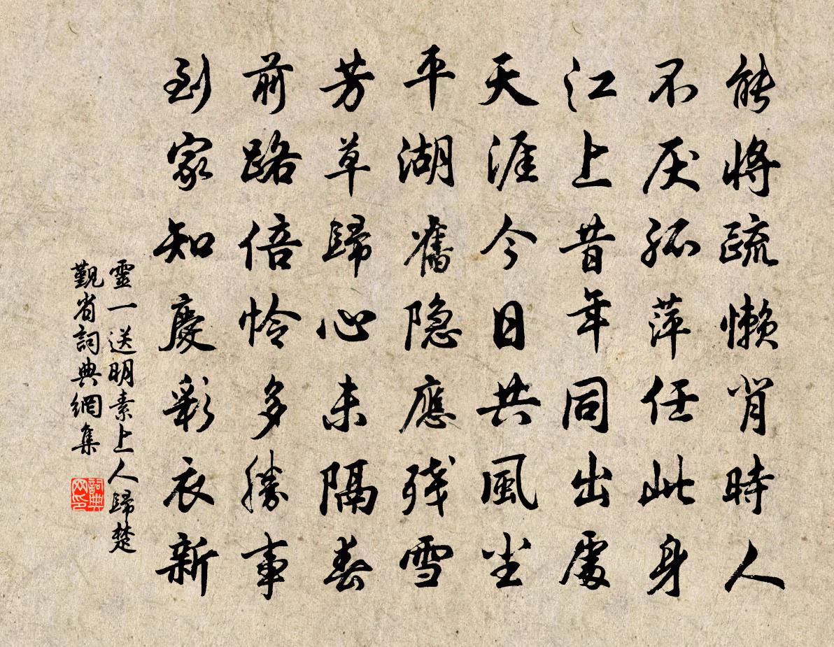 詩詞名句歷史字典書法欣賞書法字典國語詞典說文解字康熙字典古漢語字典標 題 作 者 詩 句 送明素上人歸楚覲省作者:靈一 朝代:唐代送明素上人歸楚覲省原文能將疏懶背時人,不厭孤萍任此身。江上昔年同出處,天涯今日共風塵。平湖舊隱應殘雪,芳草歸心未隔春。前路倍憐多勝事,到家知慶彩衣新。詩詞問答問:送明素上人歸楚覲省的作者是誰?答:靈一問:送明素上人歸楚覲省寫於哪個朝代?答:唐代問:送明素上人歸楚覲省是什麼體裁?答:七律靈一送明素上人歸楚覲省書法欣賞送明素上人歸楚覲省書法作品注釋全唐詩:卷809-23詩詞推薦鹽角兒歐陽修〔宋代〕增之太長,減之太短,出群風格。施朱太赤,施粉太白,傾城顏色。慧多多,嬌的的。天付與、教誰憐惜。除非我如夢令張孝祥〔宋代〕花葉相遮相映。雨過翠明金潤。折得一枝歸,滿路清香成陣。風韻。風韻。寄贈綺窗雲鬢。博古齋郭印〔宋代〕撐腸萬卷書,不知何處著。寄語腐唇人,於茲宜領略。離富池望廬岳是日入夾口直達潯陽遂舍大江之張耒〔宋代〕山秀江清三百里,與君三宿一扁舟。飲殘桑落溪雲暮,臥冷桃笙楚雨秋。舟隱長江逢夾口,眼明五老立雲頭。幾年冬日雜興趙蕃〔宋代〕憒憒若有失,岑岑殊未佳。枯藜茅屋靜,高枕竹窗斜。冬日誰雲短,吾生幸有涯。薰爐微結篆,茗盌細浮花。春日雜詩六首張耒〔宋代〕三月行復至,青春坐侵尋。飛花去寂寂,新葉來駸駸。白日照芳草,荒園亂鳴禽。朱顏任自老,安事累吾心。廣西漕屬呂君祖平以其六世祖文靖公及五世伯周必大〔宋代〕世臣本非喬木,故笏真是甘棠。奕葉鈞樞翰墨,寶章何愧諸王。送碼碯石屏朱復之〔宋代〕削出雲岑一片奇,天然玉瑩澤如脂。祗堪棐几旁邊看,頗與文房輩行宜。香篆自縈黃奶卷,飛花不點墨卿池。粗官諸友遲留待雪再用韻李曾伯〔宋代〕護風須飲劇,待雪拚眠遲。舉席俱佳客,揮毫盡好詩。冷薌梅畔覺,清響竹間知。莫憶征鞍夢,從渠月下支。菩薩蠻(和子有韻)洪咨夔〔宋代〕翠翹花艾年時昨。斗新五采同心索。含笑祝千秋。長眉如莫愁。流光旋磨蟻。換調重拈起。深院竹和絲。皺紅裁舞何處難忘酒十首王令〔宋代〕何處難忘酒,窮才世不知。出門無直道,開口礙當時。白髮無端速,青山不忍期。此時無一盞,何以慰憂思。登姑蘇台李嘯軒〔宋代〕規模高敞俯城池,未必斯台是故基。風月只招人感慨,江山不管國興衰。幾年勾踐仇思復,終日吳王醉不知。卻使十三四時嘗從巫峽過他日偶然有思沈佺期〔唐代〕小度巫山峽,荊南春欲分。使君灘上草,神女館前雲。樹悉江中見,猿多天外聞。別來如夢裡,一想一氛氳。迷仙引關詠〔宋代〕春陰霽。岸柳參差,裊裊金絲細。畫閣晝眠鶯喚起。煙光媚。燕燕雙高,引愁人如醉。慵緩步,眉斂金鋪倚。嘉景趙妹自鹹陽寄華州石縫山芋來作絕句二首晁說之〔宋代〕秦中歡喜迎吾祖,知道官家不用兵。今日曾孫何所負,華山芋蕷自多情。定風波元好問〔金代〕何處如今更有詩。爭教風鬢見橫枝。詩到梅邊誰最似。除是。玉顏寂寞酒清時。為向雲間公子道。聞早。安排歡賞再成古詩釋重顯〔宋代〕霜花一鑷中,玉童摘未摘。斯言如不聞,千古動愁色。因憶商山吟,在烏如在白。韓季默主簿聽雨齋葛紹體〔宋代〕一片雲陰帶日長,落花飛處燕泥香。耕畦桑塢年年事,萬點春聲夜對床。桂隱紀詠靜賞亭張鎡〔宋代〕皂隸百輕肥,金朱彈丸篋。君方踞胡床,風掀緗冊葉。雲際贈施子劉子翬〔宋代〕驚沙慘澹連雲起,曳杖悲歌行復止。春城是處聞鼓鼙,好風依舊開桃李。對花惆悵忽逢君,把酒無歡如啜水。六年名句推薦方慚不耕者,祿食出閭里。韋應物《觀田家》 南風知我意,吹夢到西洲。佚名《西洲曲》 秋色冷並刀,一派酸風卷怒濤。陳維崧《南鄉子·邢州道上作》 潭州官舍暮樓空,今古無端入望中。李商隱《潭州》 松花釀酒,春水煎茶。張可久《人月圓·山中書事》 世態便如翻覆雨,妾身元是分明月。文天祥《滿江紅·和王夫人滿江紅韻以庶幾後山妾薄命之意》 雲無心以出岫,鳥倦飛而知還。陶淵明《歸去來兮辭·並序》 可憐青冢已蕪沒,尚有哀弦留至今。王安石《明妃曲二首》 天地之性,人為貴。 人之行,莫大於孝。孔子及其弟子《孝經·聖治》 僵臥孤村不自哀,尚思為國戍輪台。陸游《十一月四日風雨大作》