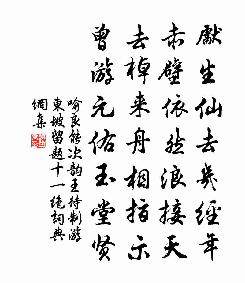 詩詞名句歷史字典書法欣賞書法字典國語詞典說文解字康熙字典古漢語字典標 題 作 者 詩 句 次韻王待制游東坡留題十一絕作者:喻良能 朝代:宋代原文先生仙去幾經年,赤壁依然浪接天。去棹來舟相指示,曾游元佑玉堂賢。詩詞問答問:《次韻王待制游東坡留題十一絕》的作者是誰?答:喻良能問:該詩寫於哪個朝代?答:宋代書法欣賞次韻王待制游東坡留題十一絕書法作品詩詞推薦次韻原仲幽居劉子翬〔宋代〕貴賤營營各有求,柴門晝掩靜幽幽。讀書無效空千卷,學稼雖勤少一丘。感慨舊余王粲賦,棲遲今仙長卿游。幔亭曉行胡天游〔清代〕夢闌鶯喚穆陵西,驛吏催時雨拂衣。行客落花心事別,無端俱趁曉風飛。偈釋廣燈〔宋代〕休休休,徒悠悠。釣竿長在手,魚冷不吞鉤。茶陳東〔宋代〕偏愛君家碧玉盤,建溪雲腳未嘗乾。書生自恨無金換,聊以詩章乞數團。春日五首楊時〔宋代〕一番微雨一番晴,淡淡春容照眼明。庭外幽花自開落,飛揚無處覓殘英。夜夢遇老人於松石間若舊嘗從其游者再拜敘間陸游〔宋代〕遼海曾從化鶴丁,百年塵土污巾瓶。萬山深處遇行李,再拜起時如醉醒。綠樹岩前開藥笈,白驢背上指丹經。雲霄次韻張公遠二首張耒〔宋代〕襄王坐上微詞客,子建車前步水妃。瞥過低鬟流盼處,爭先含笑獨來時。東邊日下終無雨,闕上書時合有碑。腸斷梁三朝雅樂歌 雍雅 一沈約〔南北朝〕明明在上。其儀有序。終事靡諐。收鉶撤俎。乃升乃降。和樂備舉。天德莫違。人謀是與。敬行禮達。茲焉燕語。漸水范成大〔宋代〕黃流日夜向南風,道出封丘處處逢。紫蓋黃旗在湖海,故應河伯欲朝宗。一枝花何希堯〔唐代〕幾樹晴葩映水開,亂紅狼藉點蒼苔。東風留得殘枝在,為惜余芳獨看來。瑪瑙坡楊蟠〔宋代〕石徑先光怪,傳流瑪瑙坡。天人曾布地,此物至今多。觀棋小吟邵雍〔宋代〕誰言博奕尚優遊,利害相磨未始休。初得手時宜顧望,合行權處菲遲留。二年乃正三監罪,七日能屍兩觀囚。天下古芳林苑馬之純〔宋代〕昔日曾為府署來,誰人都把插桃栽。不聞華屋笙簫響,但見工林錦繡堆。幾度劉郎來觀里,半年阮客住天台。如今巫山高羅隱〔唐代〕下壓重泉上千仞,香雲結夢西風緊。縱有精靈得往來,狖軛鼯軒亦顛隕。嵐光雙雙雷隱隱,愁為衣裳恨為鬢。暮灑魯中送魯使君歸鄭州韓翃〔唐代〕城中金絡騎,出餞沈東陽。九月寒露白,六關秋草黃。齊謳聽處妙,魯酒把來香。醉後著鞭去,梅山道路長。次韻子瞻好頭赤蘇轍〔宋代〕沿邊壯士生食肉,小來騎馬不騎竹。翩然赤手挑青絲,捷下巔崖試深谷。牽入故關榆葉赤,未慣中原暖風日。黃金懿安皇太后輓歌詞許渾〔唐代〕陵前春不盡,陵下夜何窮。未信金蠶老,先驚玉燕空。挽移蘭殿月,笳引柏城風。自此隨龍馭,橋山翠靄中。送王伯奮守筠陽樓鑰〔宋代〕三槐名德萃清門,七葉為州賴有君。道院無忘山谷賦,郡齋當繼潁濱文。君應膝上憐文度,我向東床憶右軍。振起梅花滕岑〔宋代〕欲尋好句乞梅花,從實平章不要夸。且道色香誰可比,只才擬議即成差。和張秀才落花有感李商隱〔唐代〕晴暖感餘芳,紅苞雜絳房。落時猶自舞,掃後更聞香。夢罷收羅薦,仙歸敕玉箱。迴腸九回後,猶有剩迴腸。名句推薦啼鶯舞燕,小橋流水飛紅。白樸《天淨沙·春》 以眾擊寡,利以清晨;強弩長兵,利以捷次諸葛亮《將苑·卷二·便利》 涼葉蕭蕭散雨聲,虛堂淅淅掩霜清。元好問《秋懷》 暗室虧心,神目如電。徐田臣《戲文·殺狗記》 江東子弟今雖在,肯與君王卷土來?王安石《疊題烏江亭》 人迷洞庭水,雁度瀟湘煙。李白《郢門秋懷》 君子遺人以財,不若善言。佚名《孔子家語·六本》 迴廊四合掩寂寞,碧鸚鵡對紅薔薇。李商隱《日射》 遠送從此別,青山空復情。杜甫《奉濟驛重送嚴公四韻》 一切賢聖,皆以無為法而有差別。鳩摩羅什譯《金剛經·無得無說》