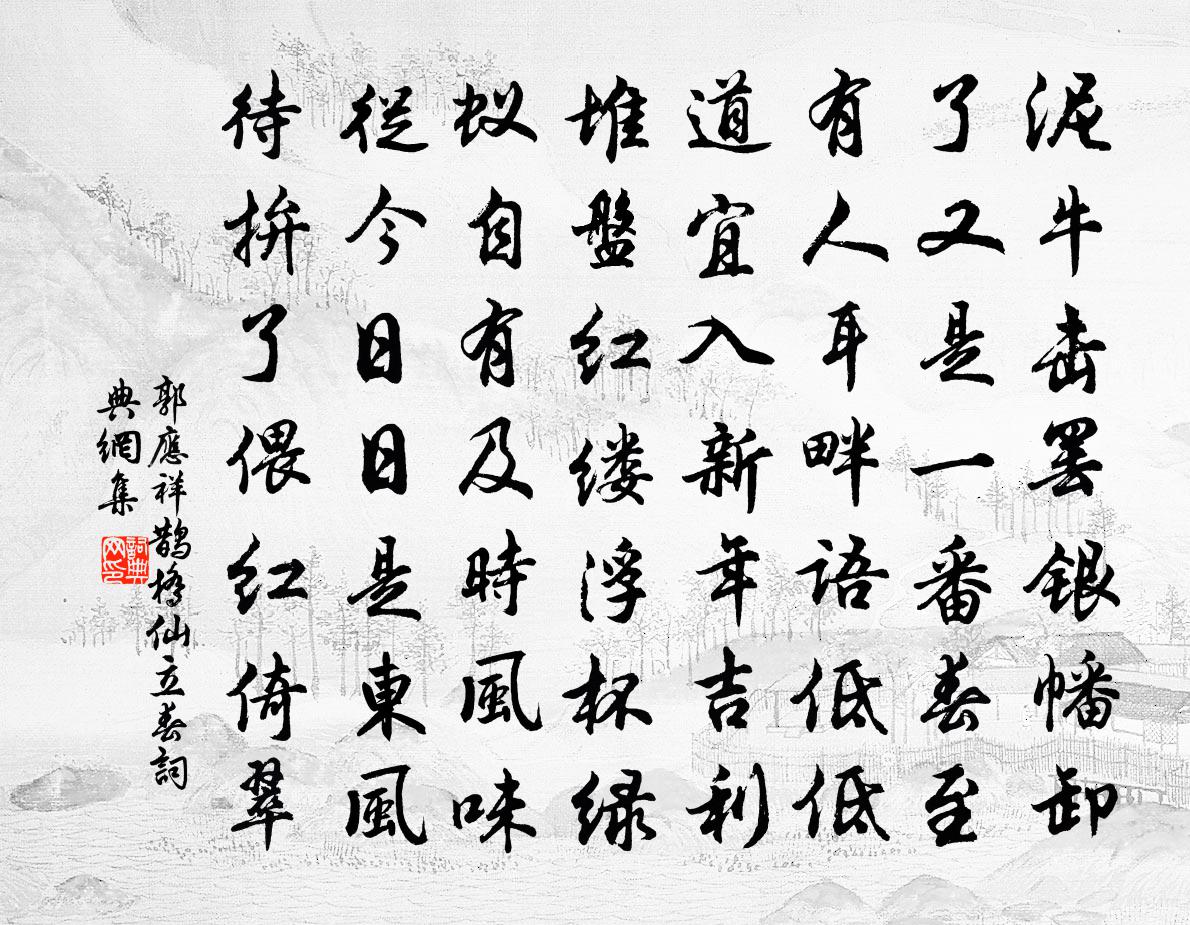 詩詞名句歷史字典書法欣賞書法字典國語詞典說文解字康熙字典古漢語字典標 題 作 者 詩 句 鵲橋仙(□□立春)作者:郭應祥 朝代:宋代鵲橋仙(□□立春)原文泥牛擊罷,銀幡卸了,又是一番春至。有人耳畔語低低,道宜入、新年吉利。堆盤紅縷,浮杯綠蟻,自有及時風味。從今日日是東風,待拚了、偎紅倚翠。詩詞問答問:鵲橋仙(□□立春)的作者是誰?答:郭應祥問:鵲橋仙(□□立春)寫於哪個朝代?答:宋代問:鵲橋仙(□□立春)是什麼體裁?答:詞郭應祥鵲橋仙(□□立春)書法欣賞鵲橋仙(□□立春)書法作品詩詞推薦江上偶見絕句杜牧〔唐代〕楚鄉寒食橘花時,野渡臨風駐彩旗。草色連雲人去住,水紋如縠燕差池。華下宗澤〔宋代〕千岩層出亂雲飛,失我平生洞府期。夜據征鞍不交睫,舉頭彈指睡希夷。偈頌二首釋思業〔宋代〕勘破婆子,而青眼黑。趙州老漢,瞞我不得。戚氏王哲〔元代〕凍雲昌。出入繚邈遍舒張。直上玄凝,滿空濃密,現嘉祥。六花妥瑤芳。輕飛緩舞瓷飄*。須臾漸漸俱縞,物物因溫泉李呂〔宋代〕陰陽分二氣,鈞播立萬物。泉脈或寒溫,初非擇地出。依韻酬葛秋岩陶體四首釋文珦〔宋代〕吾生一無營,終日衡門下。棲遲已成東,豈羨台與榭。相彼常汲汲,而我獨多暇。時聽蜾祝兒,於以知物化。暗香吳潛〔宋代〕及歌酒其下,今荒矣。園乃歐公記、君謨書,古今稱二絕。猶憶其詞云:高甍巨桷,水光日影,動搖而下上,其寬牡丹二首(此後並是校書郎以前作)元稹〔唐代〕簇蕊風頻壞,裁紅雨更新。眼看吹落地,便別一年春。繁綠陰全合,衰紅展漸難。風光一抬舉,猶得暫時看。金門寺中見李西台與二錢唱和四絕句,戲用其蘇軾〔宋代〕西台妙跡繼楊風,無限龍蛇洛寺中。一紙清詩吊興廢,塵埃零落梵王宮。玄牝頌周無所住〔宋代〕萬物芸芸,各歸其根。識得根源,玄牝虛傳。浪淘沙劉禹錫〔唐代〕莫道讒言如浪深,莫道遷客似沙沉。千淘萬漉雖辛苦,吹盡狂沙始到金。秦門。趙高周曇〔唐代〕趙高胡亥速天誅,率土興兵怨毒痡。豐沛見機群小吏,功成兒戲亦何殊。和吳微明疏影橫斜水清淺七詠韻李呂〔宋代〕碧澗潺潺暮山紫,閉關危坐心如水。窗間微見一枝橫,鼻觀得香尤可喜。【中呂】快活三過朝天子胡祗遹〔元代〕賞春梨花白雪飄,杏艷紫霞消。柳絲舞困小蠻腰,顯得東風惡。野橋,路迢,一弄兒春光鬧。夜來微雨灑芳郊,綠上元日駕回登樓二首張耒〔宋代〕長街十二遠相通,閶闔峨峨彩霧紅。天白華燈交皓月,樓寒朱幕盪春風。車頭笑語歸時醉,城下傳呼夜向中。自古油紙燈二首賈似道〔宋代〕頭圓腿壯遍身黃,翅滑如油肉帶蒼。牙鉗一對如紅色,此物蟲中是霸王。梅林分韻得作字呂商隱〔宋代〕一樹知獨秀,十里方出郭。江流浩清冷,露氣凝淒薄。胡為此行色,疲馬外踴躍。玄冥正擅令,植物困搖落。喜見書生舊夢二解皆因榜過作陳杰〔宋代〕一著當機已百全,落枰忽誤豈非天。空函墮甑都休惋,赤壁淮淝本偶然。水館鄭獬〔宋代〕繞舍清流淙碧玉,塵懷開闊洒然醒。窗欞風入秋氣活,橋腳倒撐天面青。露濕風標紅芰老,雨生鱗甲伏龍腥。將書送趙判官赴黔府中丞叔幕李白〔唐代〕廓落青雲心,結交黃金盡。富貴翻相忘,令人忽自曬。蹭蹬鬢毛斑,盛時難再還。巨源咄石生,何事馬蹄間?綠蘿名句推薦提出西方白帝驚,嗷嗷鬼母秋郊哭。李賀《春坊正字劍子歌》 不辭山路遠,踏雪也相過。張九齡《答陸澧》 風乍暖,日初長,裊垂楊。陳子龍《訴衷情·春遊》 璇室群酣夜,璜溪獨釣時。劉基《題太公釣渭圖》 千里之馬時一有,其利緩;駑馬日售,其利急。韓非及後人《韓非子·說林下》 口言之,身必行之。墨子《墨子·48章 公孟》 雷雨窈冥而未半,皦日籠光於綺寮。左思《三都賦》 宿醉離愁慢髻鬟,六銖衣薄惹輕寒,慵紅悶翠掩青鸞韓偓《浣溪沙·宿醉離愁慢髻鬟》 葉落當歸根,雲沉久必起。錢嶫《憫黎詠》 照野瀰瀰淺浪,橫空隱隱層霄。蘇軾《西江月·頃在黃州》