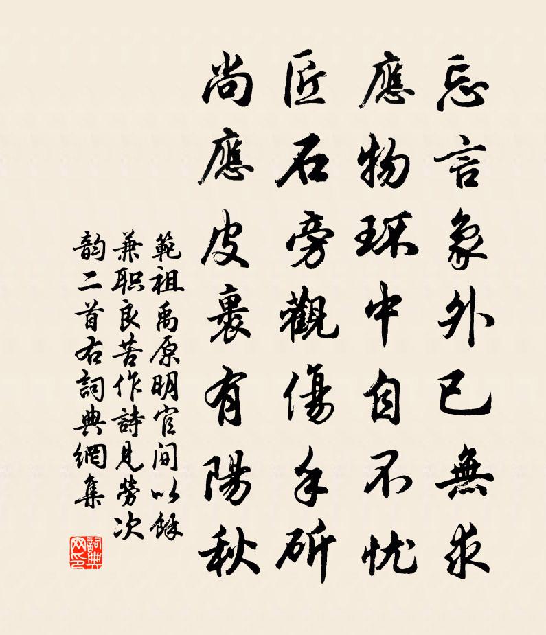 詩詞名句歷史字典書法欣賞書法字典國語詞典說文解字康熙字典古漢語字典標 題 作 者 詩 句 原明官間以余兼職良苦作詩見勞次韻二首右作者:范祖禹 朝代:宋代原文忘言象外已無求,應物環中自不憂。匠石旁觀傷手斫,尚應皮裹有陽秋。詩詞問答問:《原明官間以余兼職良苦作詩見勞次韻二首右》的作者是誰?答:范祖禹問:該詩寫於哪個朝代?答:宋代書法欣賞原明官間以余兼職良苦作詩見勞次韻二首右書法作品詩文賞析【原題】:原明官間以余兼職良苦作詩見勞次韻二首·右原明詩詞推薦和子瞻濠州七絕其五虞姬墓蘇轍〔宋代〕布叛增亡國已空,摧殘羽翮自令窮。艱難獨與虞姬共,誰使西來敵沛公。綿州錄參廳觀姜楚公畫鷹少陵為作詩者陸游〔宋代〕我來訪古涪之濱,不辭百岡冀一真。走馬朝尋海棕館,斫膾夜醉魴魚津。越王高樓亦已換,俯仰今古堪悲辛。督郵寄劉孝若徐照〔宋代〕難得劉夫子,生平極愛予。有時吟好句,特地到貧居。遠別寧無恨,平安莫問書。夢穿庭際菊,密葉過畦蔬。題何茂宏茂恭林堂喻良能〔宋代〕華堂閟林樾,林秀水泉甘。野色袁家渴,秋聲鈷鉧潭。二難今有此,四者許誰參。他日承明直,懸知憶翠嵐。新桃行張籍〔唐代〕桃生葉婆娑,枝葉四向多。高未出牆顛,蒿莧相凌摩。植之三年餘,今年初試花。秋來已成實,其陰良已嘉。青蟬偶書鄭剛中〔宋代〕何時見池館,一二佳友生。酣飲入深夜,竹間燈火明。弋陽陸行趙蕃〔宋代〕細雨濕籃輿,渺渺穿翠楚。林園知秋近,已作西風語。昨朝汗浹背,今晨冷侵膂。感慨悟乘除,人生幾寒暑。觀范陽遞俘儲光羲〔唐代〕北河旄星隕,鬼方獮林胡。群師舞弓矢,電發歸燕墟。皇皇軒轅君,贊贊皋陶謨。方思壯軍實,遠近遞生俘。車馬傷蔡處士楊衡〔唐代〕篋中遺草是琅玕,對此令人灑淚看。三徑尚疑行跡在,數螢猶自映書殘。晨光不借泉門曉,暝色空添隴樹寒。欲問贈閭丘相士文天祥〔宋代〕急流勇退識真臞,昔有 * 撥地爐。我亦愛君雲水趣,莫言雷雨趄江湖。用徐編修德夫韻其開藩旴江二首王邁〔宋代〕君侯心事即蒼冥,諤諤曾同唯唯爭。醫國奇方留後用,字民好事及今行。懸知夔卨班難繼,且入龔黃傳亦榮。天誘九日送人司空曙〔唐代〕送人冠獬豸,值節佩茱萸。均賦征三壤,登車出五湖。水風淒落日,岸葉颯衰蕪。自恨塵中使,何因在路隅。卜運算元劉克莊〔宋代〕自入玄門戶,寂寂清虛做。靜里披搜四假身,勘破塵行路。悟上還重悟,得得真閒趣。收住身中無價真,豈逐人情擬古於石〔宋代〕東籬有佳菊,埋沒野草傍。草蔓日以滋,菊苗日以荒。生意幾欲息,菊短草何長。深秋嚴霜下,百草不復芳。采采送湯相守紹興二十韻周必大〔宋代〕漢辟蕭居守,周興畢保厘。安危元注想,中外自隨時。憶昨生戎馬,誰知死佛貍。天其永我命,王乃大巡師。收拾遣興次韻和晁應之四首張耒〔宋代〕夜泛孤舟清洛津,宓妃輕步若為親。清涵星漢光垂地,冷覺魚龍氣近人。鏡里悲秋雙鬢髮,馬邊隨客兩京塵。愁心萬花川谷海棠盛開,進退格楊萬里〔宋代〕四面周遭國艷叢,危亭頓在艷叢中。天開錦幄三千丈,日透紅妝一萬重。積雨乍晴偏楚楚,東風小緩莫匆匆。為花虞美人孫光憲〔五代〕紅窗寂寂無人語,暗淡梨花雨。繡羅紋地粉新描,博山香炷旋抽條,睡魂銷。天涯一去無訊息,終日長相憶。教人芝產之五日有雙蓮生於東池亟往視之出水已二郭印〔宋代〕岐麥嘉禾兆慶符,同莖合乾復芙蕖。鋪張偉績吾曹事,苦恨無才可屢書。明日分弓亭按閱,再用西樓韻范成大〔宋代〕眼看白 * 蒼苔,歲月飛流首屢回。老去讀書隨忘卻,醉中得句若飛來。聞雞午夜猶能舞,射雉西郊不用媒。自笑名句推薦繁飾有命,以教眾愚朴之人。墨子《墨子·36章 非命(中)》 無人知此意,歌罷滿簾風。陳與義《臨江仙·高詠楚詞酬午日》 相見情已深,未語可知心。李白《相逢行二首》 千錘萬鑿出深山,烈火焚燒若等閒。于謙《石灰吟》 佳人彩雲里,欲贈隔遠天。李白《折荷有贈》 知君仙骨無寒暑。蘇軾《木蘭花令·次馬中玉韻》 我家洗硯池邊樹,朵朵花開淡墨痕。王冕《墨梅》 不虛美,不隱惡司馬光《資治通鑑·唐紀·唐紀十三》 曉霧將歇,猿鳥亂鳴;陶弘景《答謝中書書》 光景不勝閨閣恨,行行坐坐黛眉攢。閻選《八拍蠻·雲鎖嫩黃煙柳細》