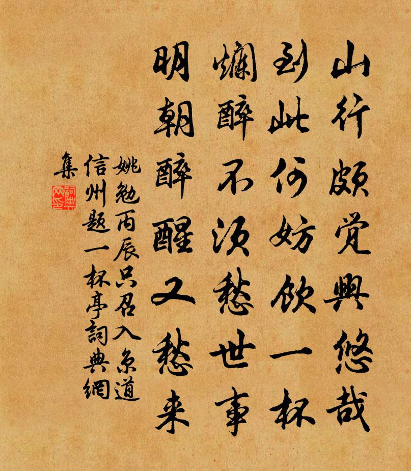 詩詞名句歷史字典書法欣賞書法字典國語詞典說文解字康熙字典古漢語字典標 題 作 者 詩 句 丙辰只召入京道信州題一杯亭作者:姚勉 朝代:宋代原文山行頗覺興悠哉,到此何妨飲一杯。爛醉不須愁世事,明朝醉醒又愁來。詩詞問答問:《丙辰只召入京道信州題一杯亭》的作者是誰?答:姚勉問:該詩寫於哪個朝代?答:宋代書法欣賞丙辰只召入京道信州題一杯亭書法作品詩詞推薦句王隨〔宋代〕綠陰連野幾株柳,翠靄繞城無限山。紅梅陳景沂〔宋代〕色異味同失主張,厭寒附暖逐群芳。當知不改冰霜操,戲學陶家艷冶妝。梅花潘牥〔宋代〕柴門盡日少蹄輪,坐對橫窗數點春。心向雪中偏暴白,影來月下亦精神。十分洗盡鉛華相,百劫修來貞潔身。笑殺挽梁丹隱丘葵〔宋代〕受用伯陽書,萬緣都覺虛。達官直桎梏,大夏即籧篨。世謂求仙妄,誰知是道余。臨終為土解,何必淚盈裾。偈釋悟本〔宋代〕乾闥婆王曾奏樂,山河大地皆作舞。爭如跛腳老雲門,解道臘月二十五。【中呂】普天樂關漢卿〔元代〕崔張十六事(十六首)普救姻緣西洛客說姻緣,普救寺尋方便。佳人才子,一見情牽。餓眼望將穿,饞口涎空咽。哭方碧山前惠州同知方回〔宋代〕同宗多兩歲,官學幸同門。去夏才相別,逾旬遽□□。□□淹逆旅,公已見曾孫。二子言將葬,驚嗟欲斷魂。送楊少尹赴滿城張籍〔唐代〕官為本府當身榮,因得還鄉任野情。自廢田園今作主,每逢耆老不呼名。舊遊寺里僧應識,新別橋邊樹已成。公事慶長叔招飲一桮,未釂,雪聲璀然。即席走筆楊萬里〔宋代〕長廊盡處繞梅行,過盡風聲得雪聲。醉里不愁飄濕面,自舒翠袖點瓊英。答陳五進士遺山水枕屏梅堯臣〔宋代〕妙畫能成趣,溪山迥得君。漁舟長映浦,岩樹半藏雲。征雁無時沒,橫橋有處分。數峰來枕席,曾不愧移文。強氏母楊維楨〔元代〕強氏母,毗陵人,年已八十又一春。強家郎,未七旬,五十入官教邑民,六十轉官在鄰郡。大府婉畫方諮詢,守將新樂府馬逢〔唐代〕溫谷春生至,宸游近甸榮。雲隨天上轉,風入御筵輕。翠蓋浮佳氣,朱樓依太清。朝臣冠劍退,宮女管弦迎。觀橘花鄭剛中〔宋代〕漸看綠葉秋來密,是愛輕花露未晞。何日增枝充素里,為渠臨酒脫金衣。臘月二十八日與知宗提舉分歲郡中啜茶於北樓陽枋〔宋代〕老病逾年臥晉江,耽詩性癖未能降。園林牢落梅經眼,歲月崢嶸酒滿缸。堂上焚香敬勛德,樓頭回首念家鄉。黃柑次韻傅子文絕句陳與義〔宋代〕風雨門前十日泥,荒街相伴只筇枝。從今老子都無事,落盡園花不賦詩。會真詩三十韻元稹〔唐代〕微月透簾櫳,螢光度碧空。遙天初縹緲,低樹漸蔥蘢。龍吹過庭竹,鸞歌拂井桐。羅綃垂薄霧,環佩響輕風。絳節竹李復〔宋代〕園竹三年種,今春綠始稠。未知能卻暑,但愛不悲秋。影補頹垣缺,枝多暮翼留。近因開小徑,時有客相投。企疏堂曾幾〔宋代〕薌林未置身,泛宅先入手。二疏歸來時,能似今日否。午日處州禁競渡湯顯祖〔明代〕獨寫菖蒲竹葉杯,蓬城芳草踏初回。情知不向甌江死,舟楫何勞吊屈來。少年游杜安世〔宋代〕小樓歸燕又黃昏。寂寞鎖高門。輕風細雨,惜花天氣,相次過春分。畫堂無緒,初燃絳蠟,羅帳掩餘薰。多情不解名句推薦北風其涼,雨雪其雱。佚名《北風》 日照香爐生紫煙,遙看瀑布掛前川。李白《望廬山瀑布》 湖上春既早,田家日不閒。丘為《題農父廬舍》 每恨蟪蛄憐婺女,幾回嬌妒下鴛機,今宵嘉會兩依依。毛文錫《浣溪沙·七夕年年信不違》 新竹高於舊竹枝,全憑老乾為扶持。鄭燮《新竹》 向來吟秀句,不覺已鳴鴉。韓翃《酬程延秋夜即事見贈》 日照新妝水底明,風飄香袂空中舉。李白《採蓮曲》 轅門菊酒生豪興,雁塞風雲愜壯遊。王瓊《九日登花馬池城》 不是花中偏愛菊,此花開盡更無花。元稹《菊花》 不責人小過,不發人陰私,不念人舊惡洪應明《菜根譚·概論》