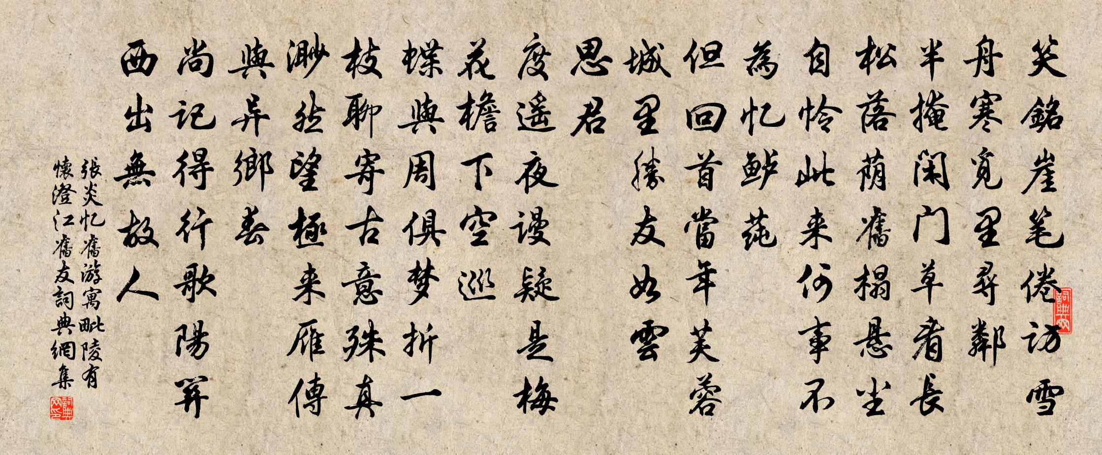 笑銘崖筆倦,訪雪舟寒,覓里尋鄰。半掩閒門草,看長松落蔭,舊榻懸塵。